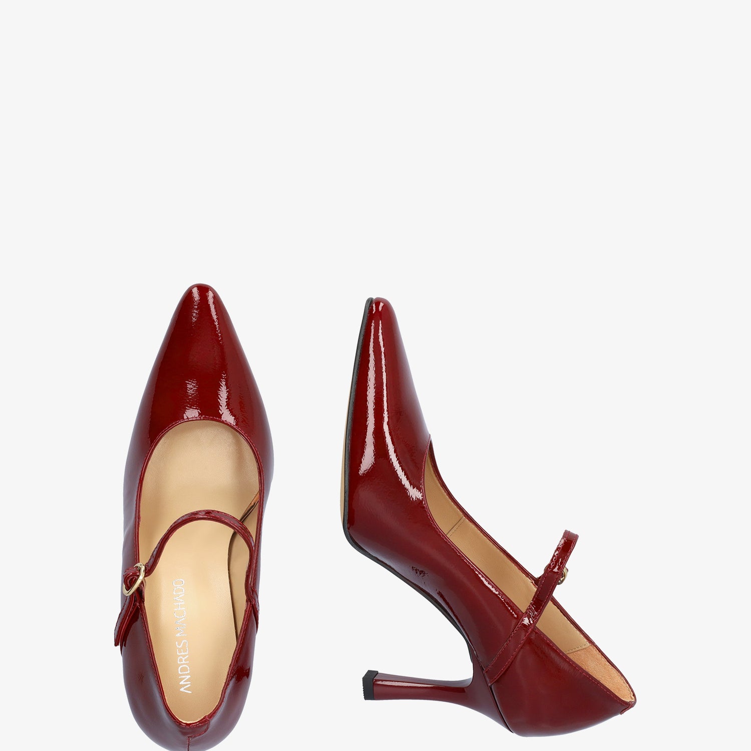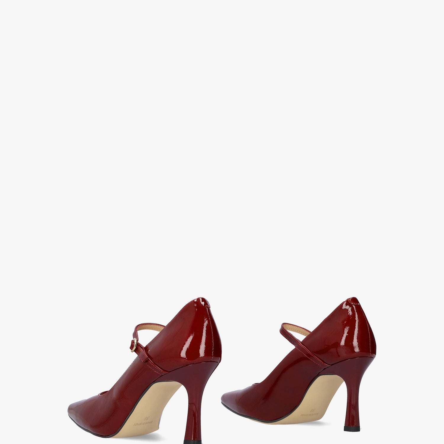 Escarpins en cuir verni bordeaux avec doublure intérieure en cuir et bout pointu. Ils sont dotés d`une bride sur le cou-de-pied avec une boucle métallique latérale. Le talon fin bourdeaux a une hauteur de 8,5 cm pour les petites pointures du 32 au 35 et de 9,5 cm pour les grandes pointures du 42 au 45. Fabriqués en Espagne.