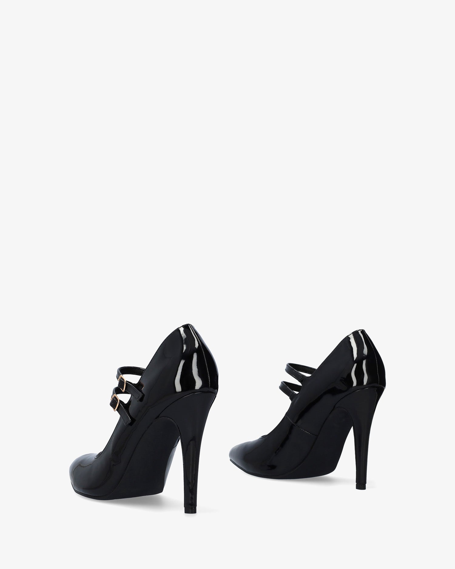 Escarpins style Mary Jane à bout pointu avec deux fines brides à boucle sur le cou-de-pied. Talon de 10 cm pour les petites pointures (32 à 35) et de 12 cm pour les grandes pointures (42 à 46).