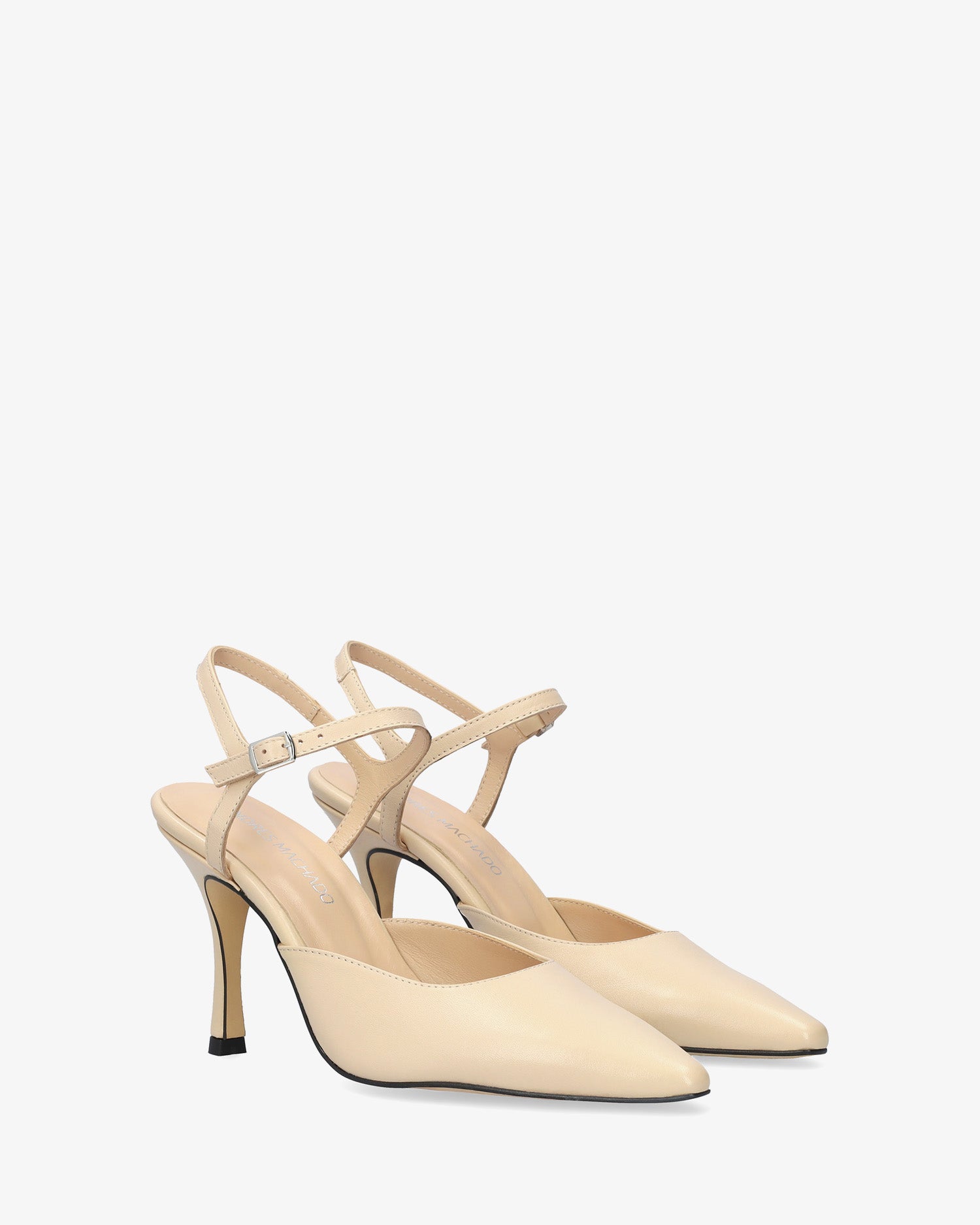Escarpins ouverts en cuir. Fermeture par bride cheville avec boucle et bout pointu. Talon recouvert ton sur ton de 8,5 cm pour les petites pointures (32 à 35) et de 10,5 cm pour les grandes pointures (42 à 45). Fabriqués en Espagne.