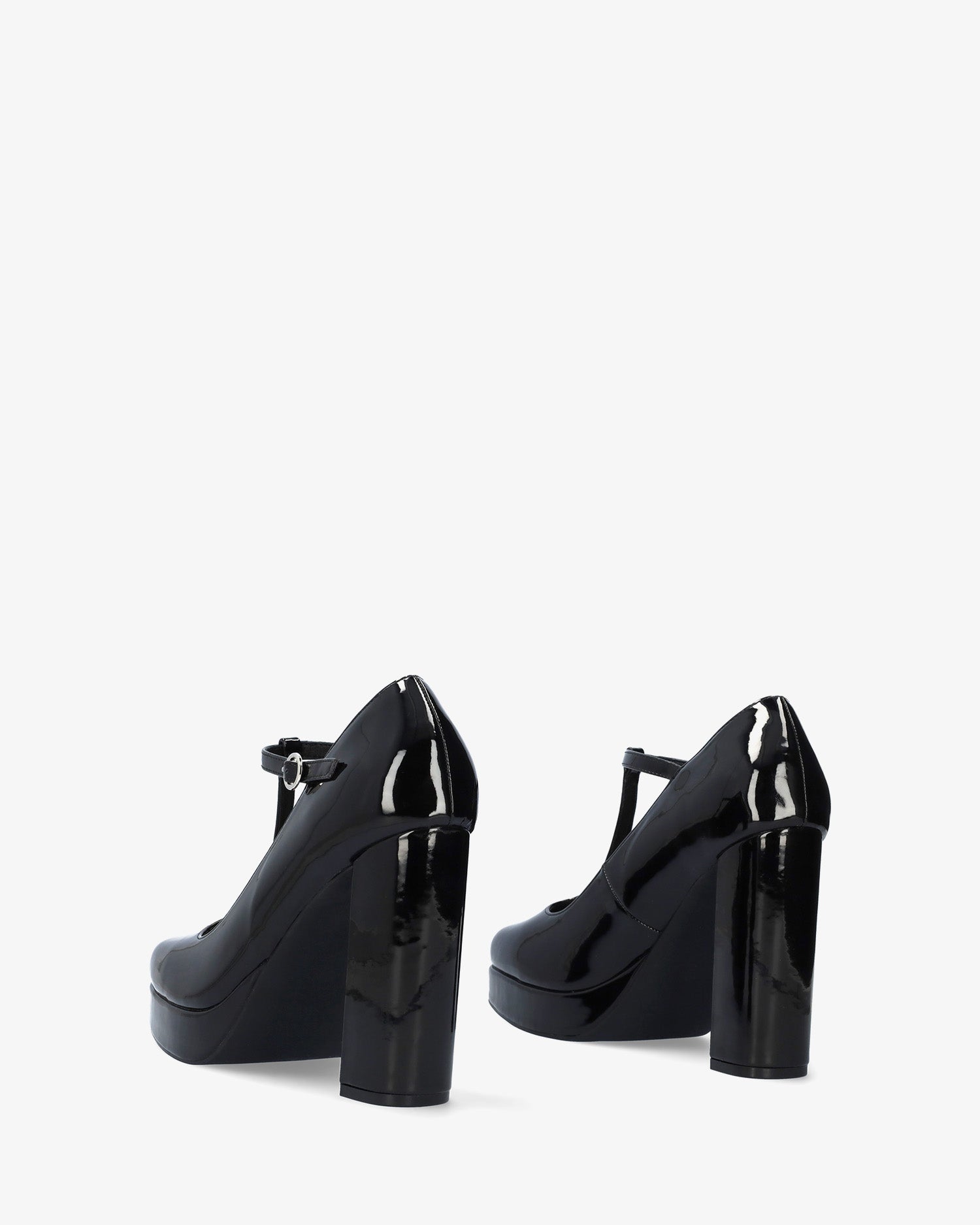 Escarpins style Salomé à bout carré, avec bride centrale en T inversé sur le cou-de-pied. Talons de 11 cm et plateforme de 2 cm pour les petites pointures du 32 au 34, et talons de 12,5 cm avec plateforme de 2,5 cm pour les grandes pointures du 42 au 45.