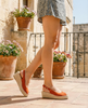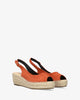 Espadrille compensée avec large bride à l’avant et deux brides reliées par une boucle métallique. Talon ouvert. Bout ouvert et arrondi.