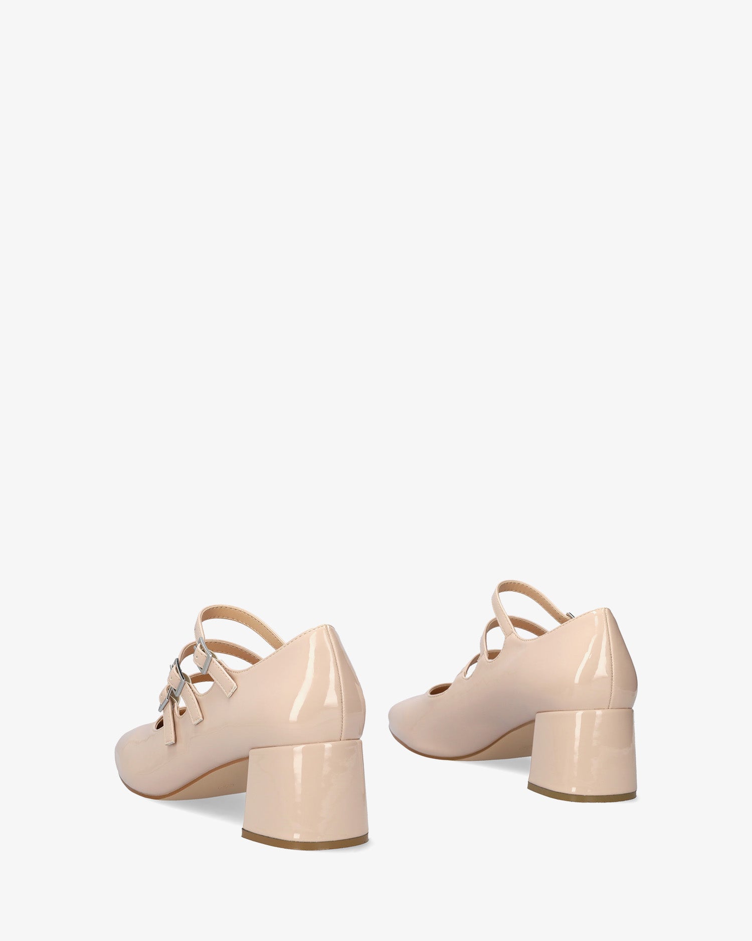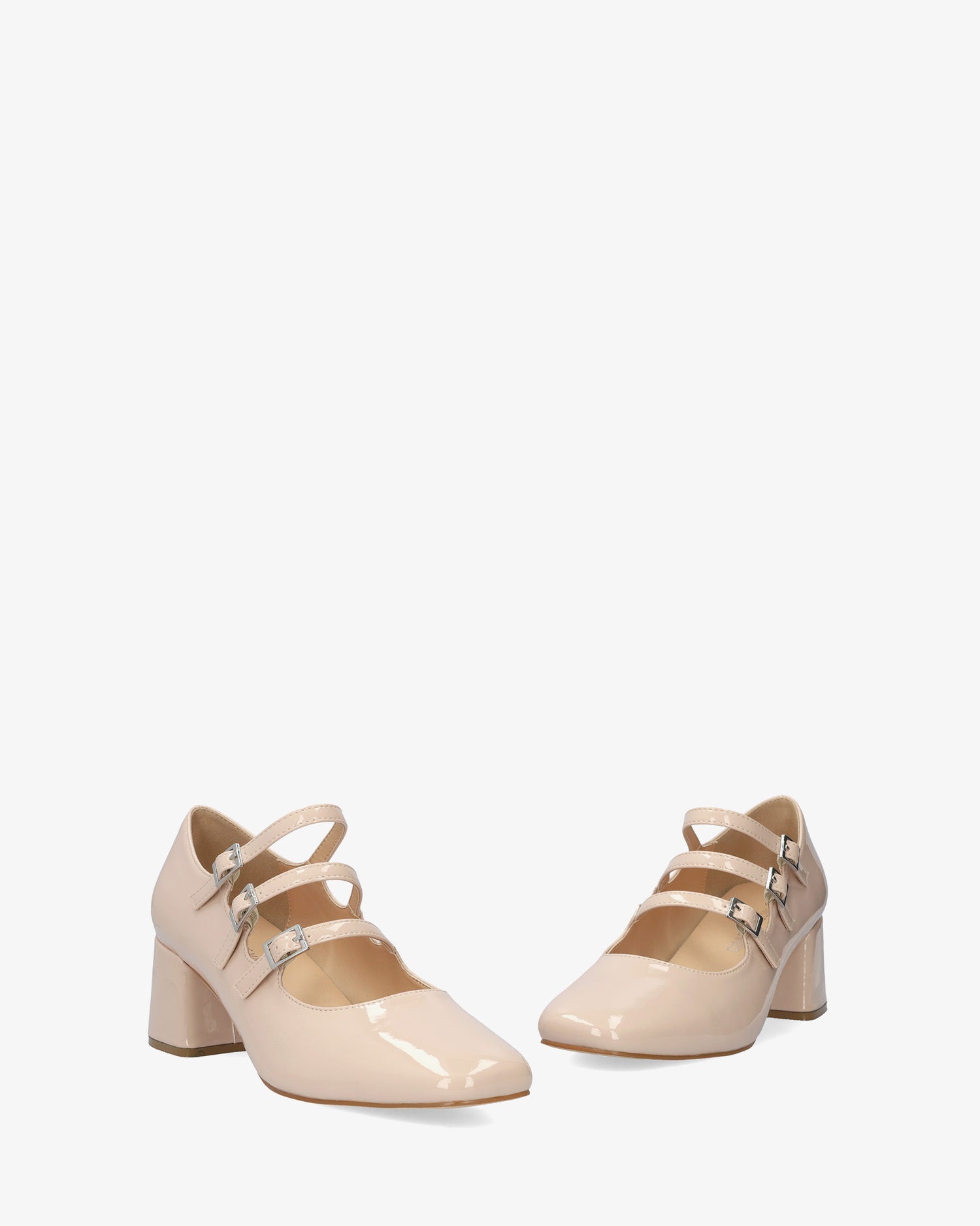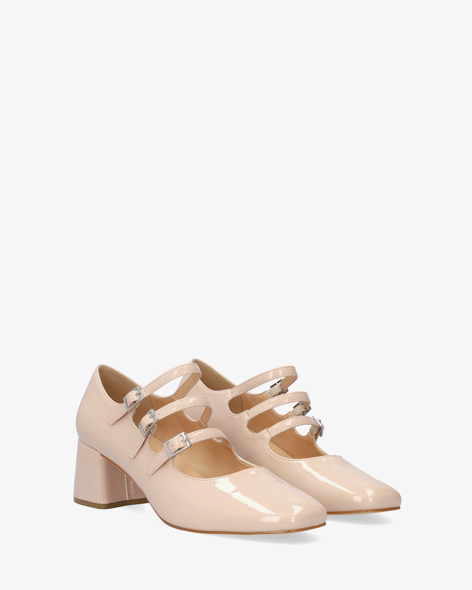 Chaussures style Mary Jane à bout carré avec trois brides sur le cou-de-pied et boucle métallique latérale ton sur ton. Talons doublés en vernis. Talons larges de 5,5 cm pour les petites pointures (32 à 35) et de 6 cm pour les grandes pointures (42 à 46).