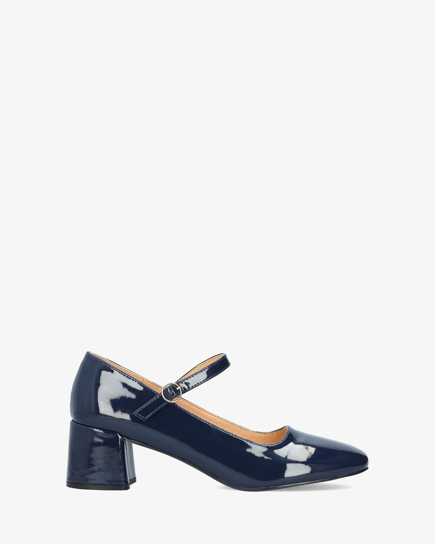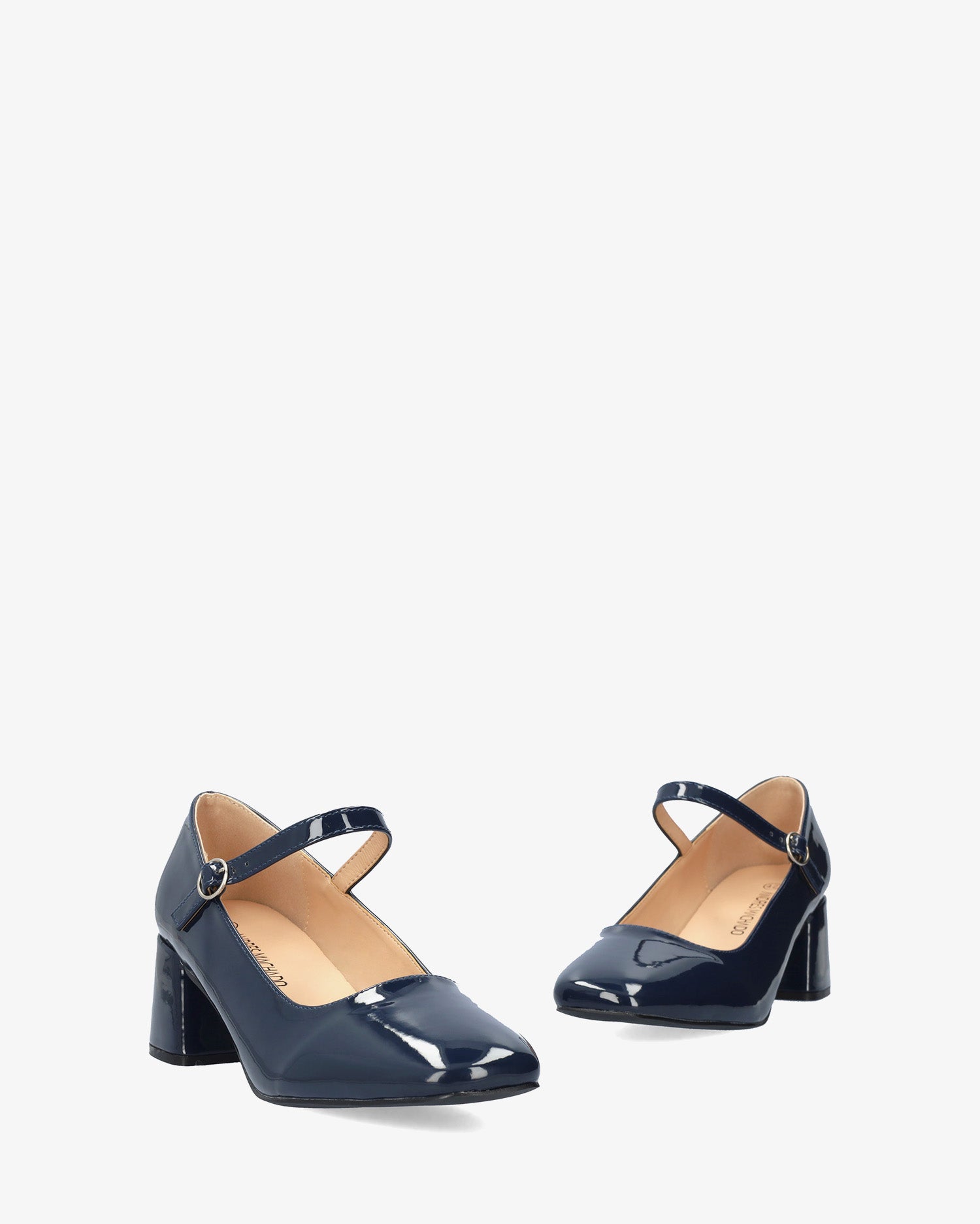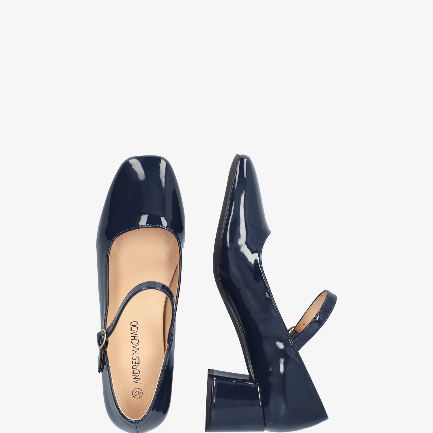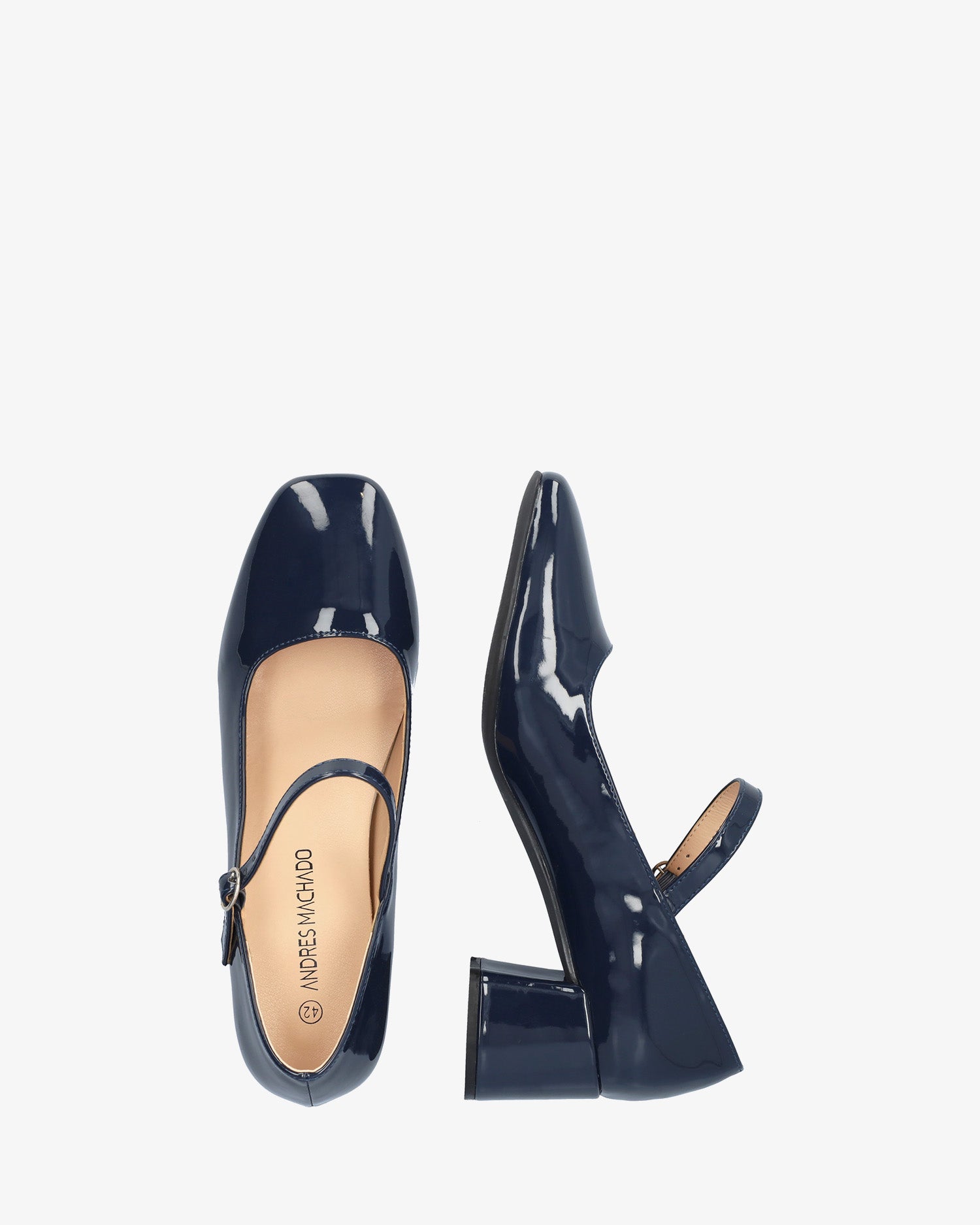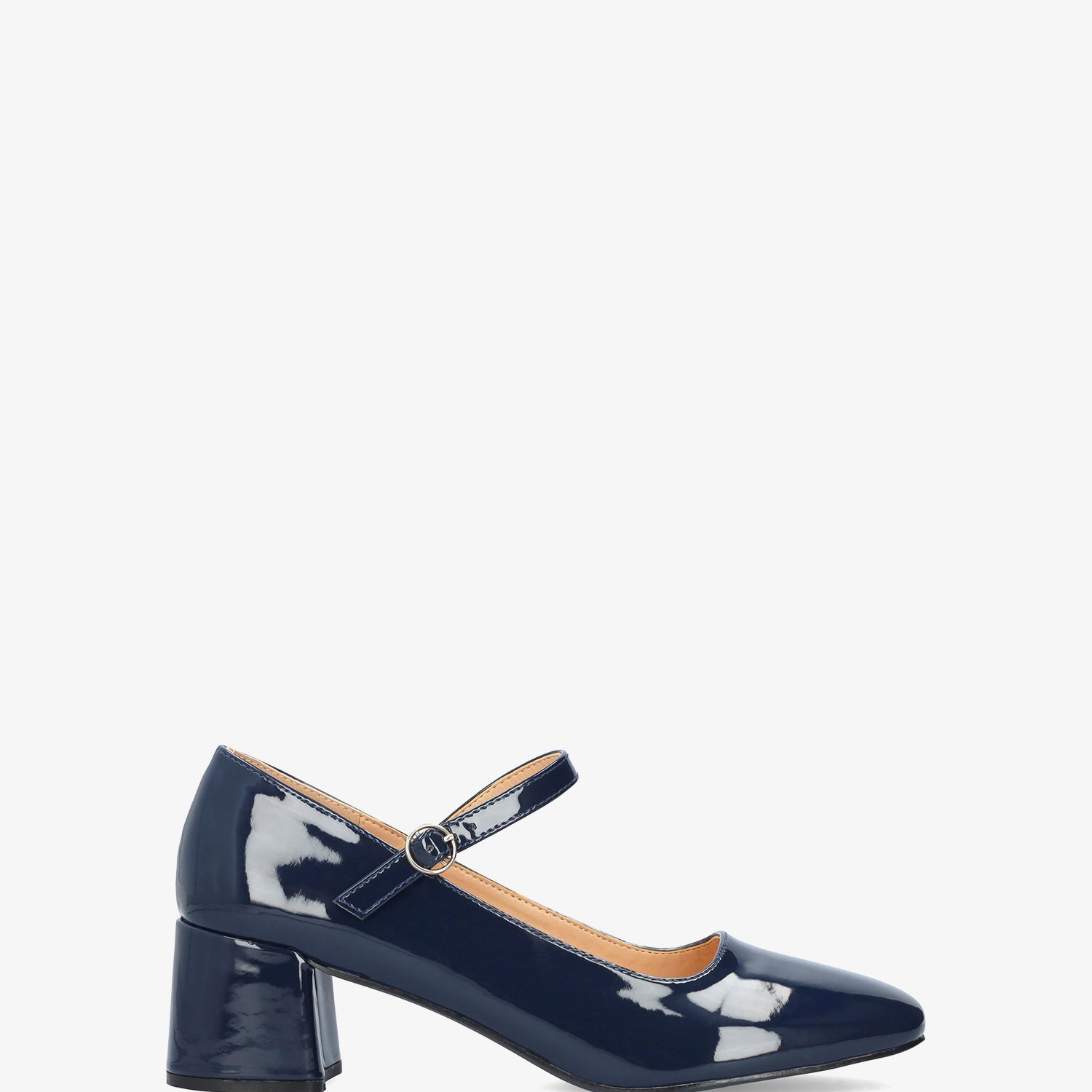 Chaussures Mary Jane avec talon en simili cuir verni bleu marine. Bout carré et bride sur le cou-de-pied avec boucle métallique latérale. Talon carré doublé au ton de 6 cm pour les petites pointures de 32 à 35 et un talon de 6 cm pour la taille 42.