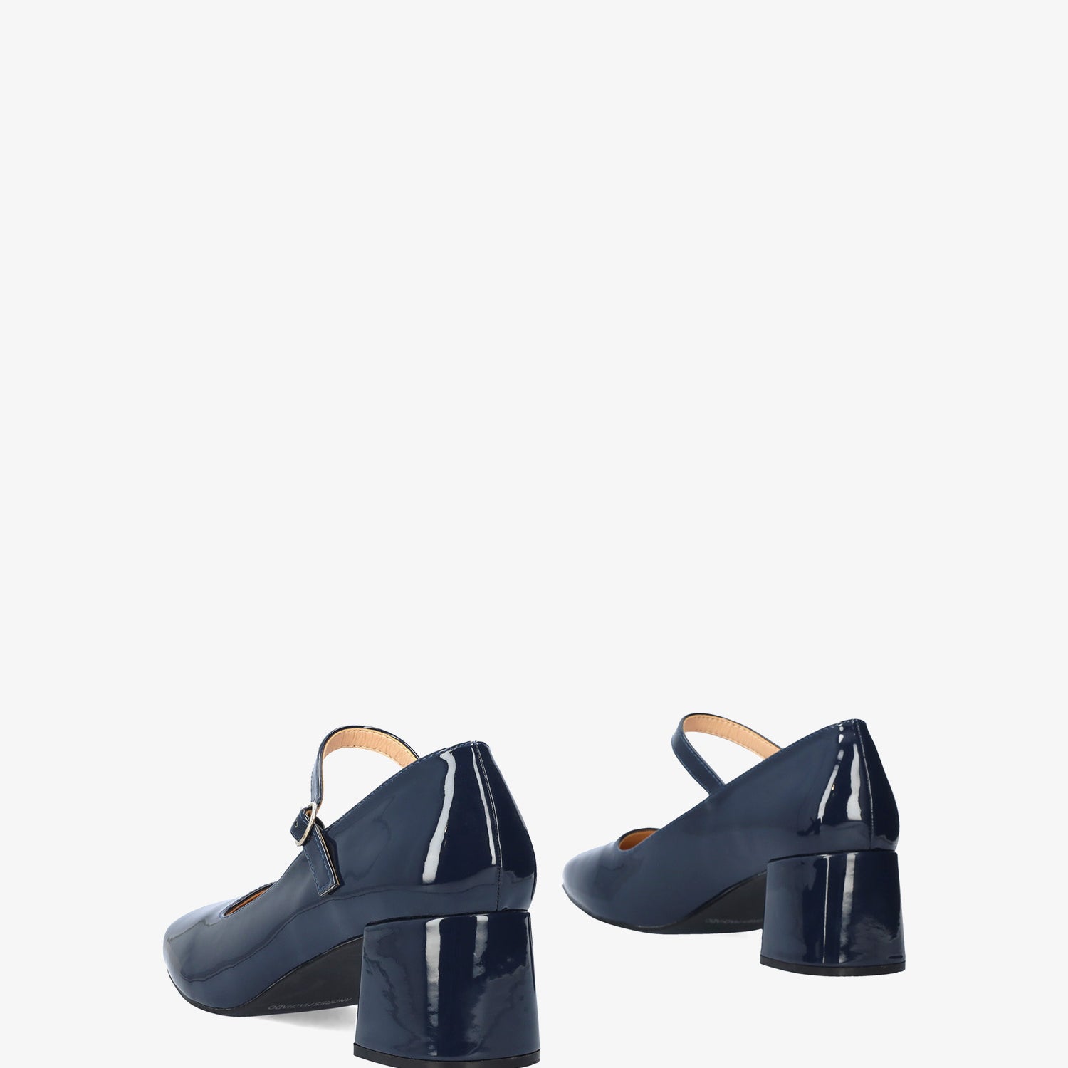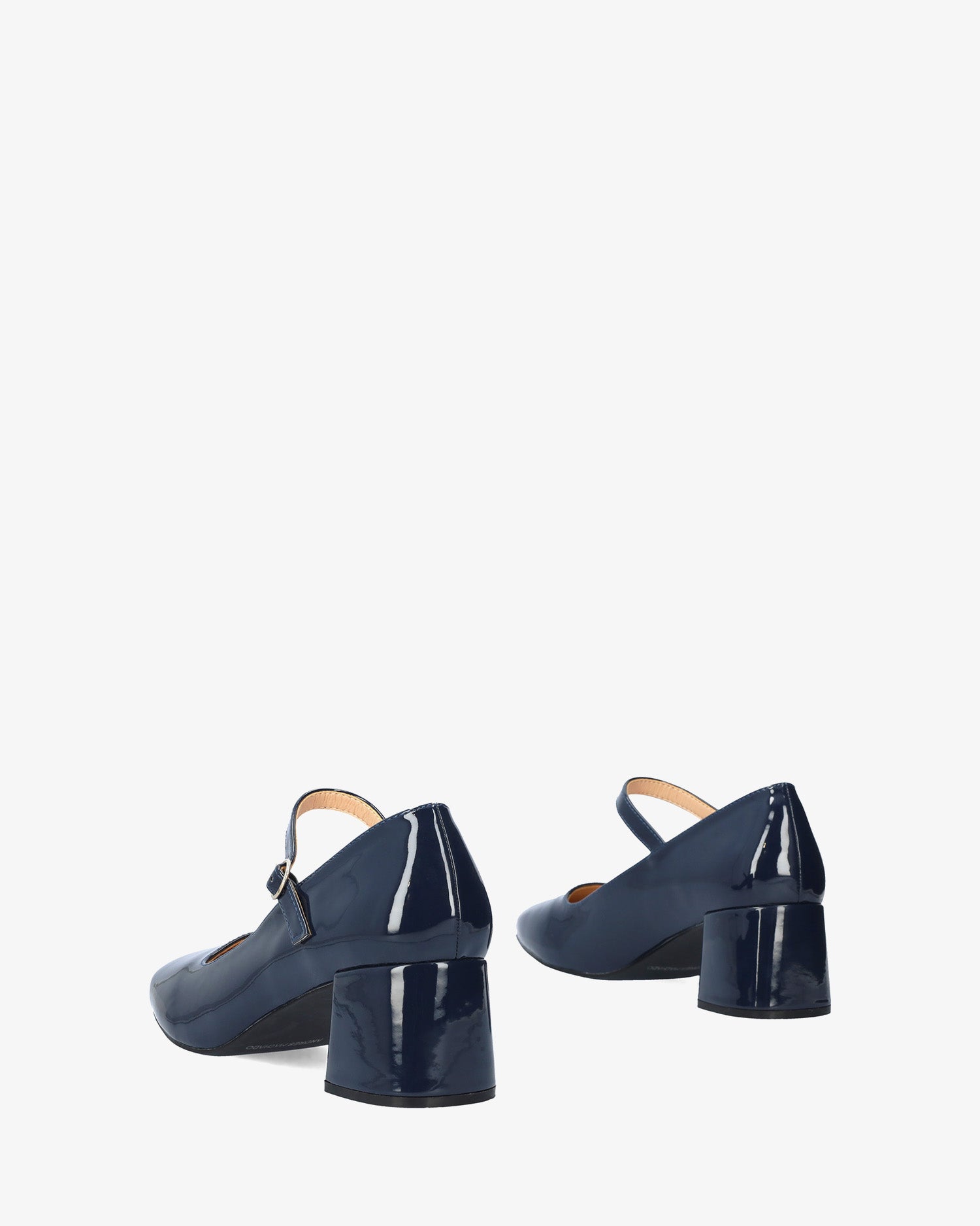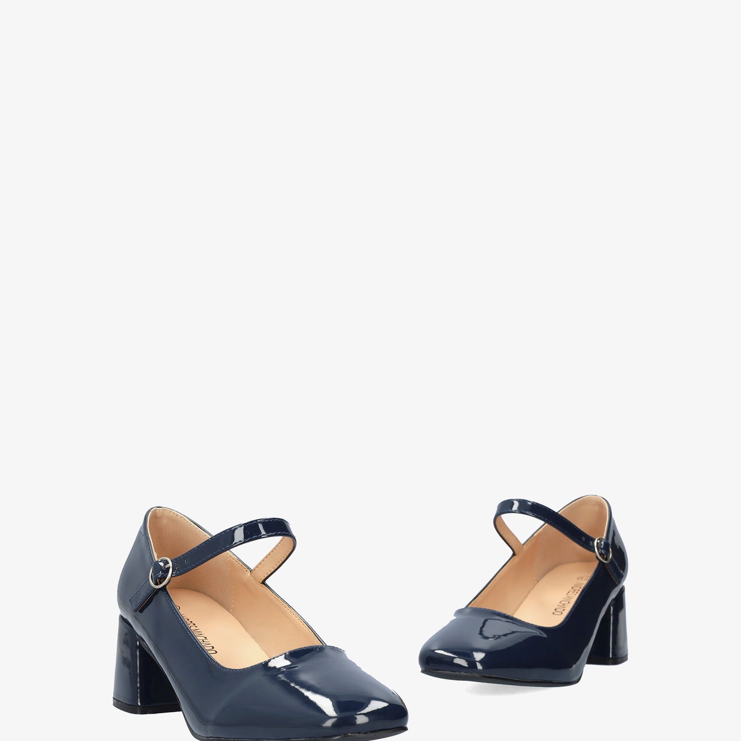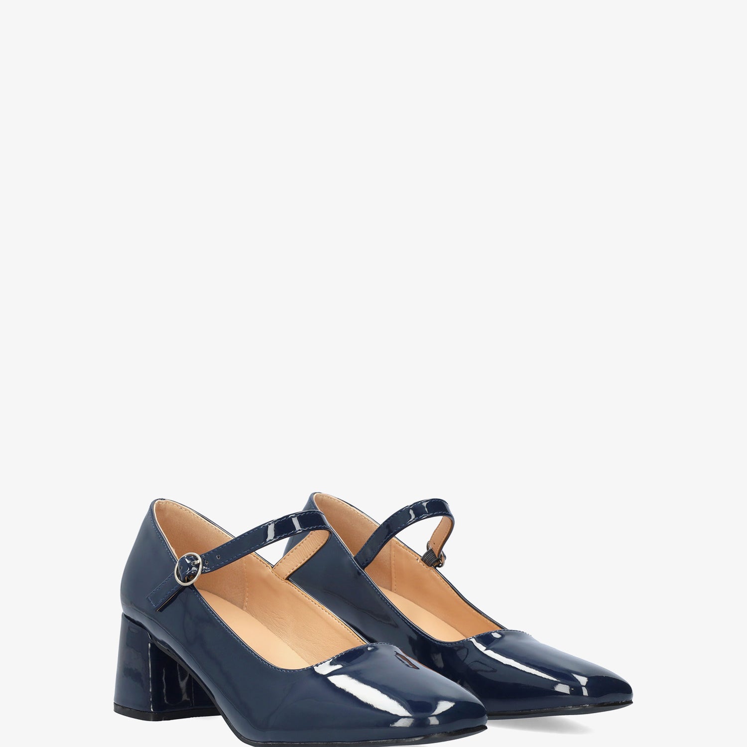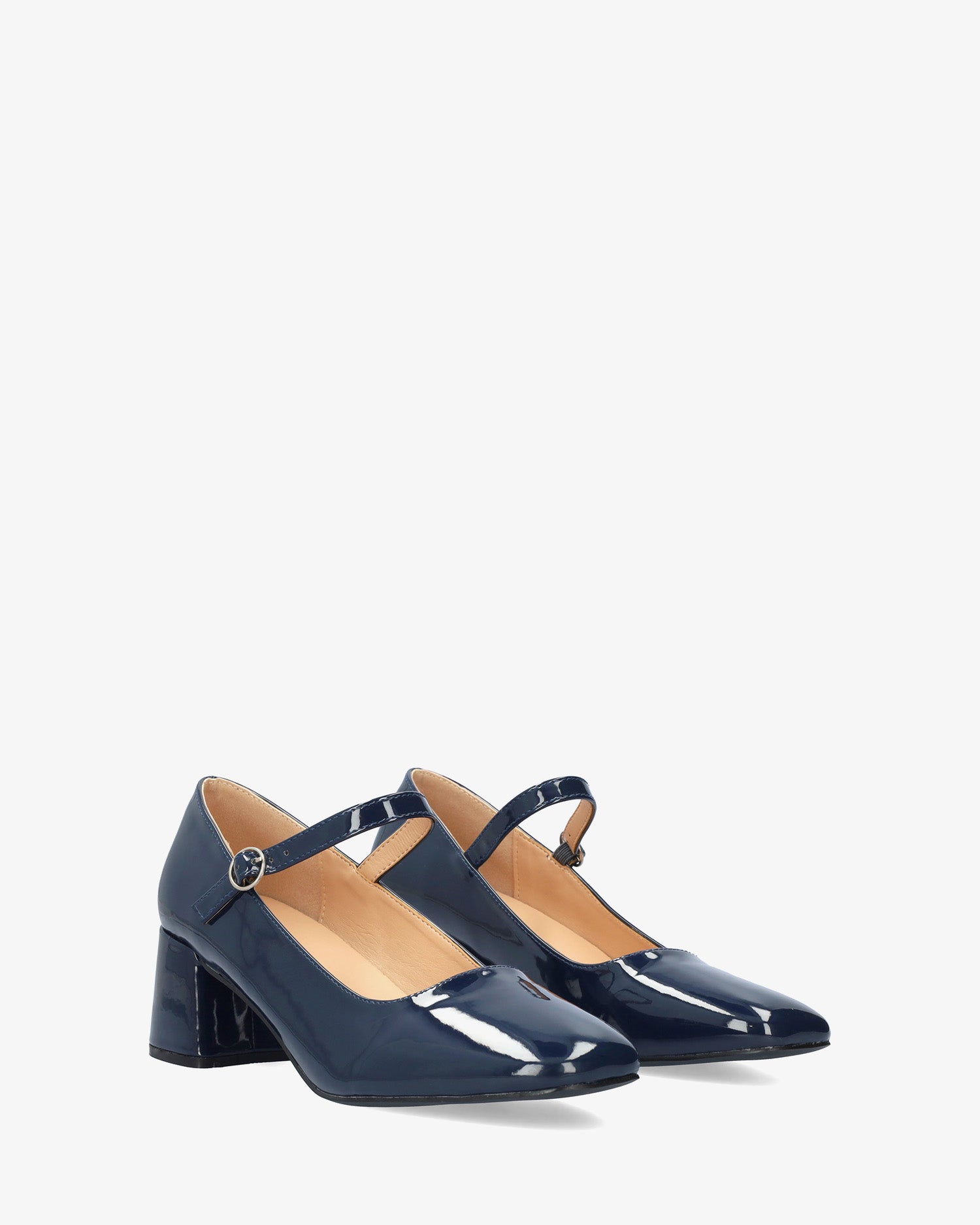 Chaussures Mary Jane avec talon en simili cuir verni bleu marine. Bout carré et bride sur le cou-de-pied avec boucle métallique latérale. Talon carré doublé au ton de 6 cm pour les petites pointures de 32 à 35 et un talon de 6 cm pour la taille 42.