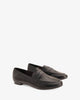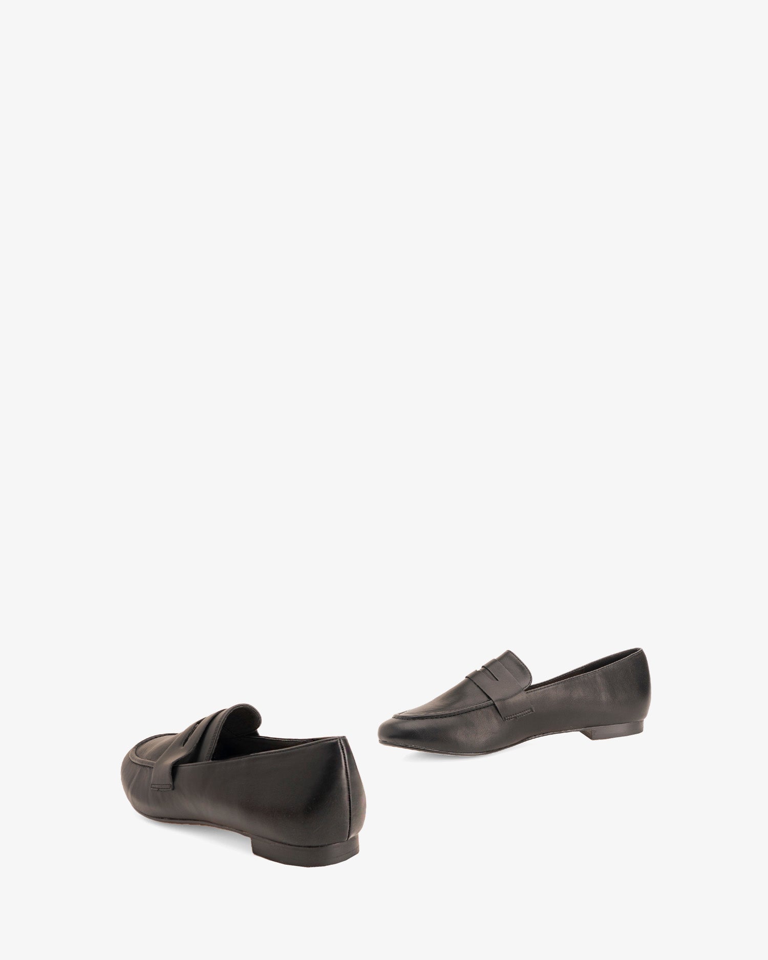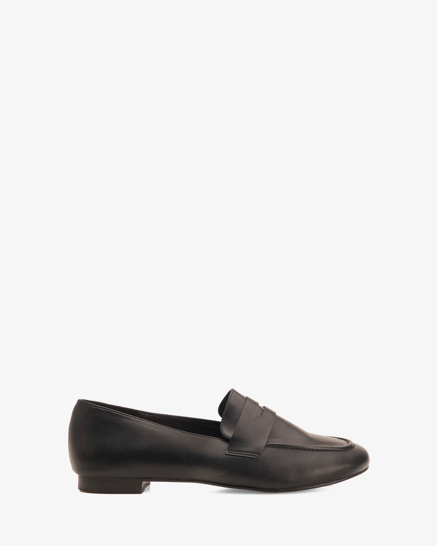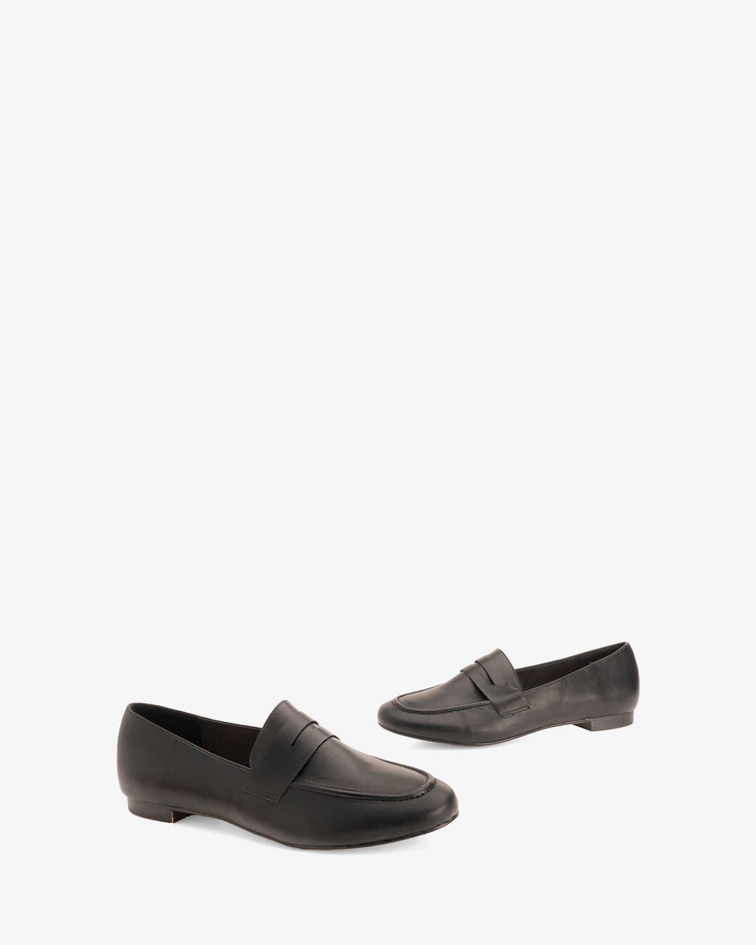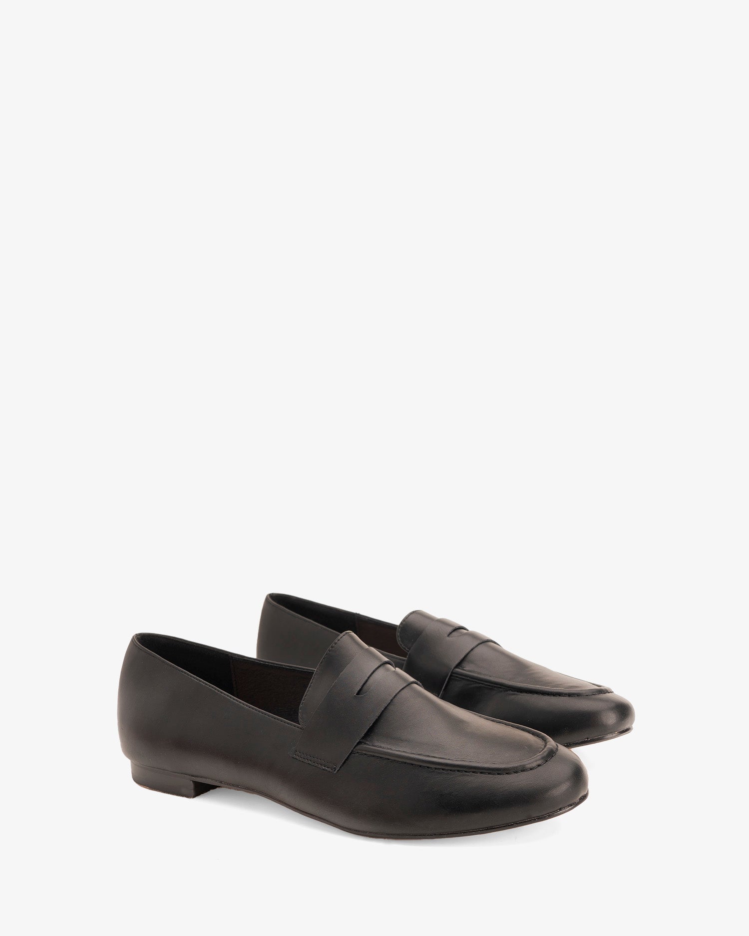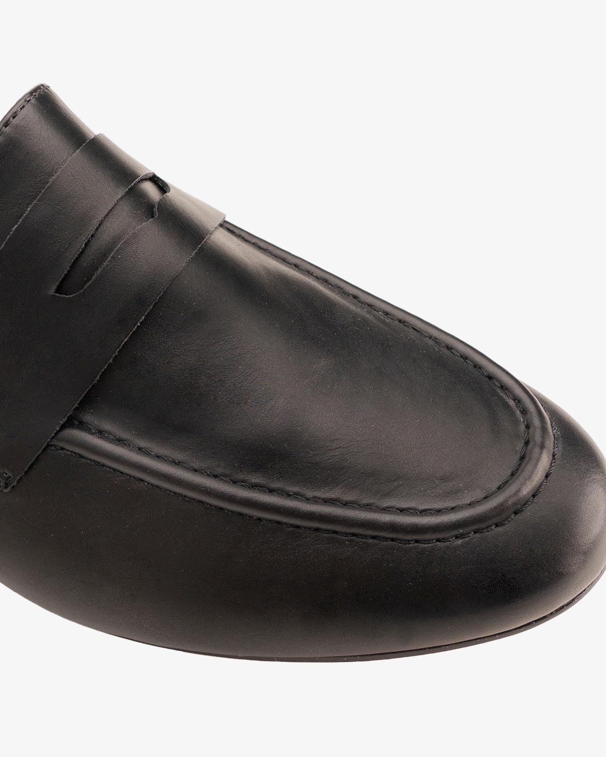 Mocassins en soft de couleur noir. Masque au même ton sur l´empeigne. Bout en forme d´amande. Grandes pointures du 42 au 45.