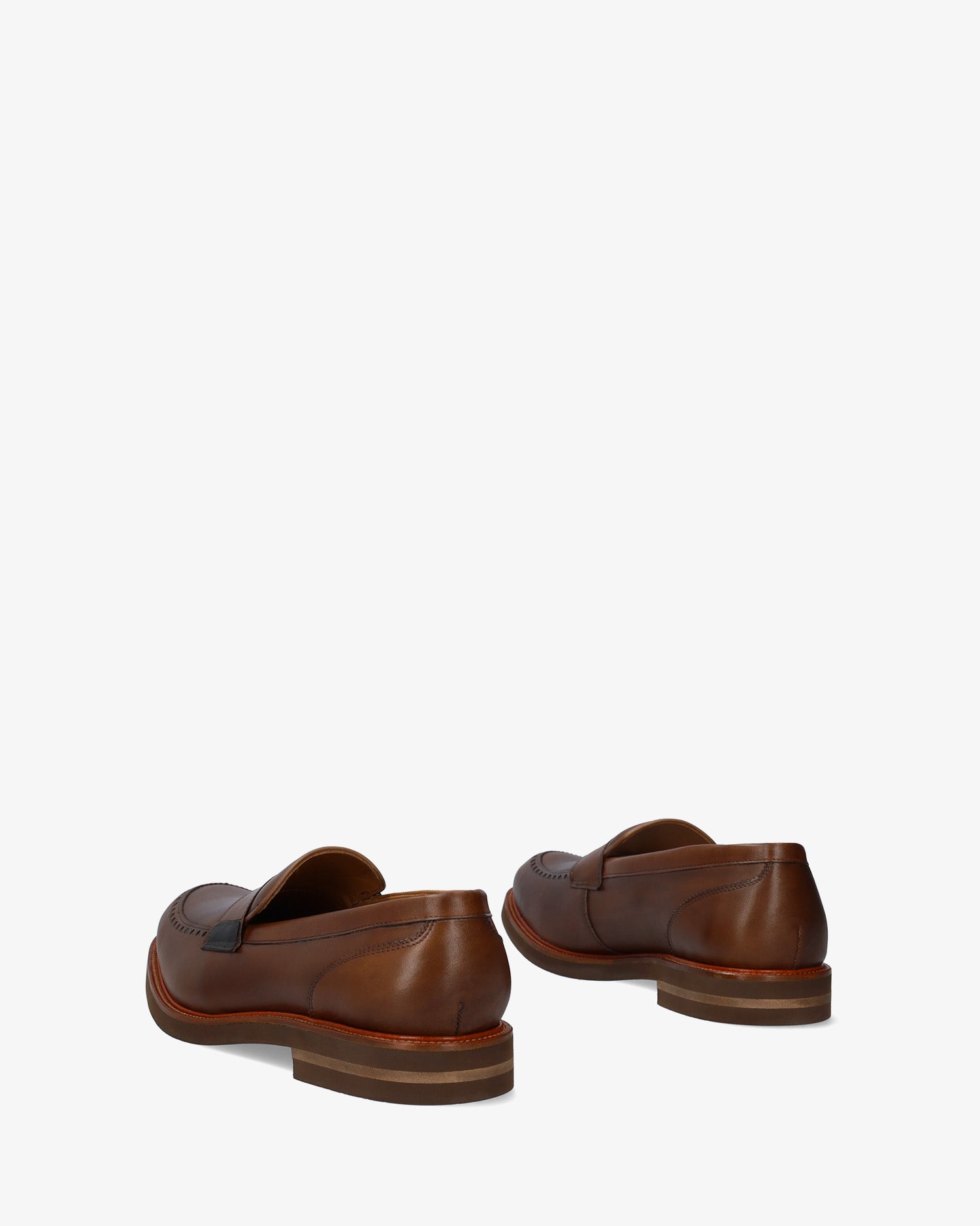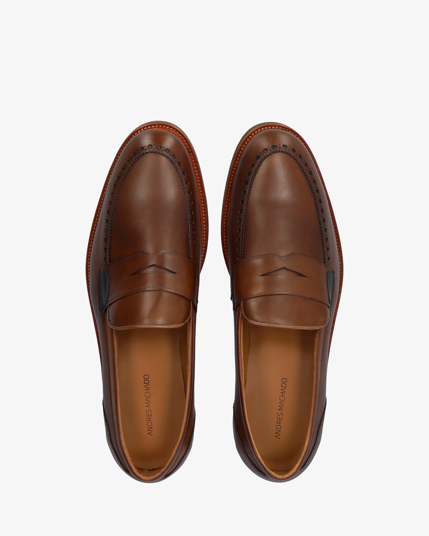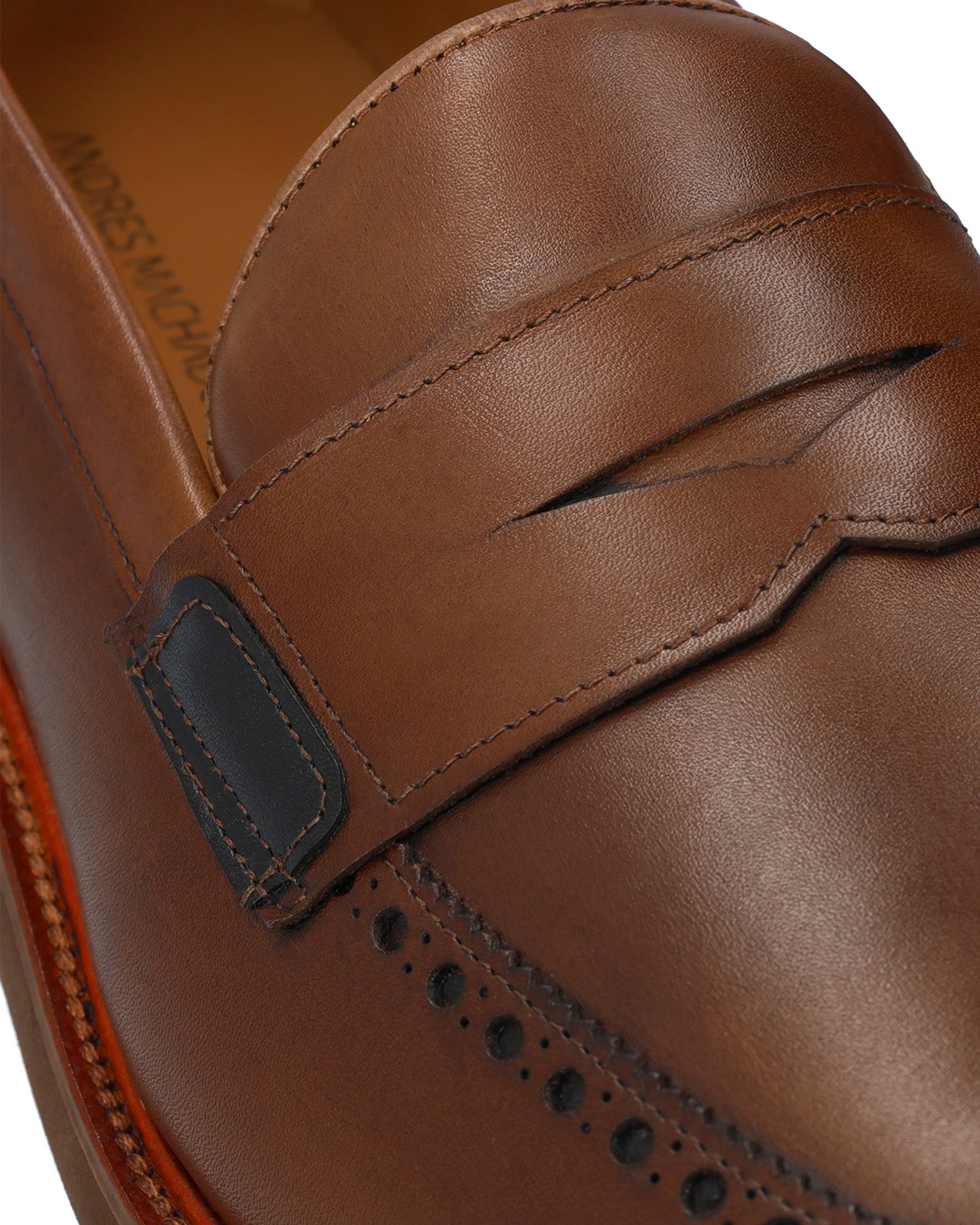 Mocassins en Cuir Acajou avec masque sur l´empeigne et détail marron sur le latéral. Doublure intérieure en couleur Noir. Semelle en gomme eva. Petites Pointures pour hommes du 37 au 40. Grandes Pointures pour hommes du 47 au 50. Fabrication Espagnole.