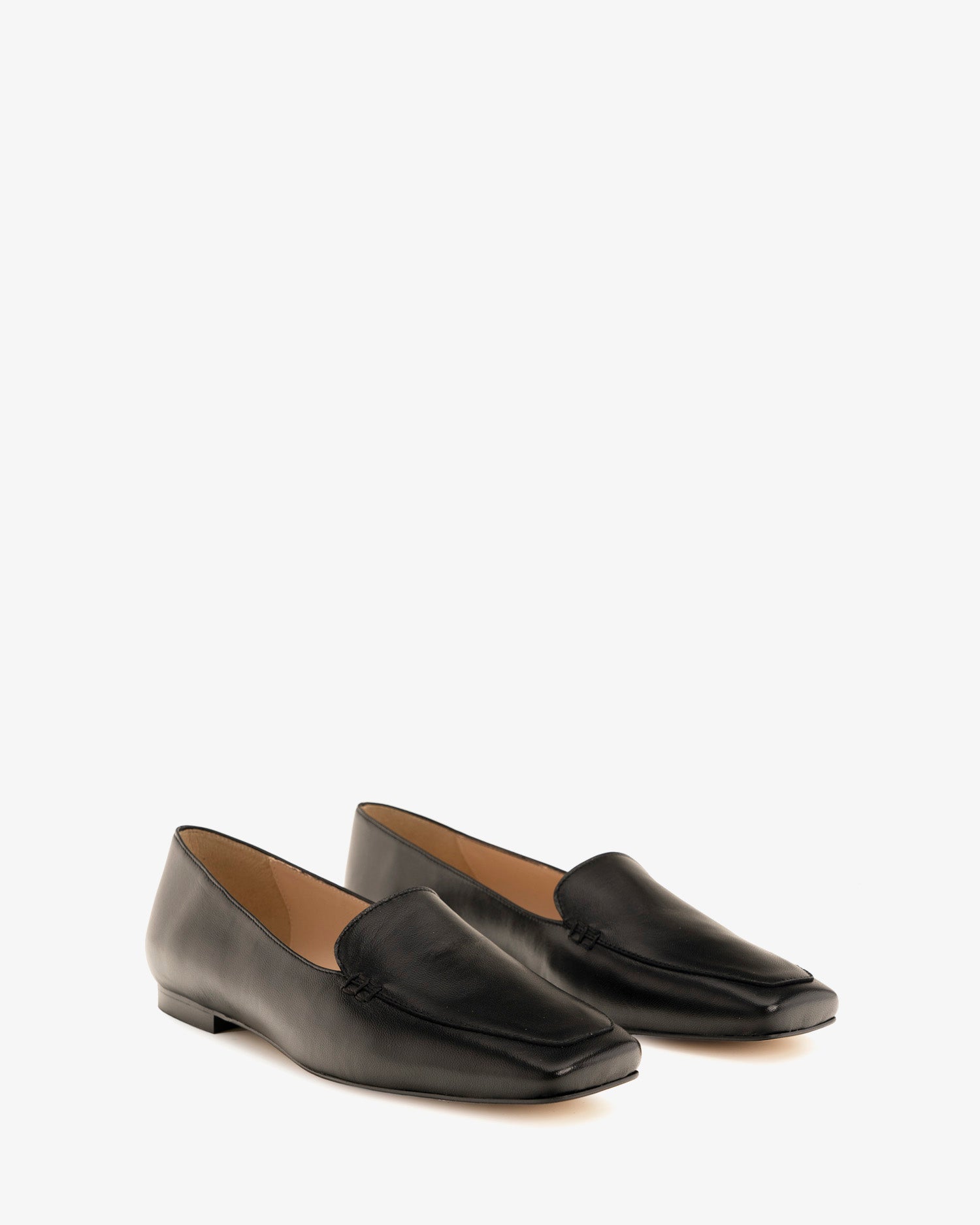 Chaussures de style mocassins en cuir noir. Design classique mais très élégant à bout carré. Doublure en cuir beige. Disponibles dans toutes les pointures du 32 au 45. Fabriqués en Espagne.