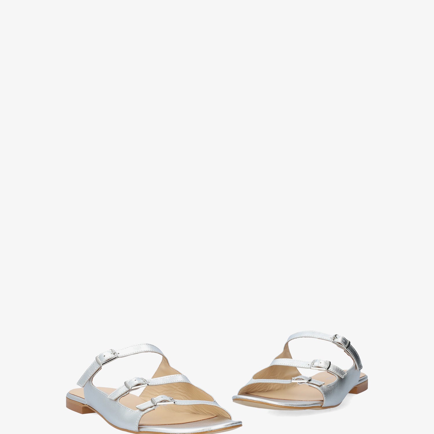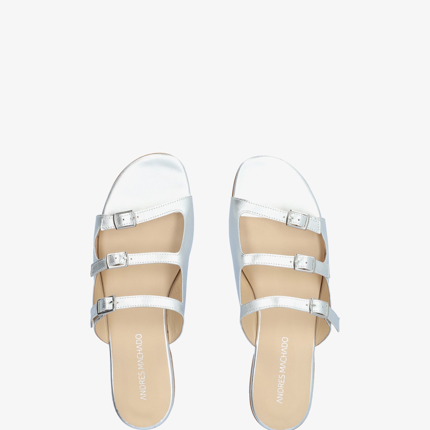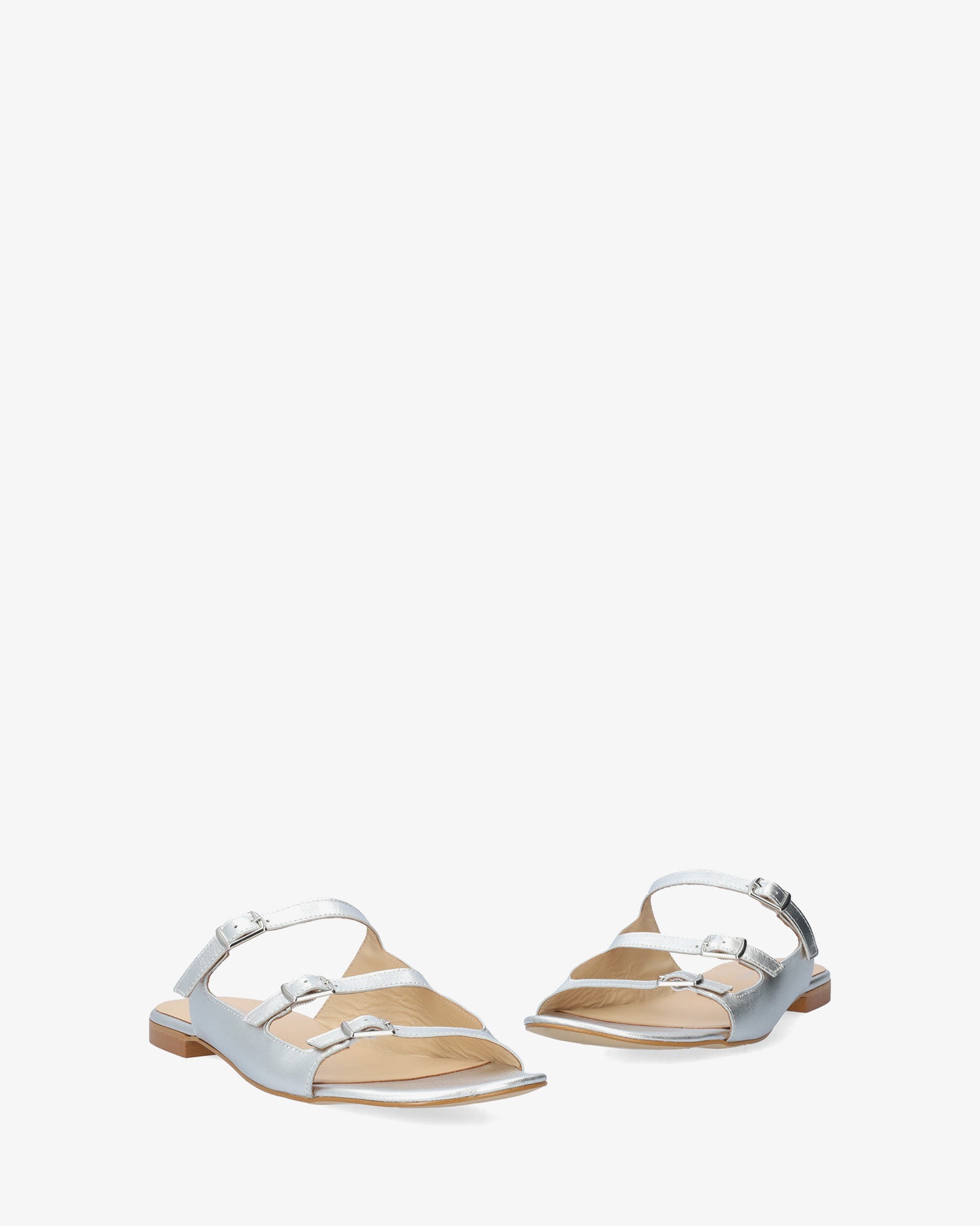 Sandales plates en cuir couleur Argentée. Modèle à bout ouvert et arrondi avec trois brides fines sur l`avant et le cou-de-pied. Fermeture à boucle métallique sur le côté. Talon de 2cm pour les pointures du 32 au 35. Talon de 2cm pour les pointures du 36 au 41. Talon de 2cm pour les pointures du 42 au 45. Fabriquée en Espagne