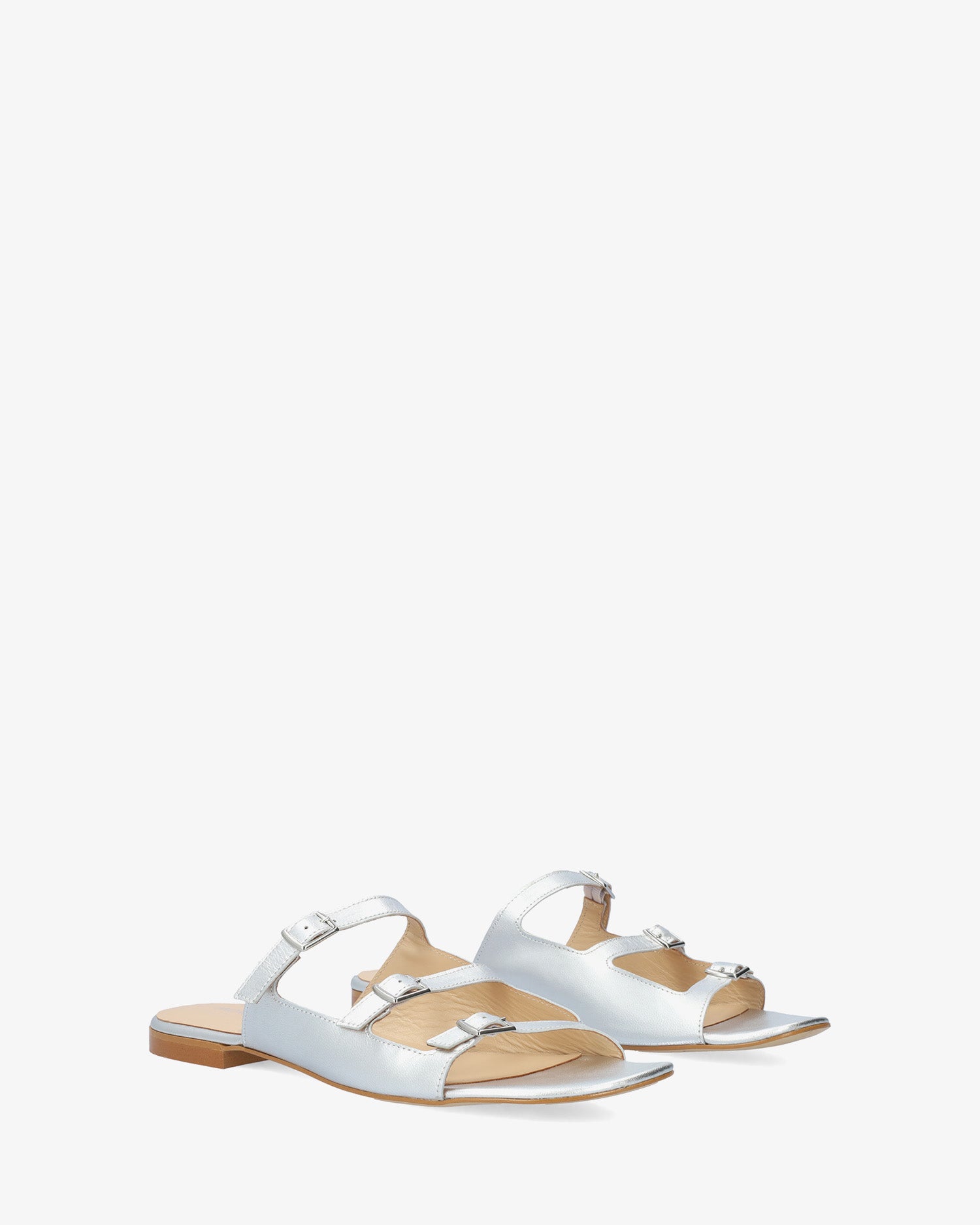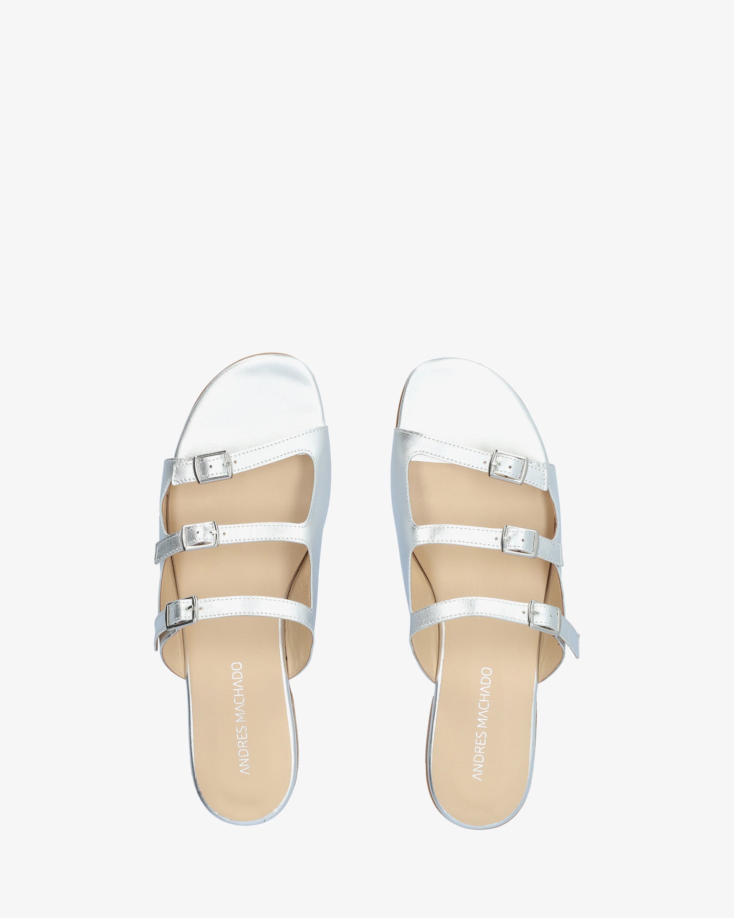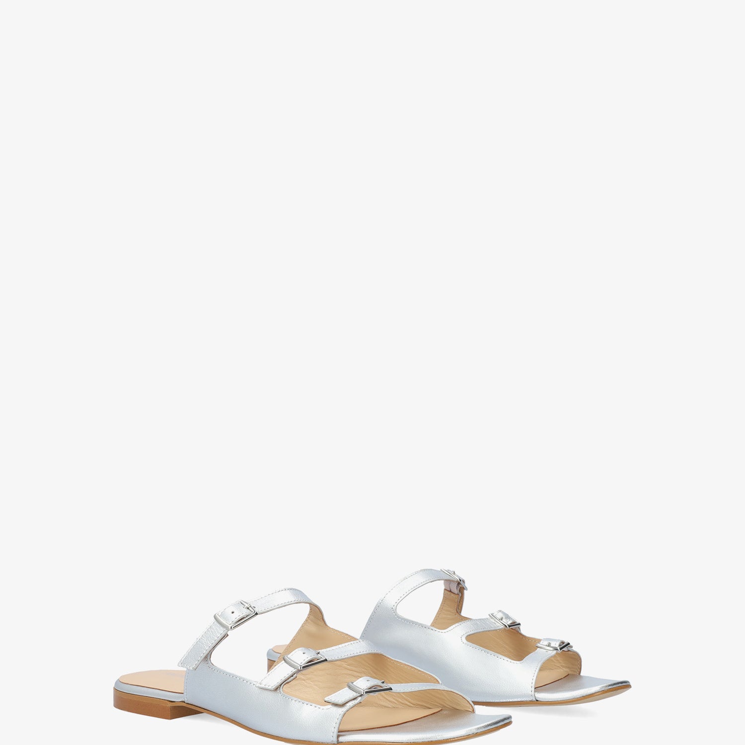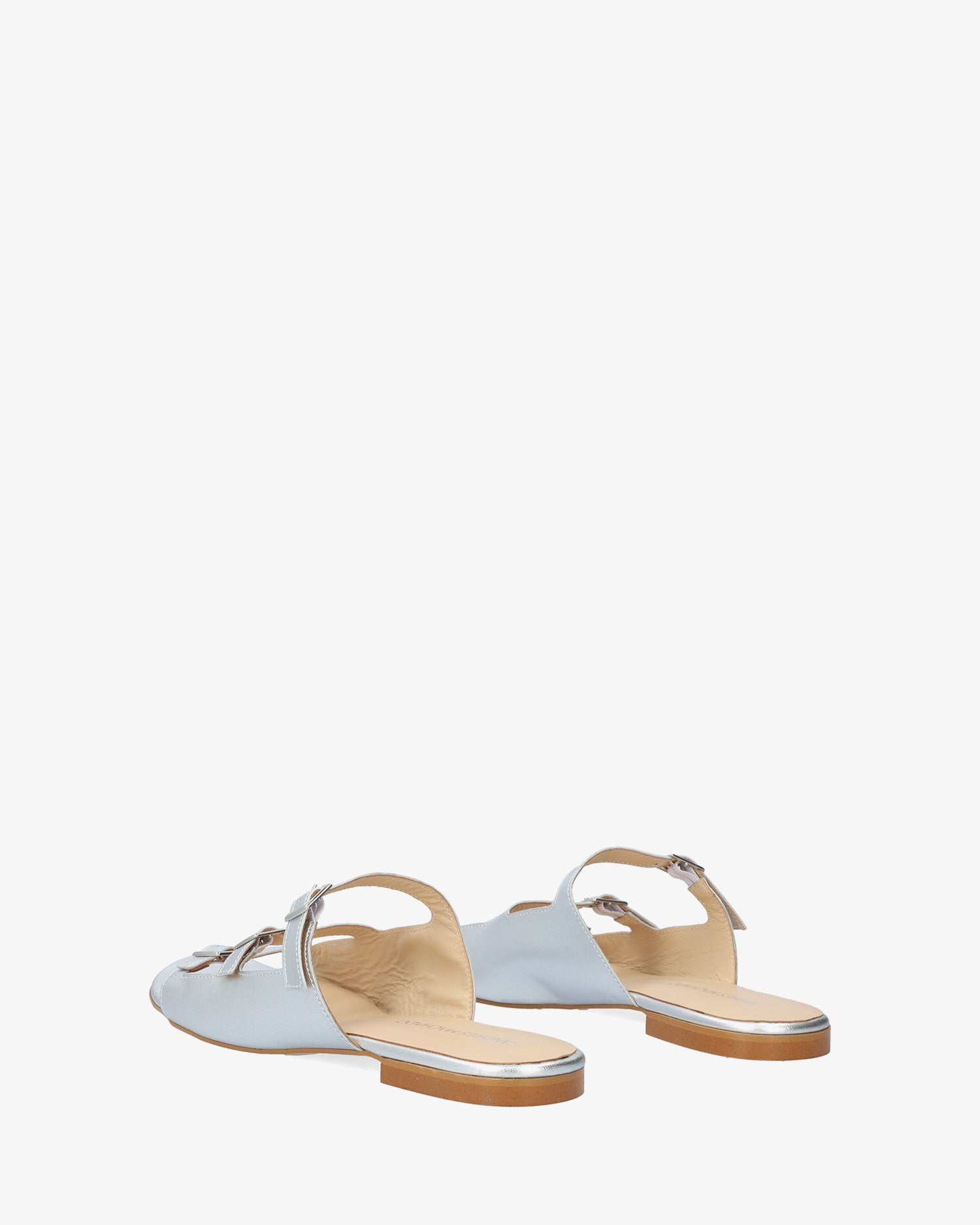 Sandales plates en cuir couleur Argentée. Modèle à bout ouvert et arrondi avec trois brides fines sur l`avant et le cou-de-pied. Fermeture à boucle métallique sur le côté. Talon de 2cm pour les pointures du 32 au 35. Talon de 2cm pour les pointures du 36 au 41. Talon de 2cm pour les pointures du 42 au 45. Fabriquée en Espagne