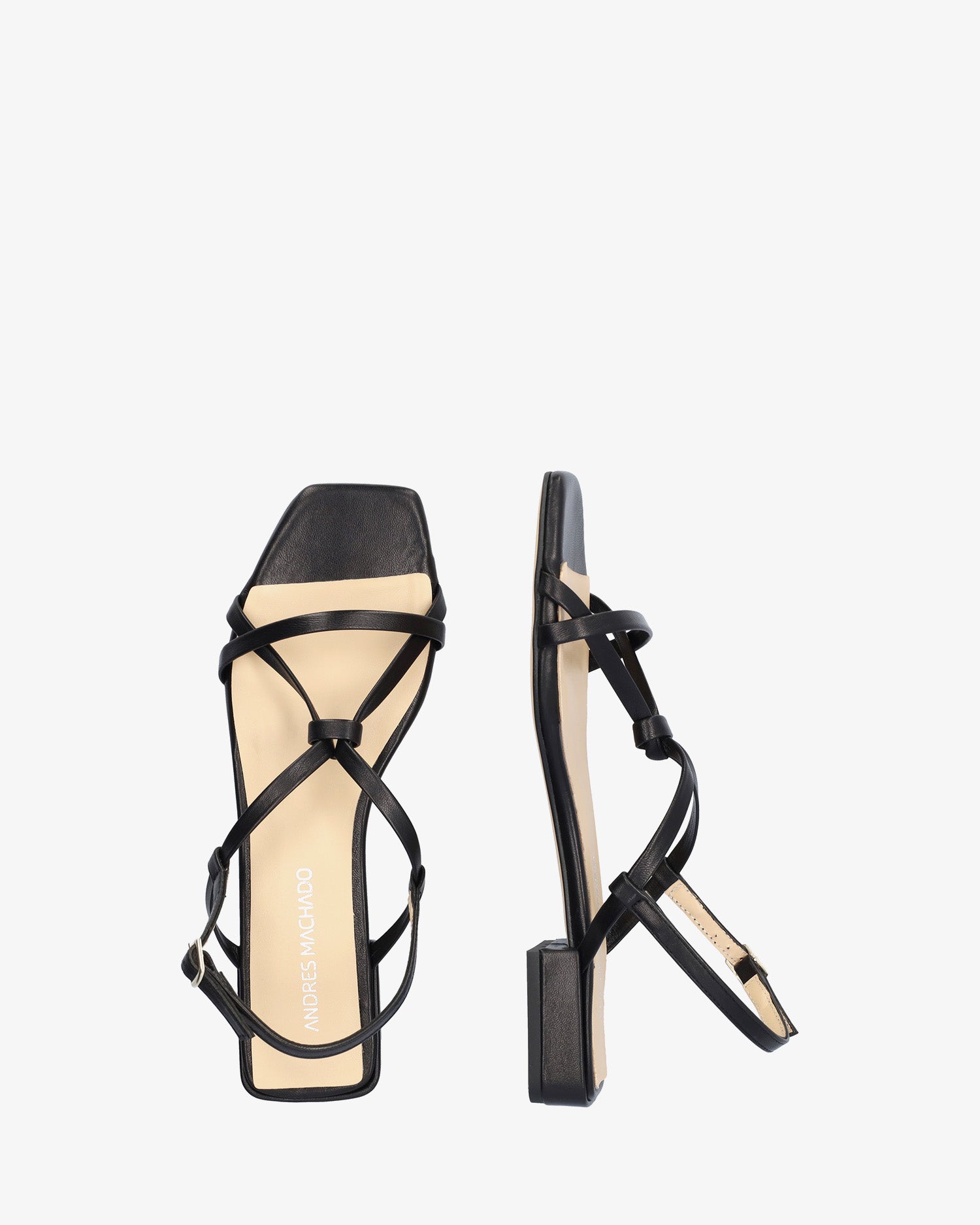 Sandales plates en cuir noir. Modèle avec brides nouées et entrelacées sur la partie centrale du cou-de-pied. Fermeture à boucle latérale à la cheville. Bout carré et ouvert. Talon carré de 2,5 cm pour les petites pointures de 32 à 35. Talon de 3 cm pour les grandes pointures de 42 à 45. Fabriqué en Espagne.