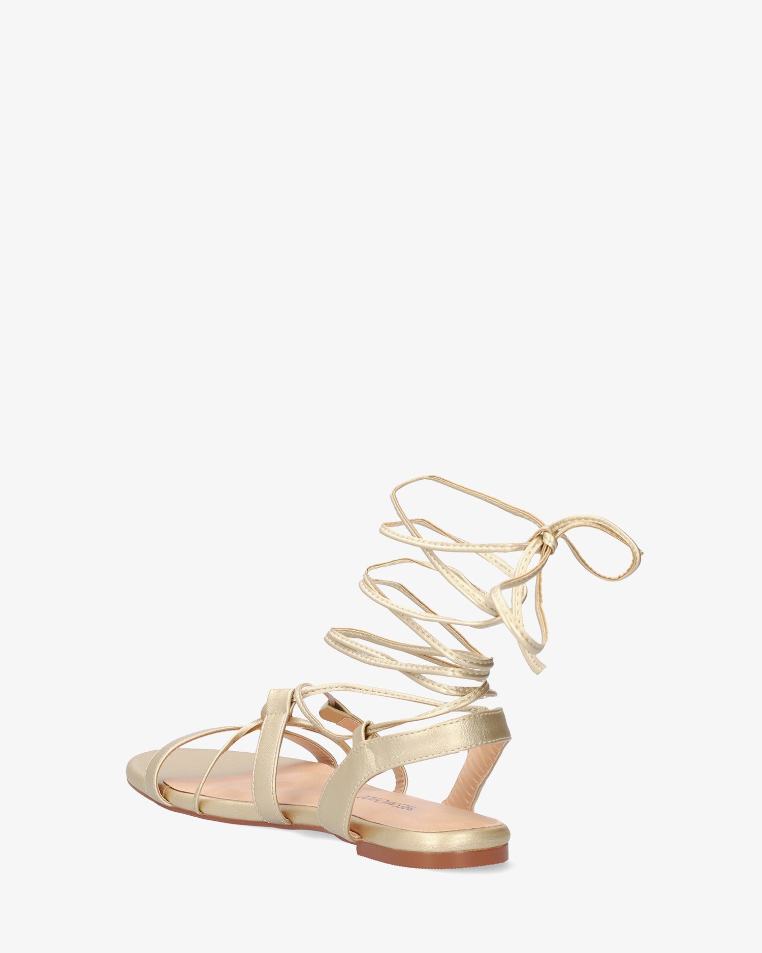 Sandales plates en simili cuir doré. Forme de largeur spéciale. Modèle à contrefort ouvert avec de fines lanières à l`avant et sur le cou-de-pied maintenues par des lanières latérales. Fermeture avec des lacets autour de la cheville. Bout ouvert et arrondi. Talon de 2 cm pour les petites pointures du 32 au 35 et les grandes pointures du 42 au 45.