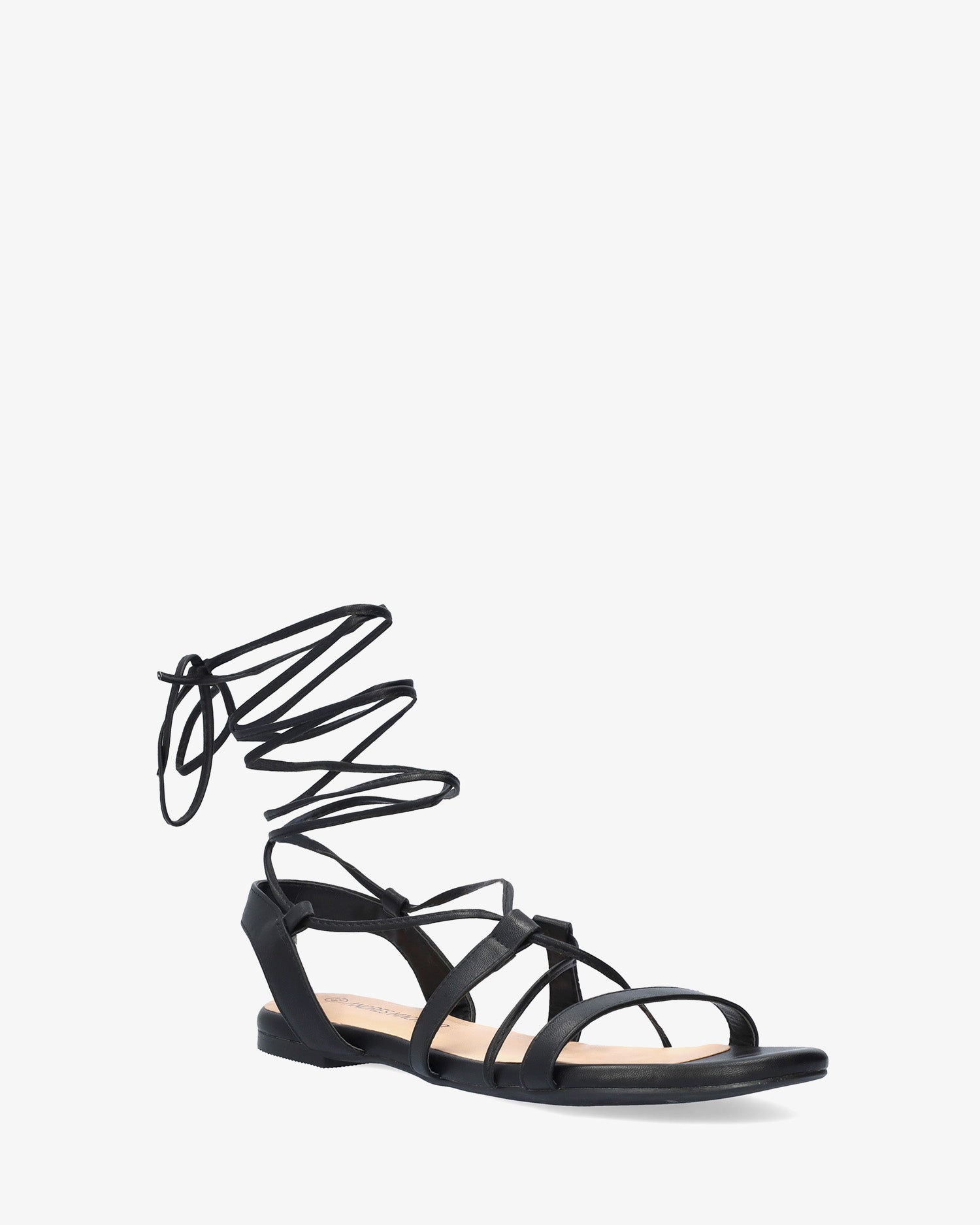 Sandales plates en simili cuir noir. Forme de largeur spéciale. Modèle à contrefort ouvert avec de fines lanières à l`avant et sur le cou-de-pied maintenues par des lanières latérales. Fermeture avec des lacets autour de la cheville. Bout ouvert et arrondi. Talon de 2 cm pour les petites pointures du 32 au 35 et les grandes pointures du 42 au 45.