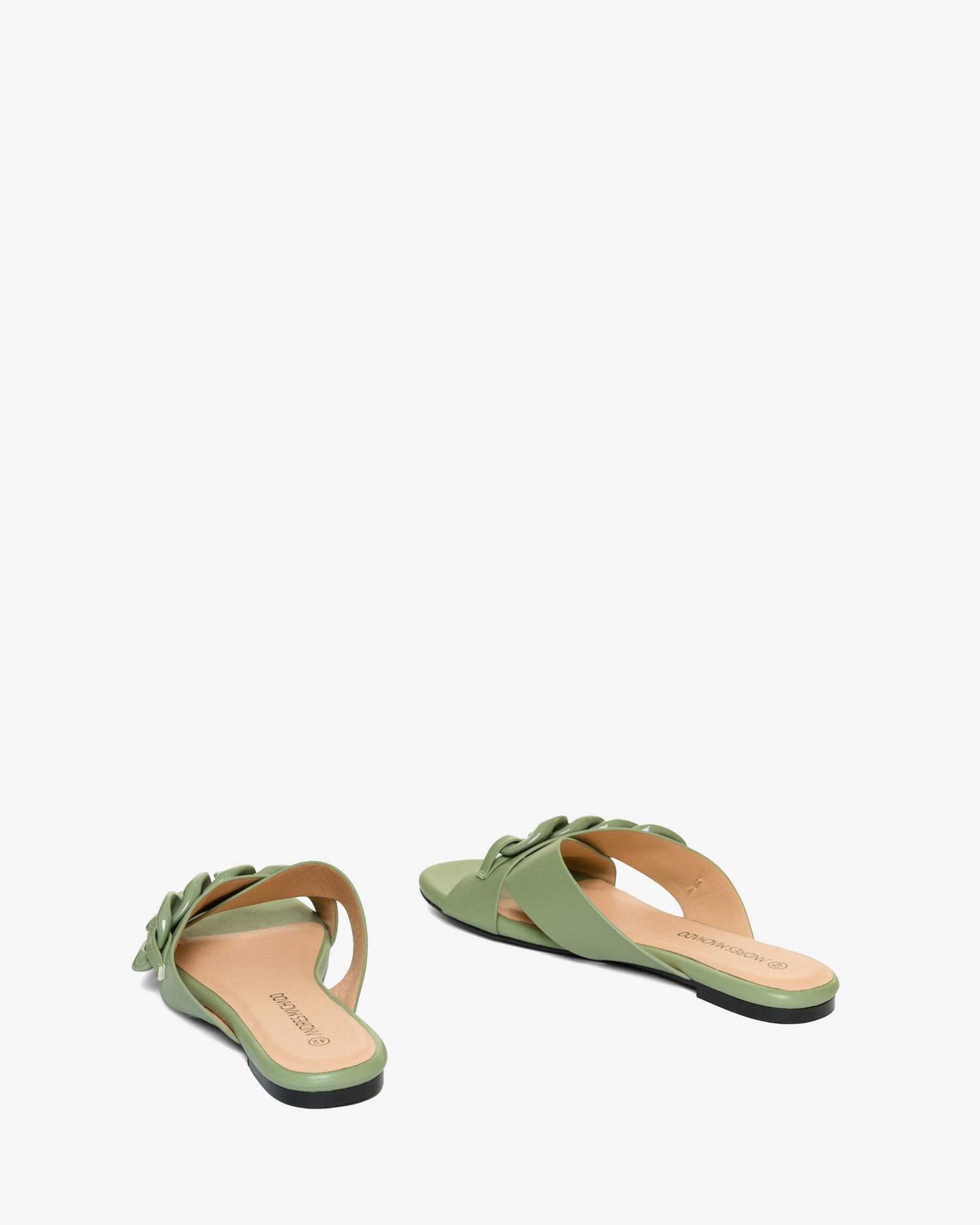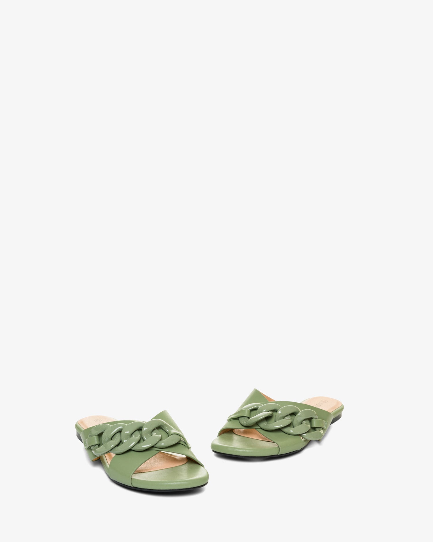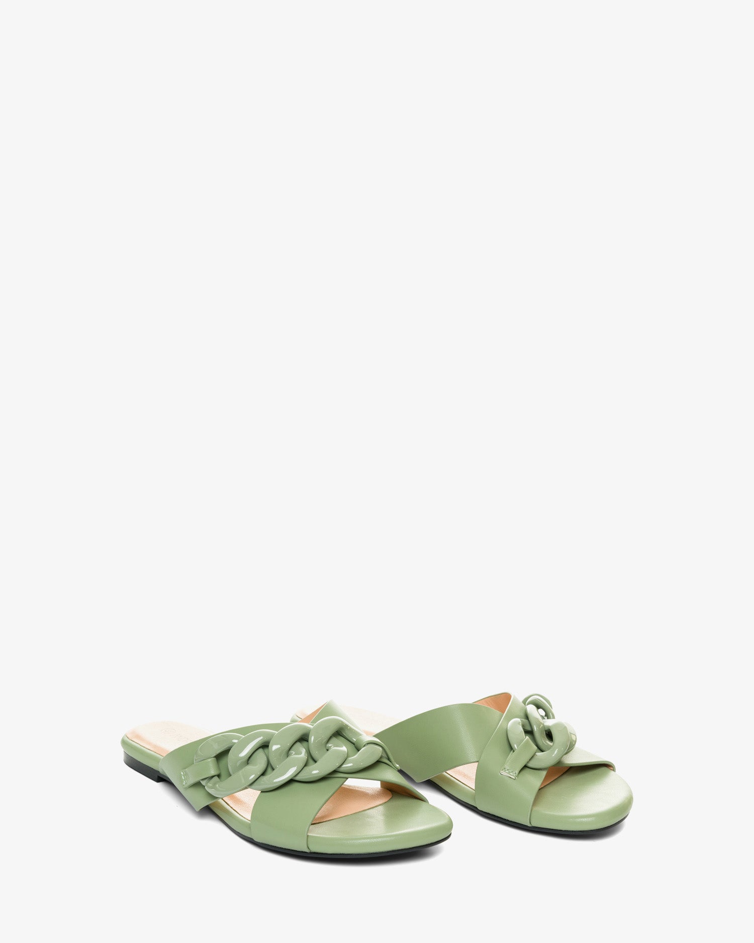 Sandale plate en simili cuir couleur Violet. Modèle ouvert avec deux larges brides larges et croisées sur le cou-de-pied. Détail avec chaîne entrelacée sur l`une des brides. Semelle rembourrée. Grandes pointures du 42 au 45.