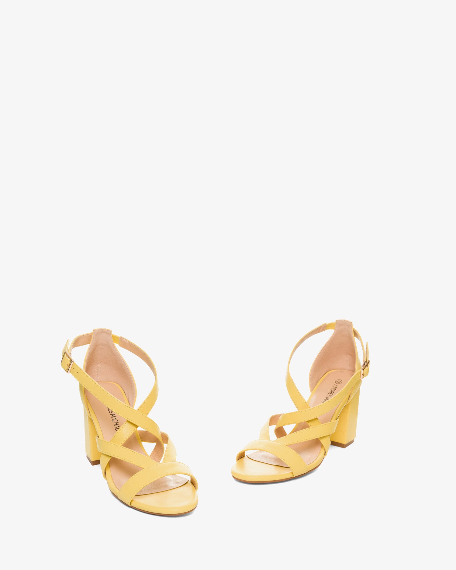 Sandale à talon carré couleur Jaune en simili cuir. Bout ouvert avec brides entrelacées sur cou-de-pied du même ton. Fermeture à boucle métallique autour de la cheville et contrefort fermé du même ton. Talon de 7 cm pour les pointures du 32 au 35. Talon de 9 cm pour les pointures du 42 au 45.