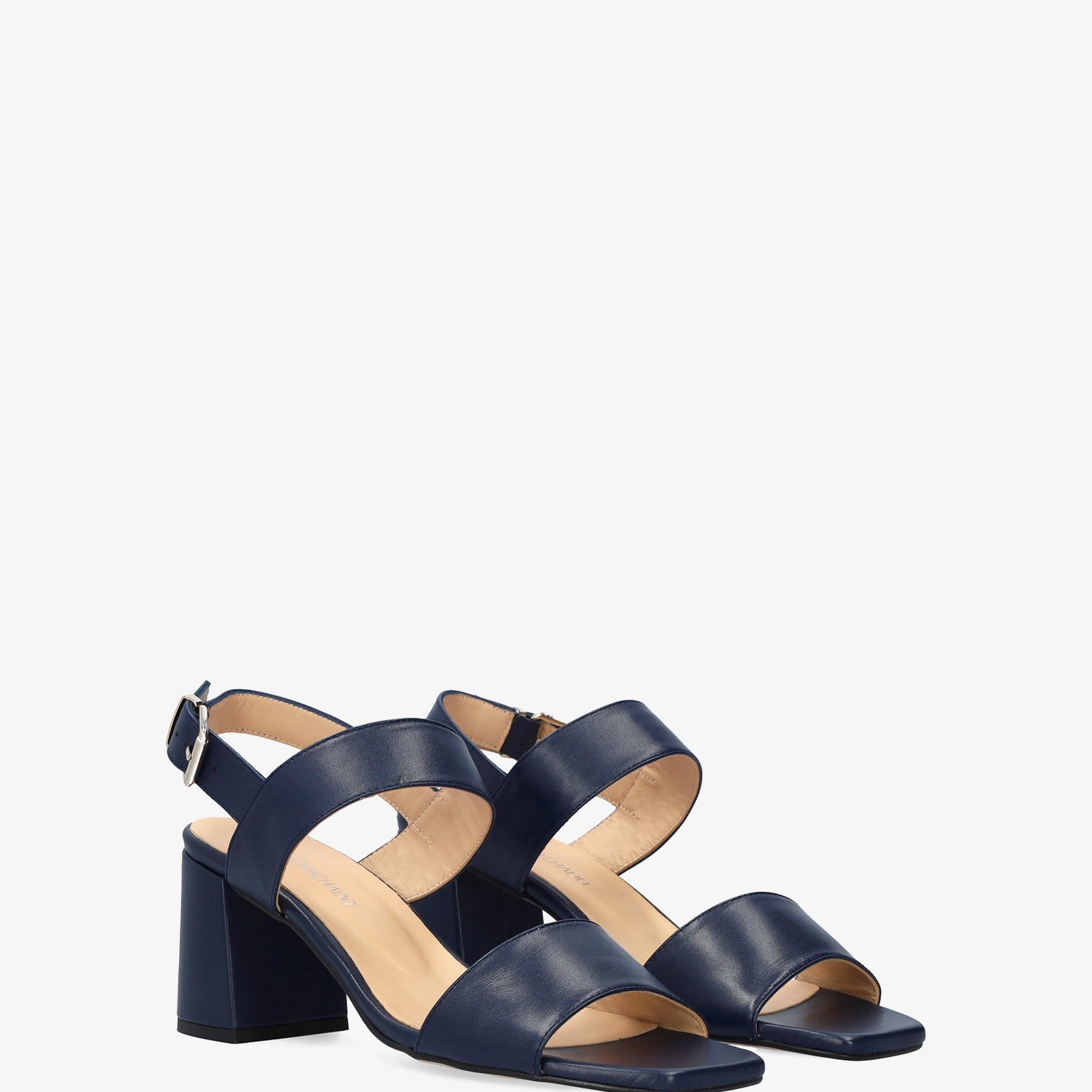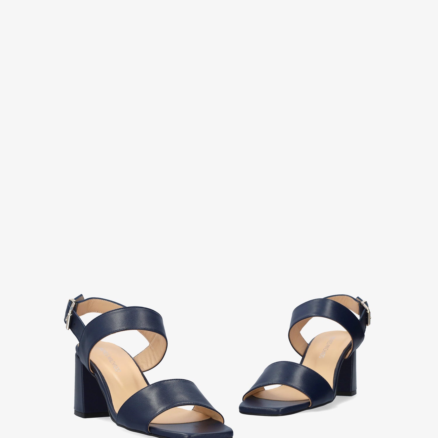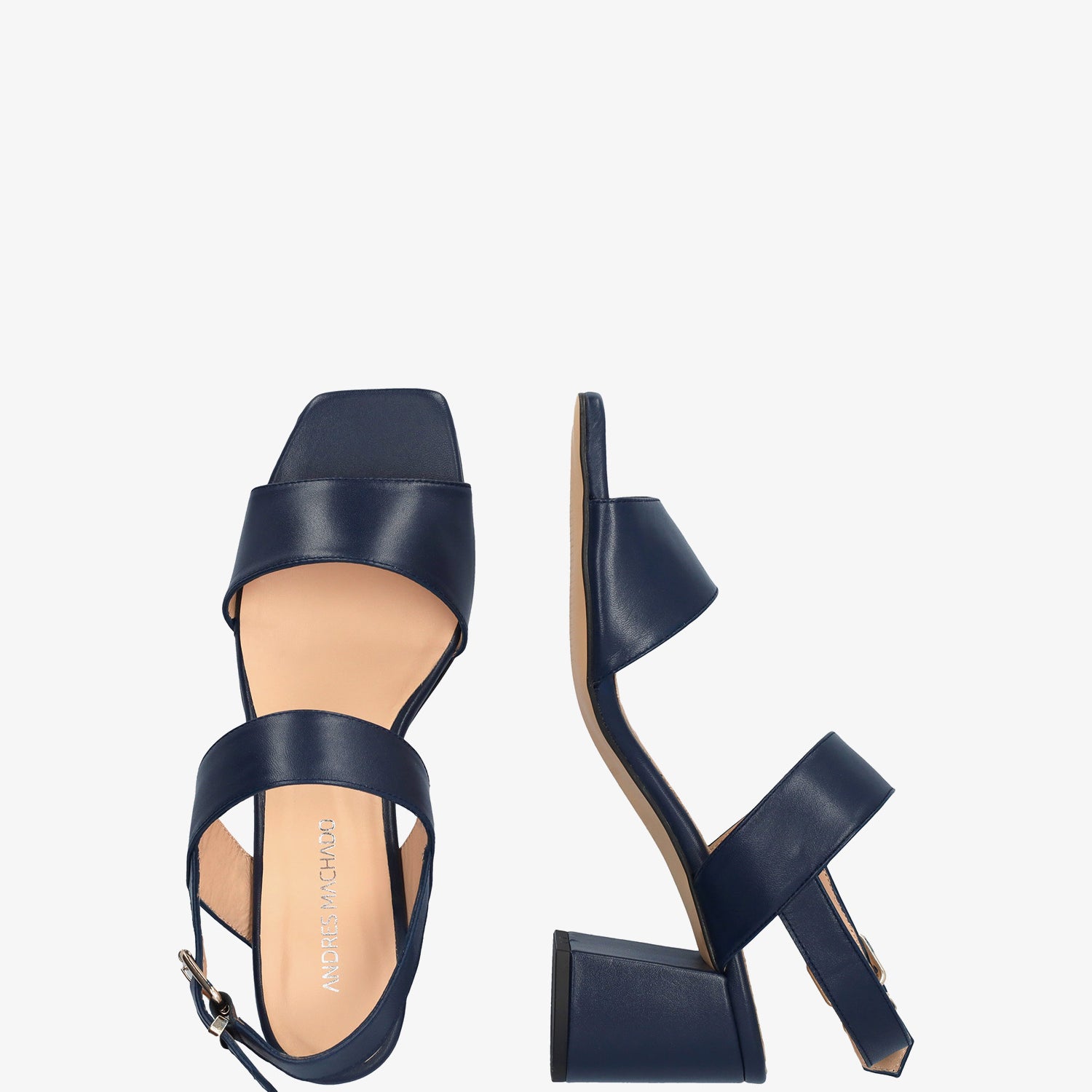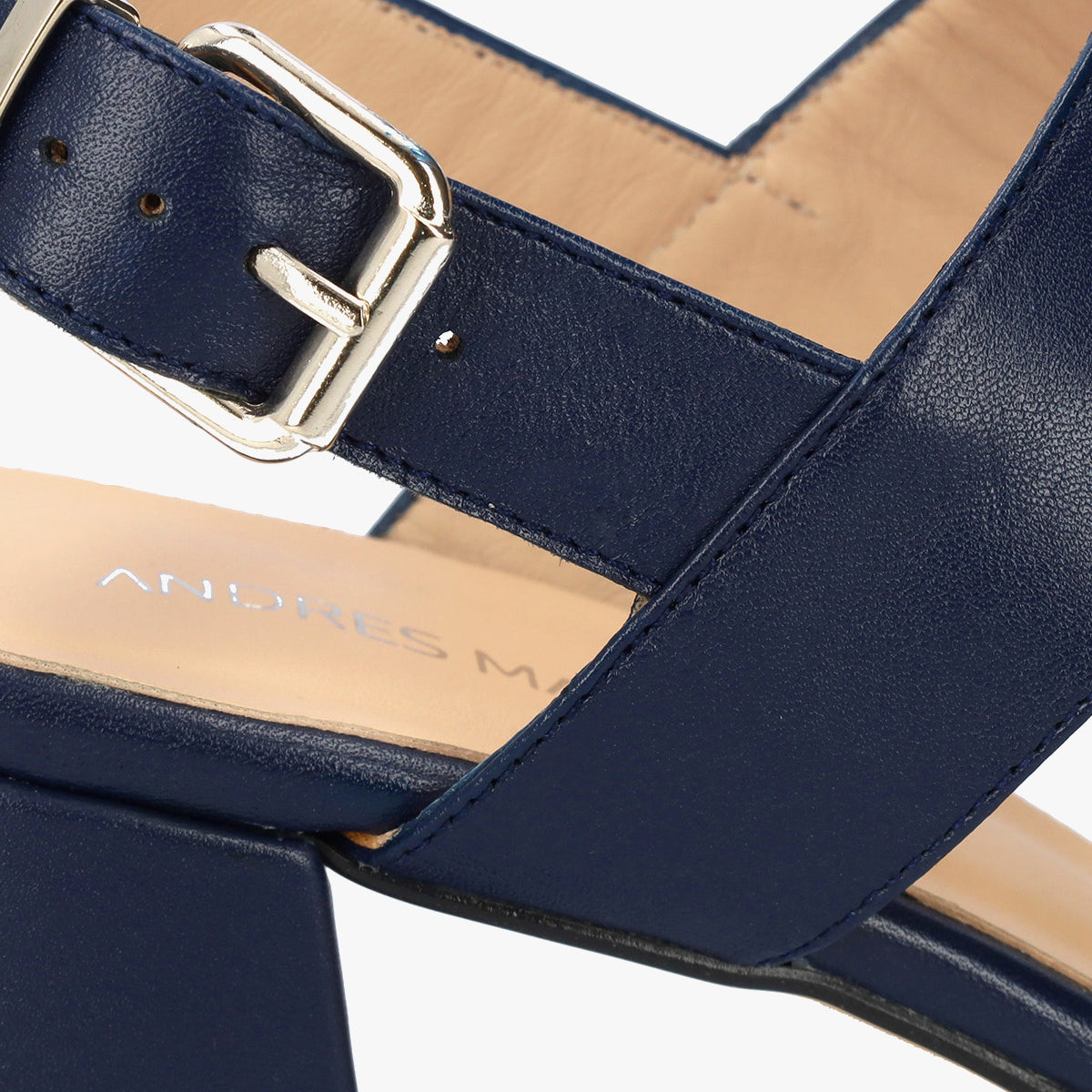 Sandale en cuir de couleur Bleu Marin avec talon arrondi. Design avec de larges brides assorties à l'avant et sur le cou-de-pied. Fermeture par une boucle métallique sur le côté. Bout ouvert et carré. Doublure intérieure en cuir beige. Talon doublé au même ton mesurant 6,5 cm pour les petites pointures (32 à 35) et 7 cm pour les grandes pointures (42 à 45). Fabriqué en Espagne.