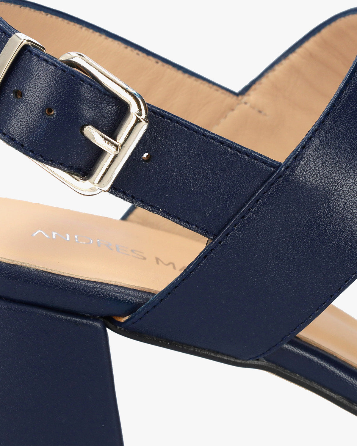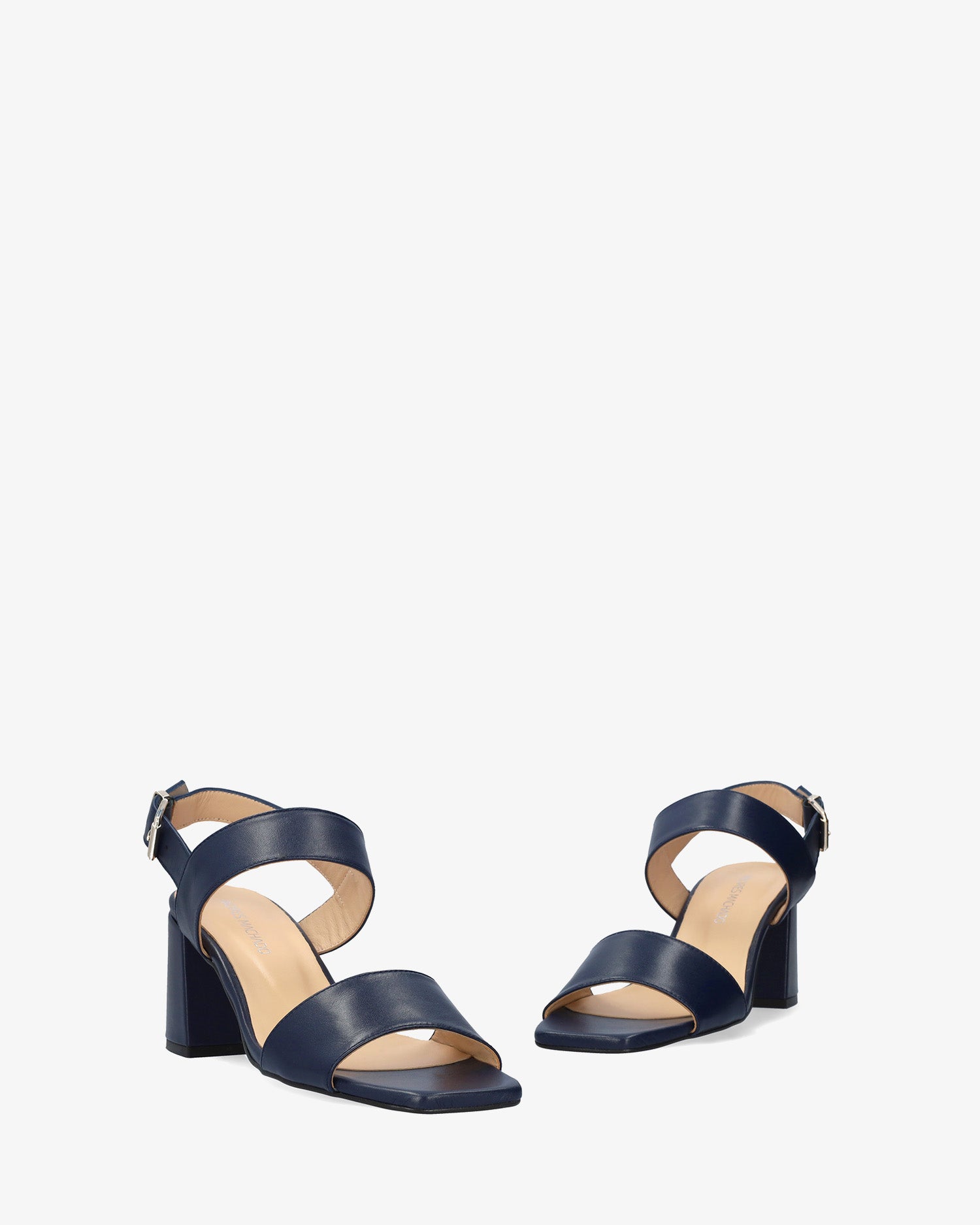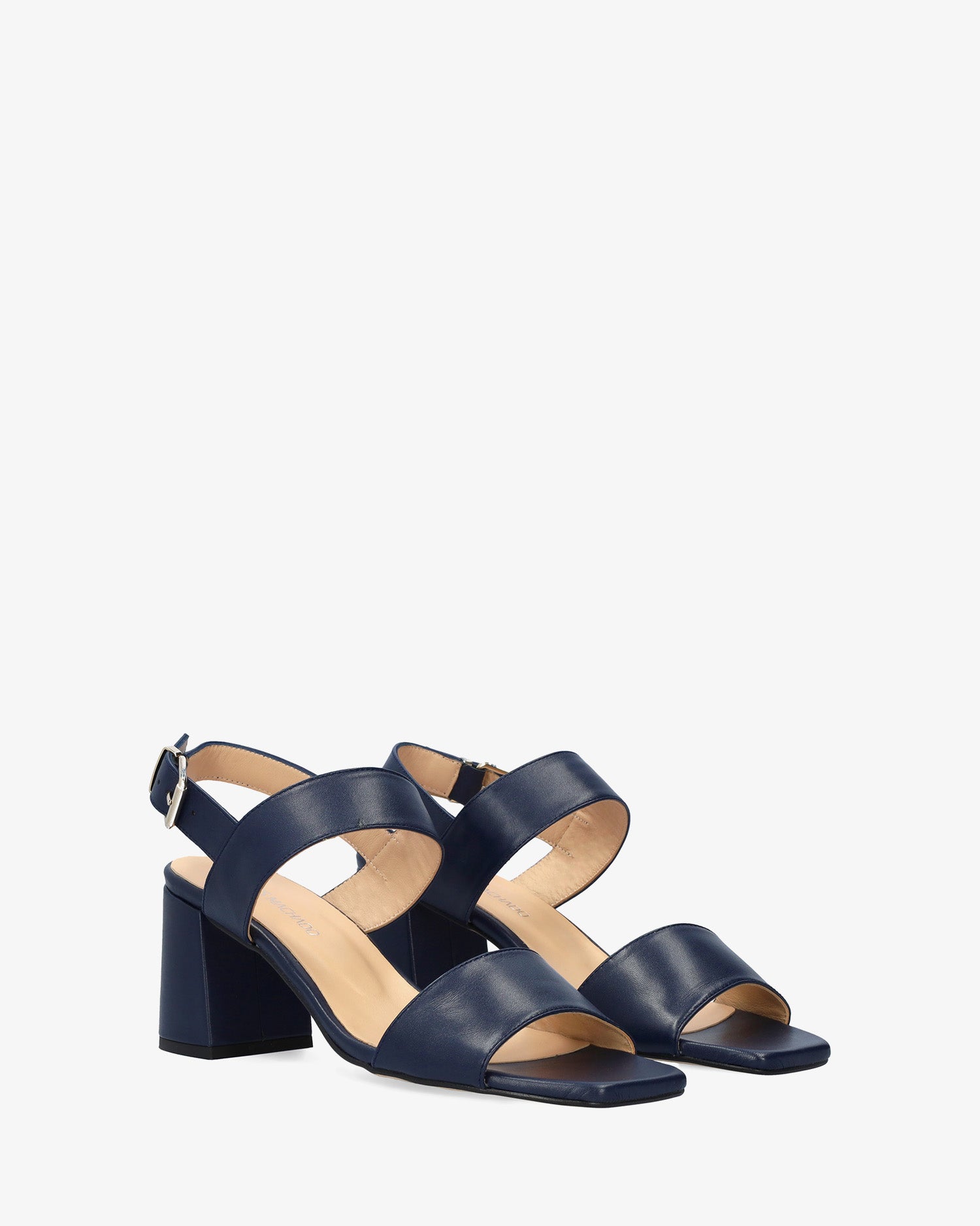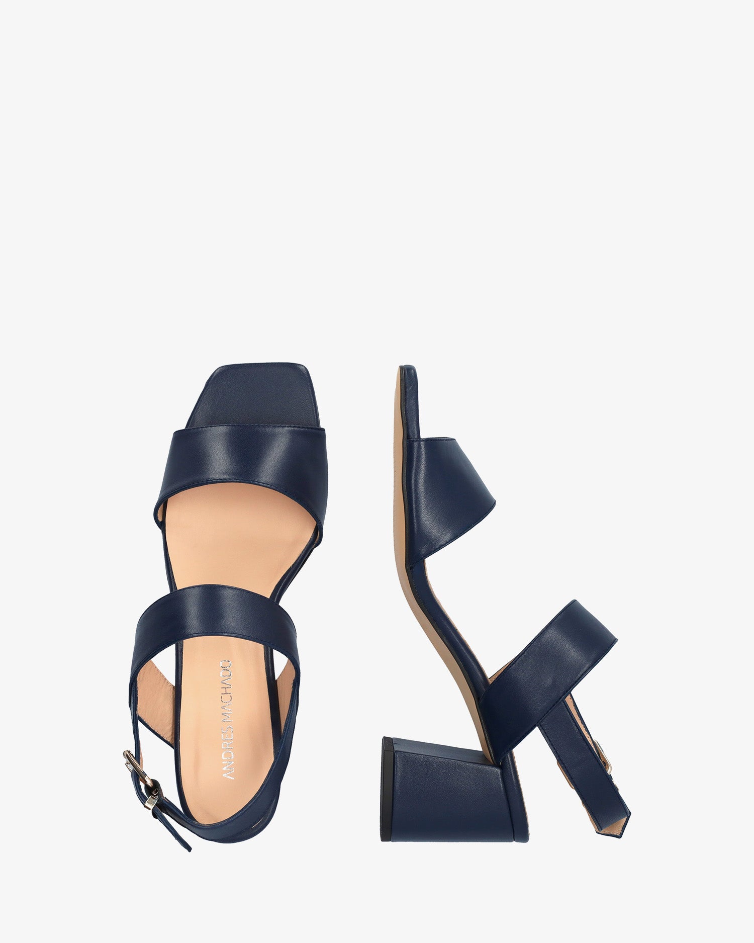 Sandale en cuir de couleur Bleu Marin avec talon arrondi. Design avec de larges brides assorties à l'avant et sur le cou-de-pied. Fermeture par une boucle métallique sur le côté. Bout ouvert et carré. Doublure intérieure en cuir beige. Talon doublé au même ton mesurant 6,5 cm pour les petites pointures (32 à 35) et 7 cm pour les grandes pointures (42 à 45). Fabriqué en Espagne.
