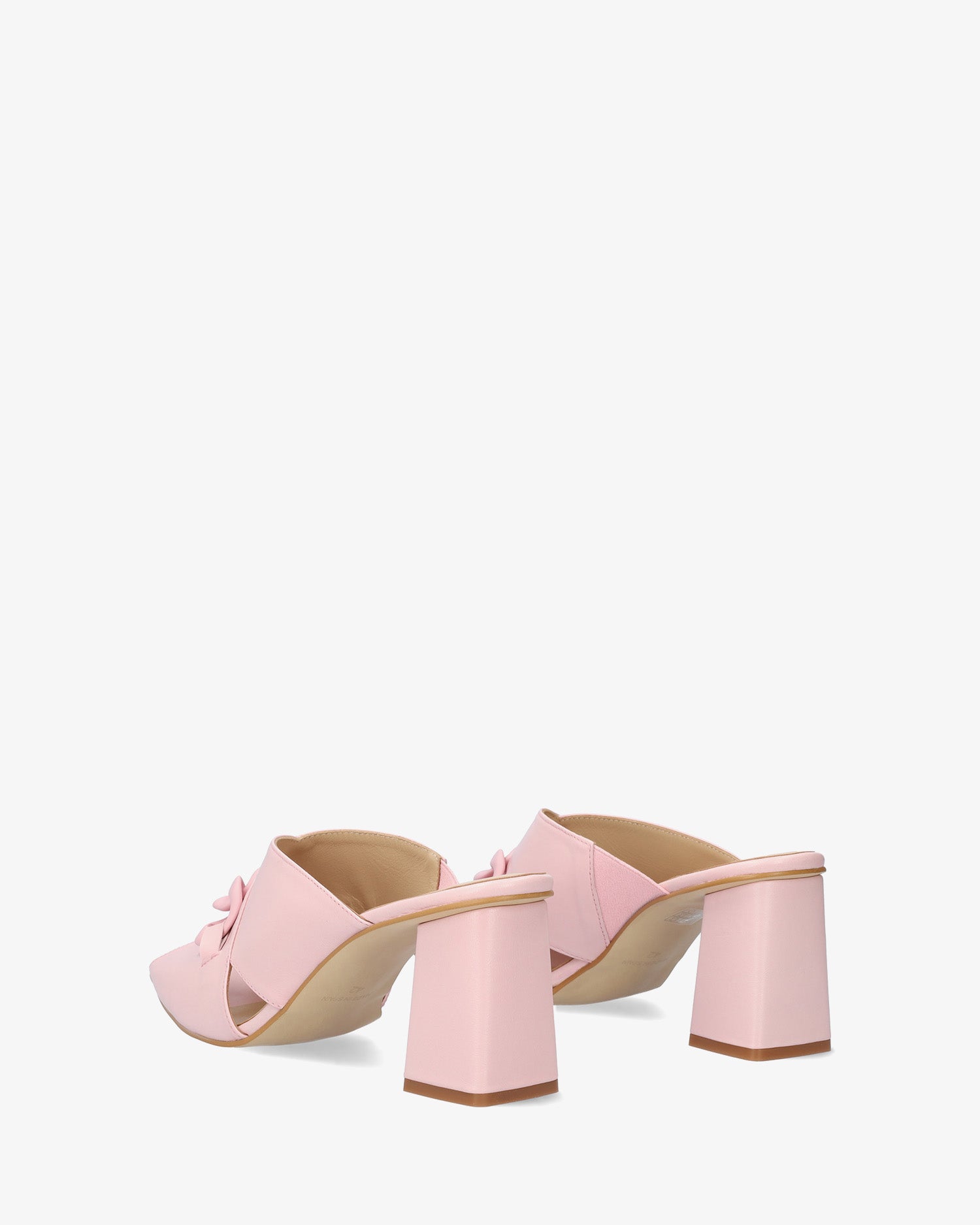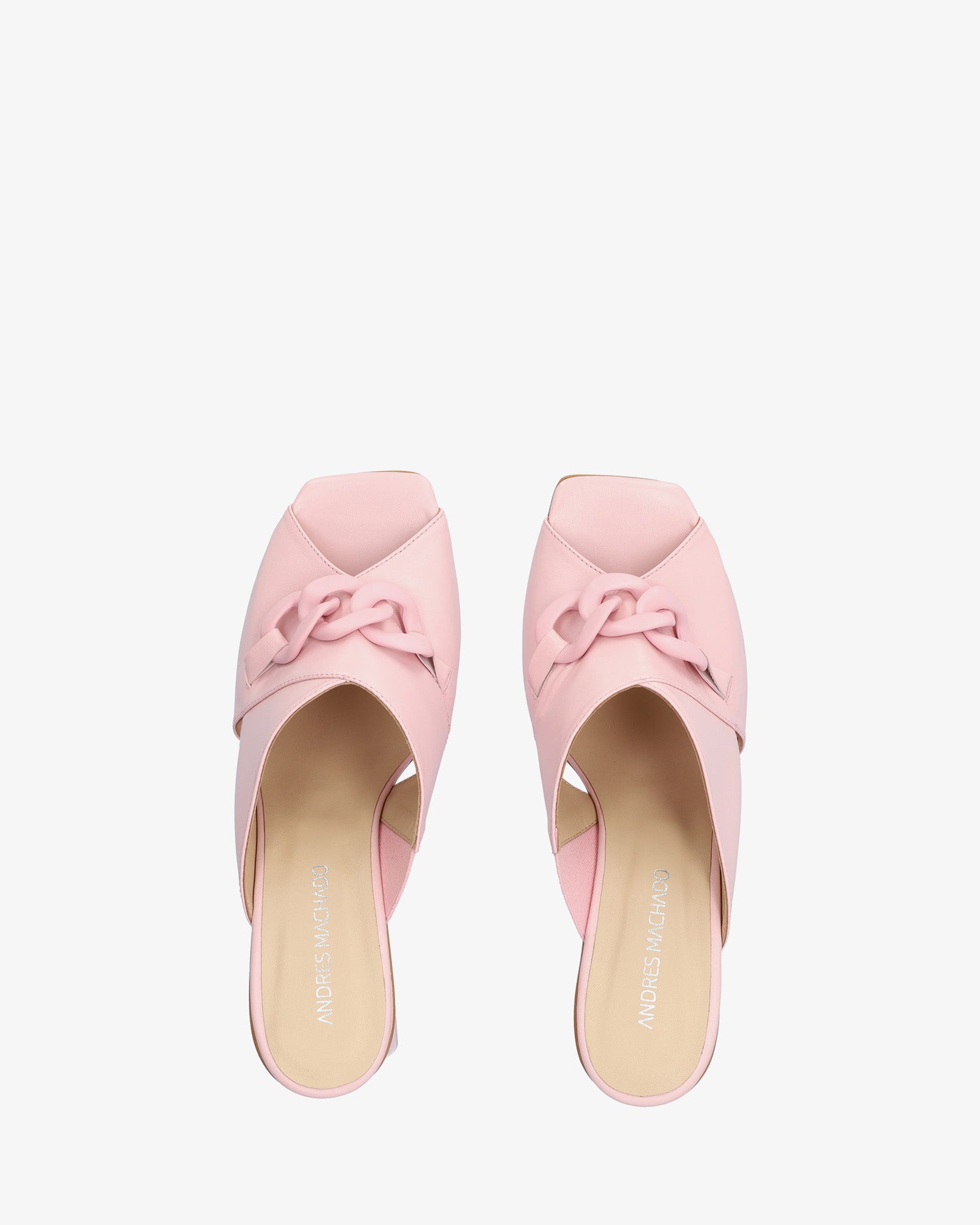 Sandales à talon couleur rose en cuir. Modèle à bout carré avec deux larges brides croisées et maxi chaîne entrelacée sur le cou-de-pied. Talon carré de 7,5cm pour les pointures du 32 au 35. Talon de 9cm pour les pointures du 42 au 45. Fabriquée en Espagne