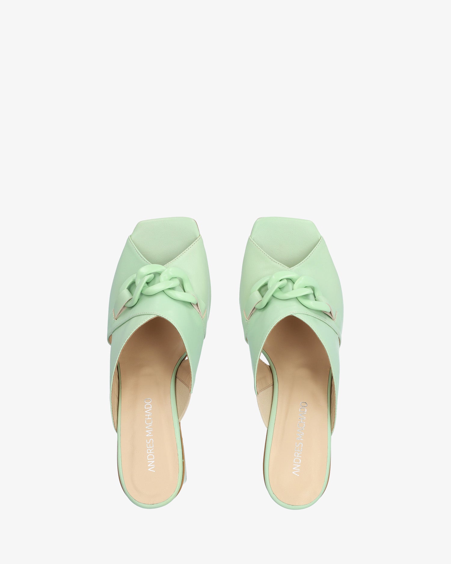 Sandales à talon couleur verte en cuir. Modèle à bout carré avec deux larges brides croisées et maxi chaîne entrelacée sur le cou-de-pied. Talon carré de 7,5cm pour les pointures du 32 au 35. Talon de 9cm pour les pointures du 42 au 45. Fabriquée en Espagne