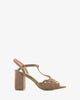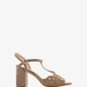 Sandales T-Bar avec tige ajourée sur le devant. Tige en suédine de couleur Terre. Fermeture par bride à boucle sur la cheville. Talon large revêtus carré de 8,5 cm de haut pour les petites pointures du 32 au 35. Talon large de 9,5 cm de haut pour les grandes pointures du 42 au 45.