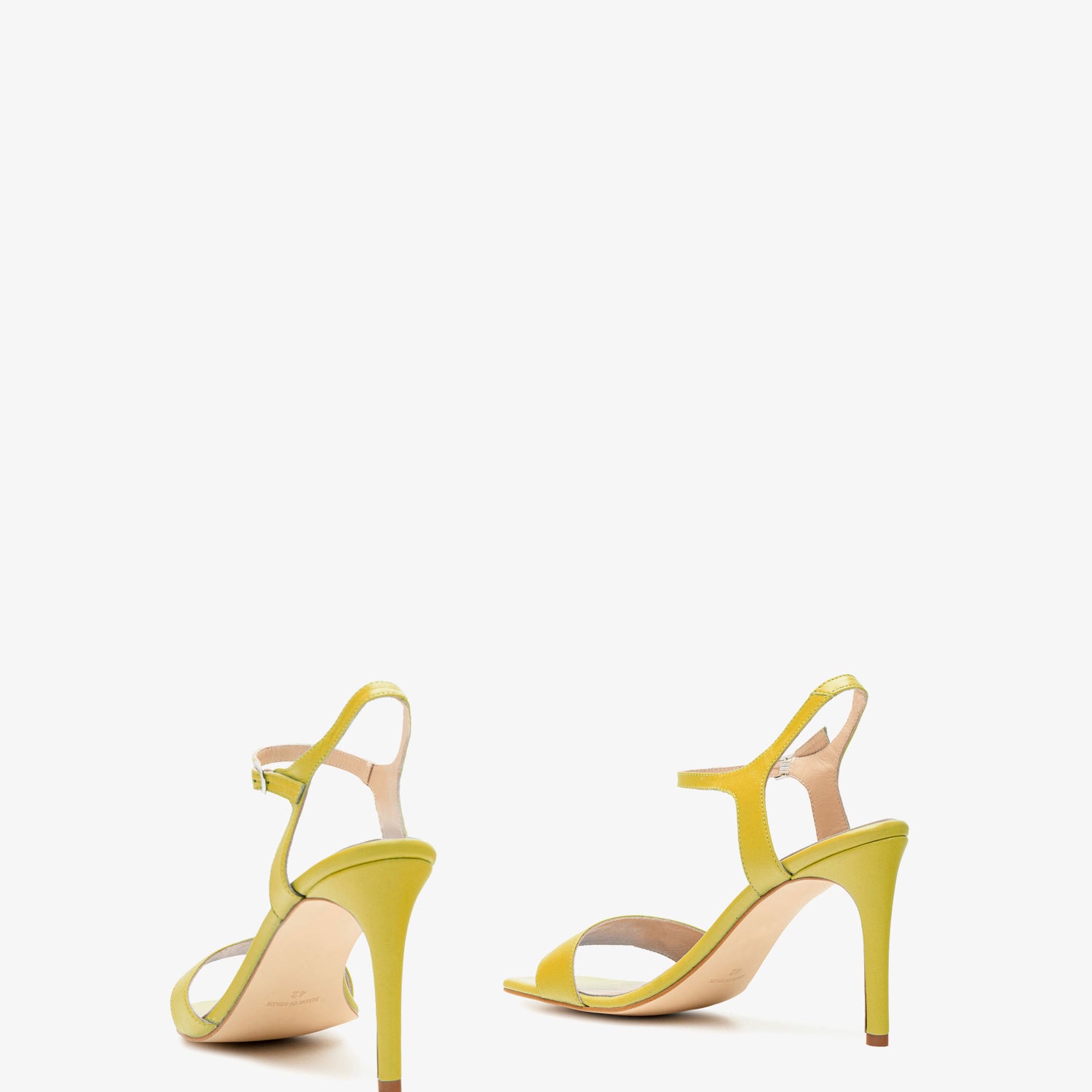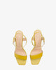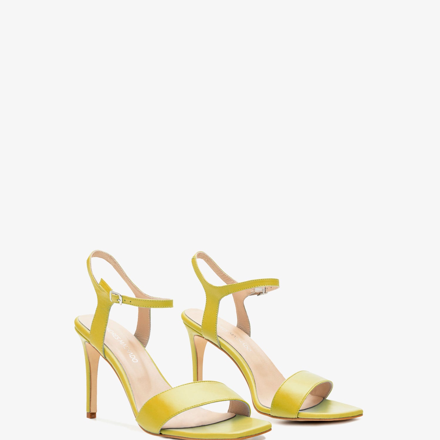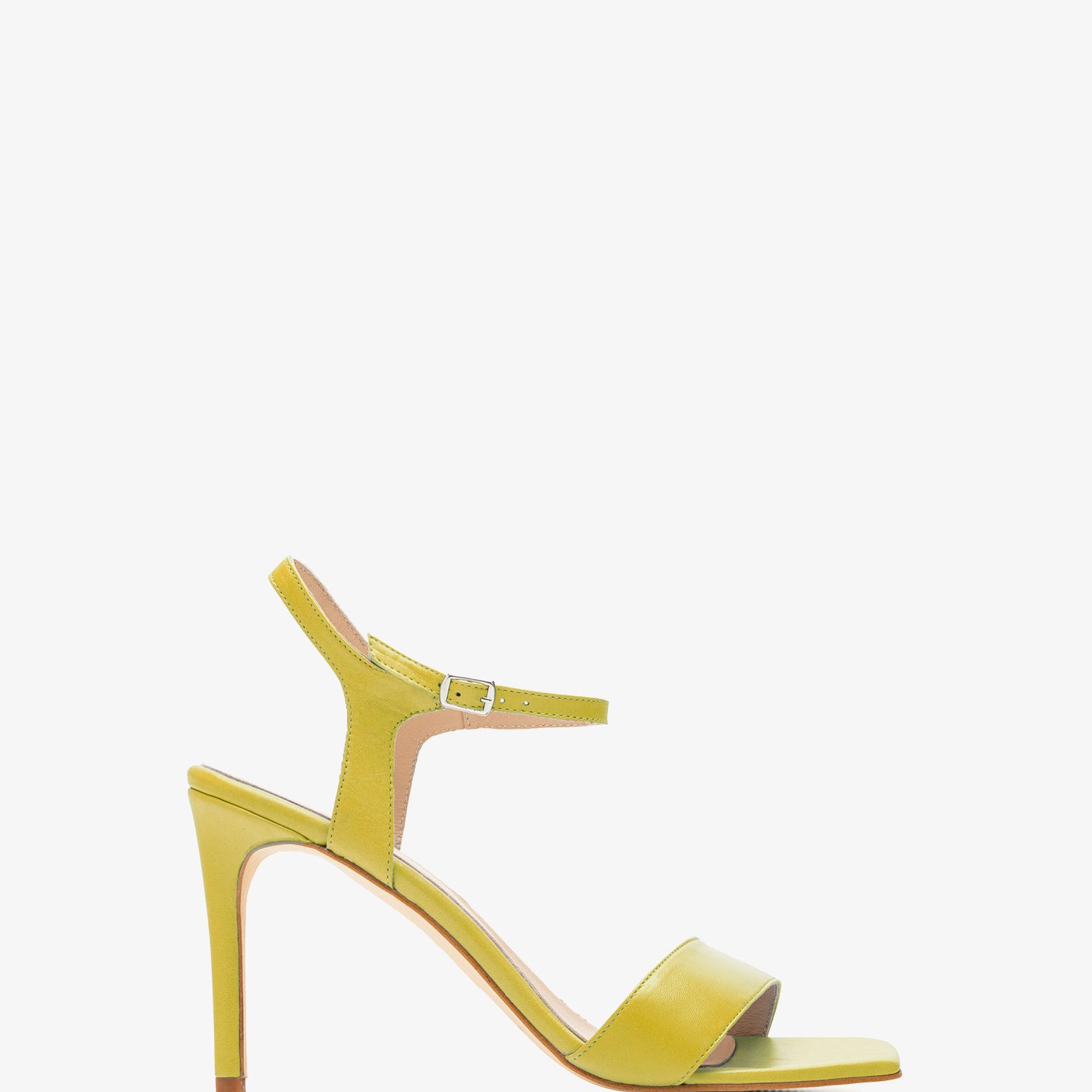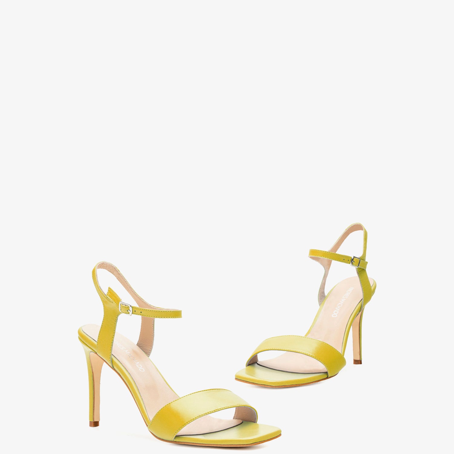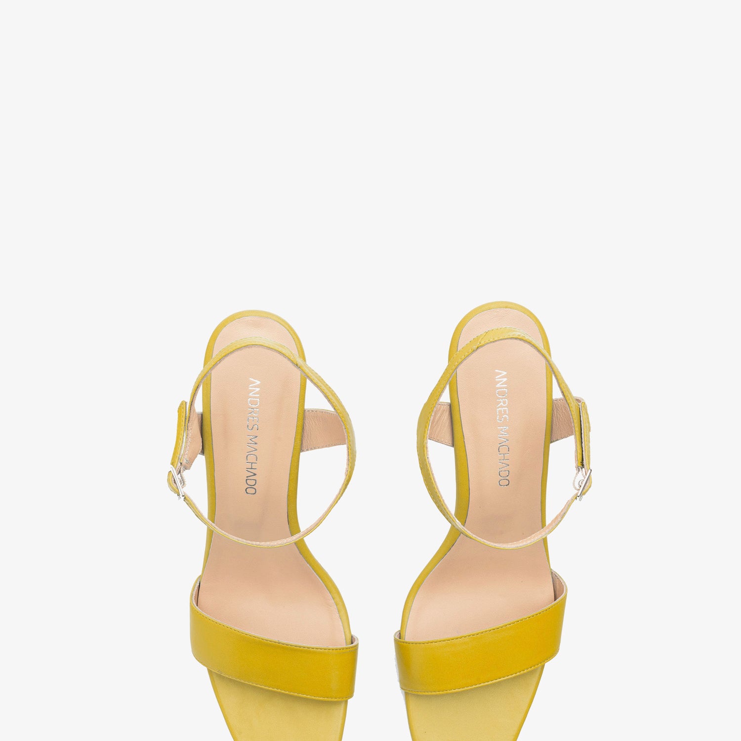 Sandales en cuir de couleur jaune. Bride large au même ton au-devant. Fermeture para bride à boucle sur la cheville. Doublure en cuir. Talons fins au même ton de 9 cm de haut pour les petites pointures du 32 au 35. Talons de 10 cm pour les grandes pointures du 42 au 45. Fabrication espagnole.