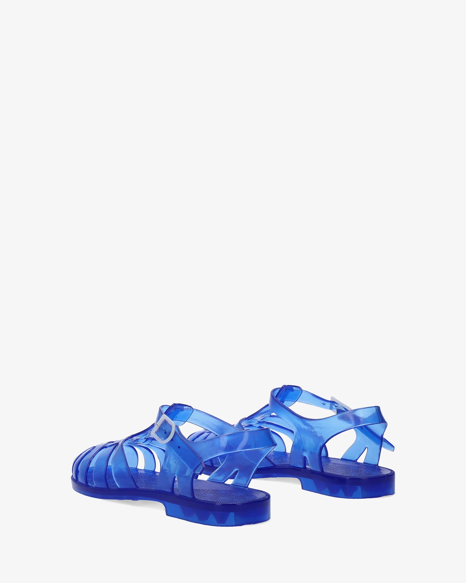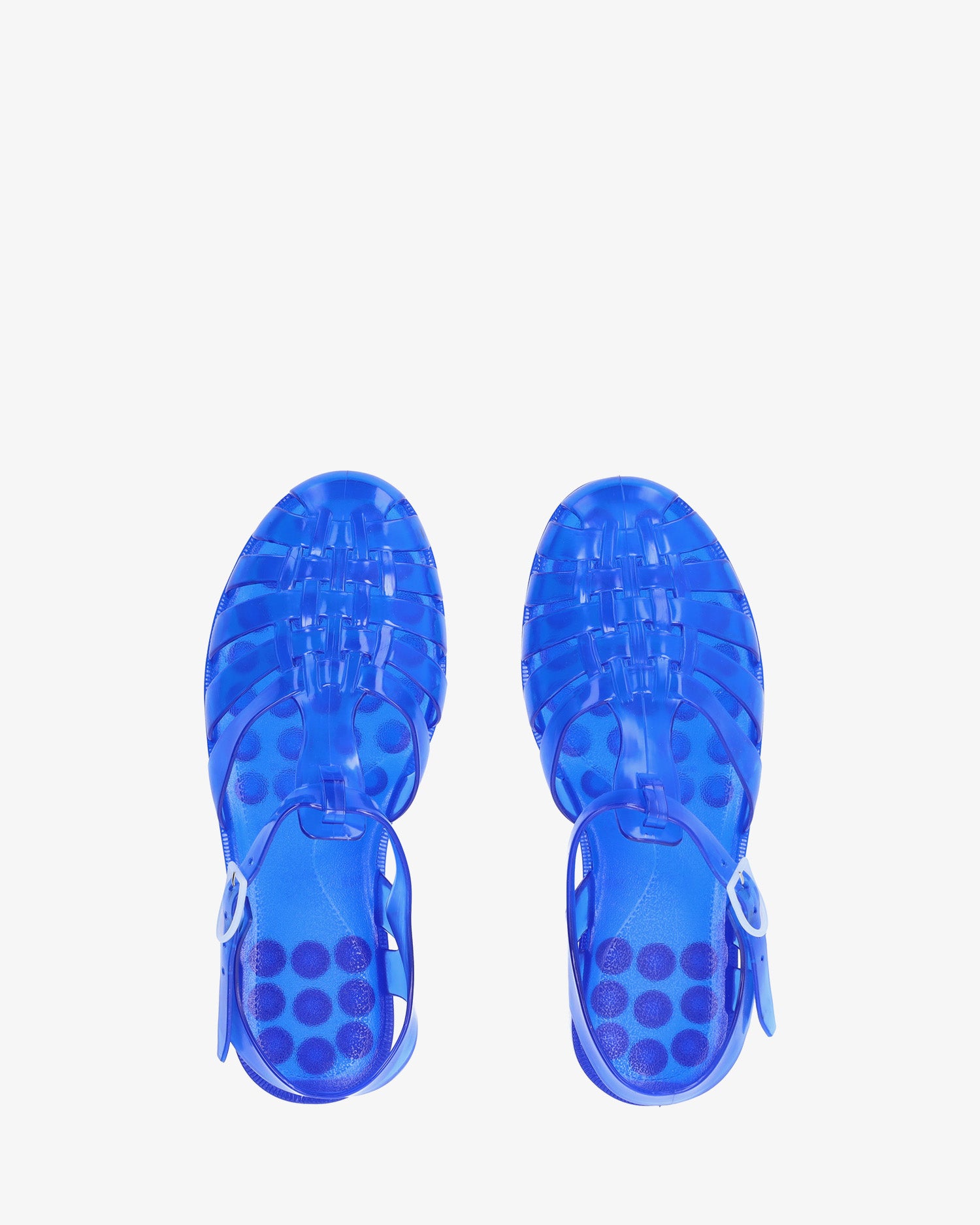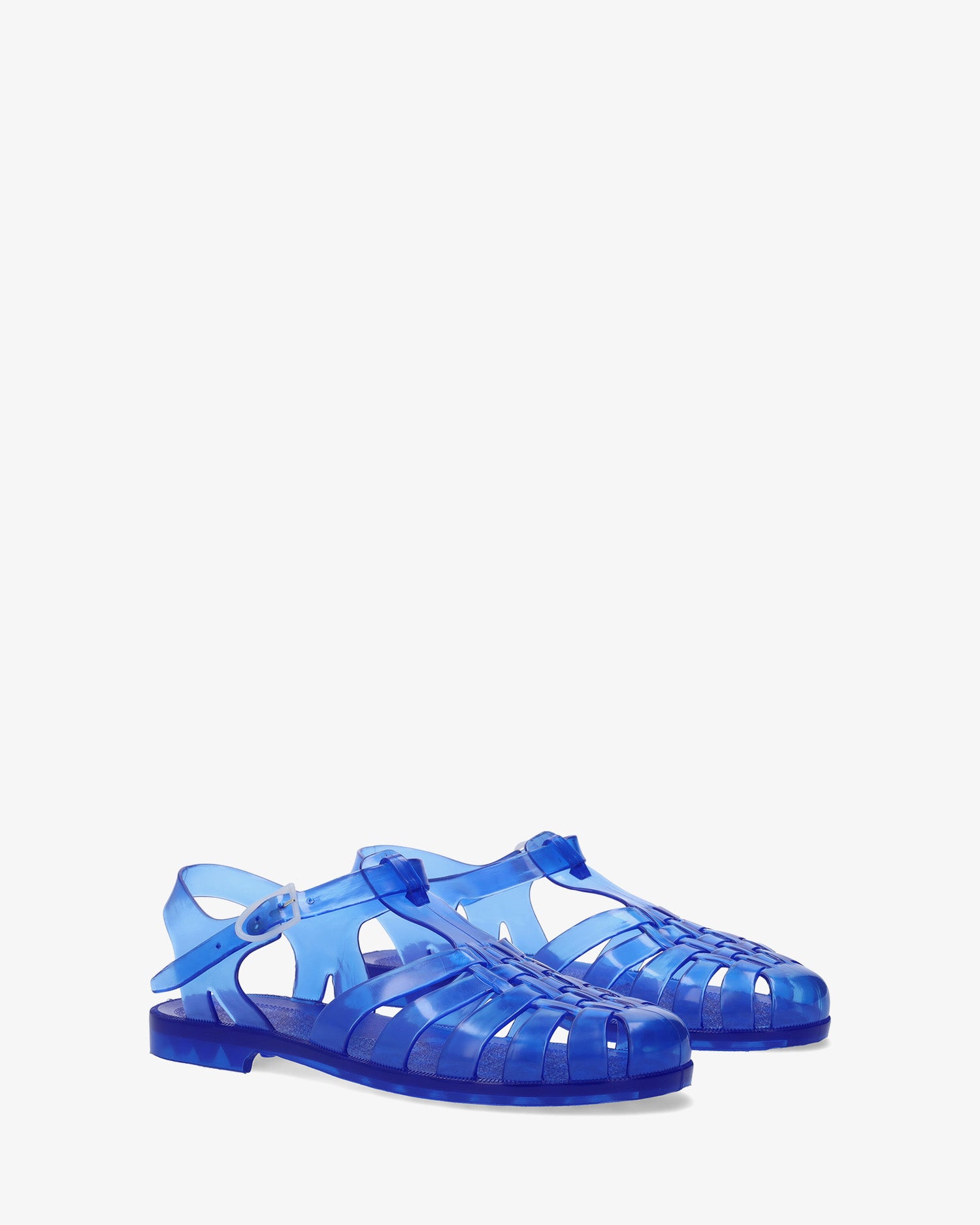 Sandales en plastiques bleu foncé translucide.Les mythiques sandales en plastiques de notre enfance reviennent en couleur cet été!!!