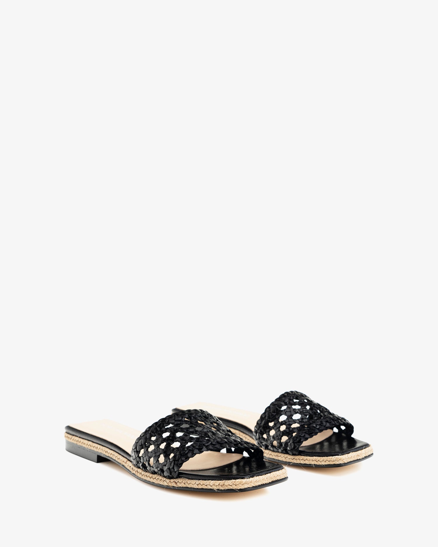 Sandales plates en cuir de couleur noir. Design de lanière large en cuir tressée de couleur noir sur le cou de pied. Finition à bout carré. Détail de semelle en jute. Toutes les pointures du 32 au 45. Fabriquées en Espagne.