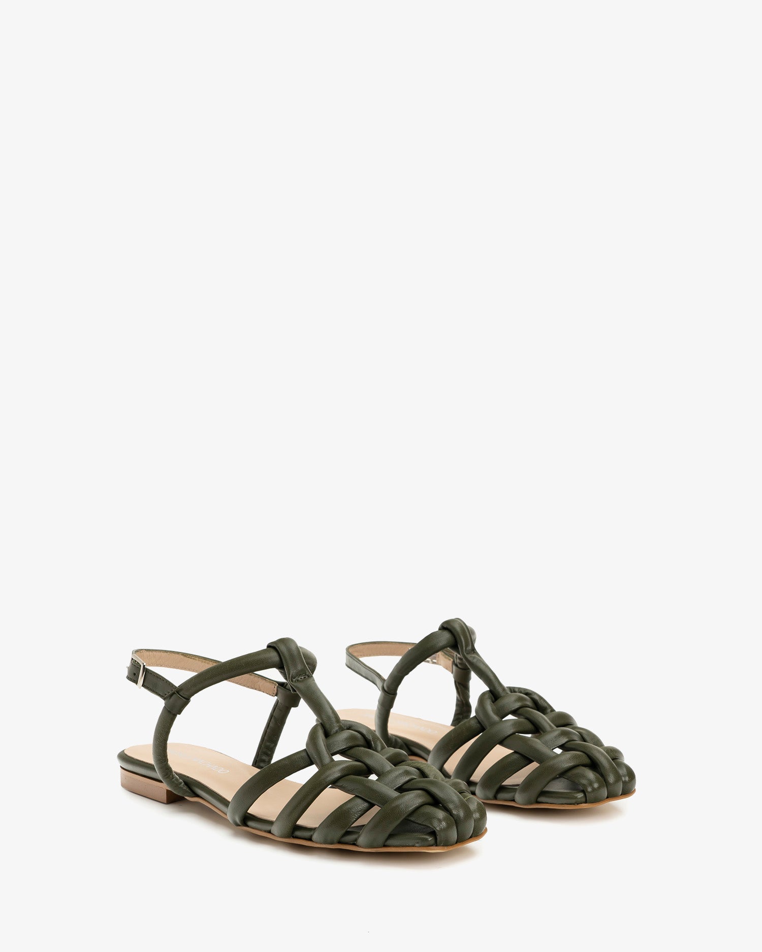 Sandales plates en cuir Kaki. Sandales de style pêcheur avec des lanières tubulaires entrelacées. Lanières tubulaires dans la partie d´arrière et fermeture à boucle. Bout carré. Toutes les pointures du 32 au 45. Fabriquées en Espagne.