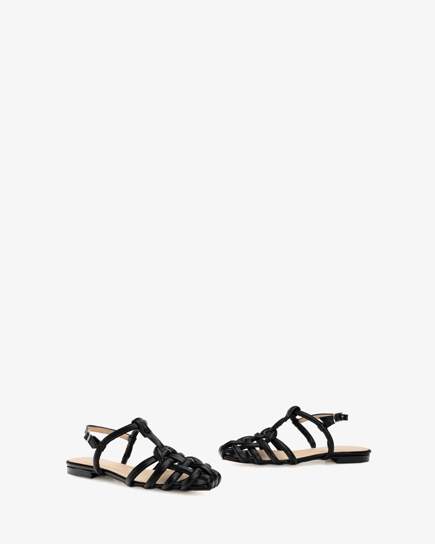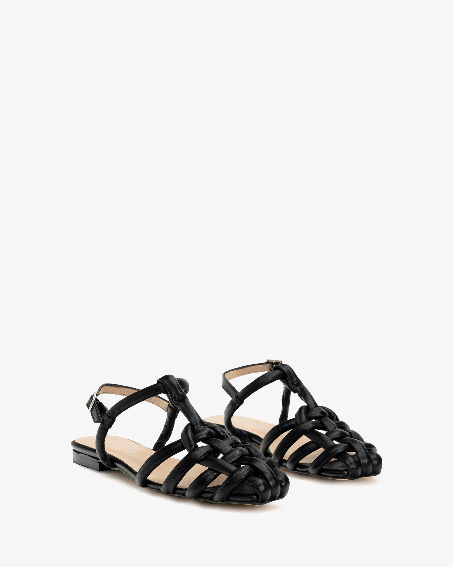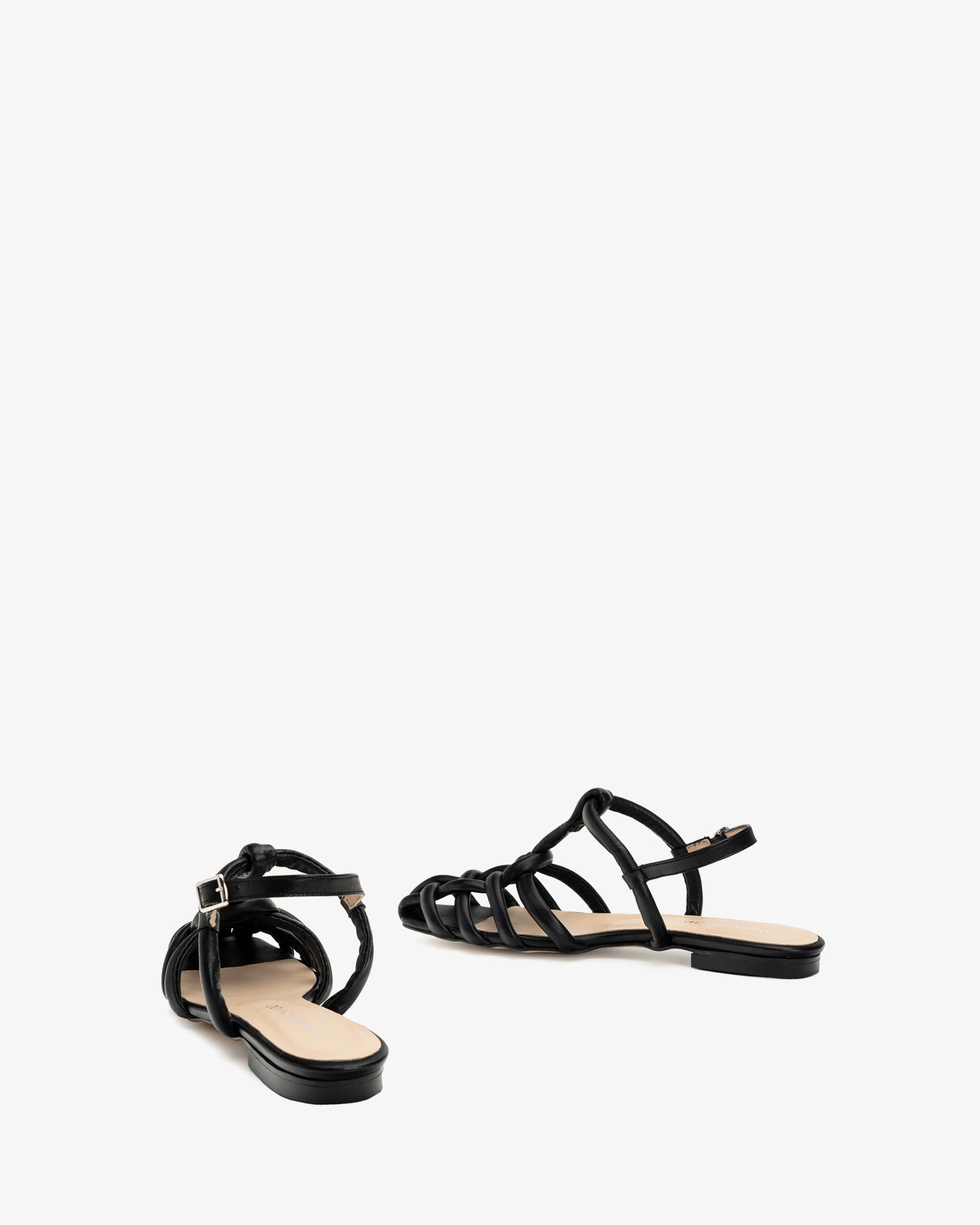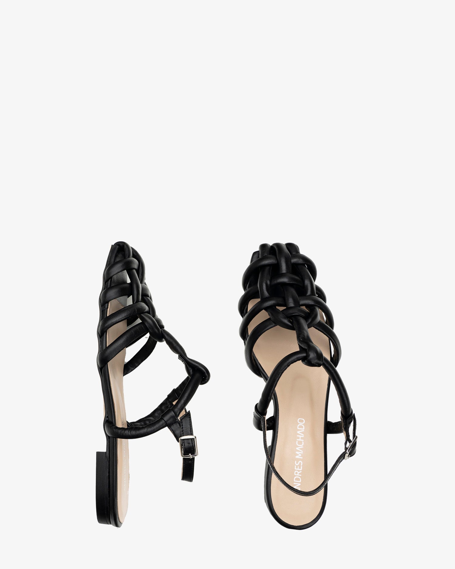Sandales plates en cuir Noir. Sandales de style pêcheur avec des lanières tubulaires entrelacées. Lanières tubulaires dans la partie d´arrière et fermeture à boucle. Bout carré. Toutes les pointures du 32 au 45. Fabriquées en Espagne.