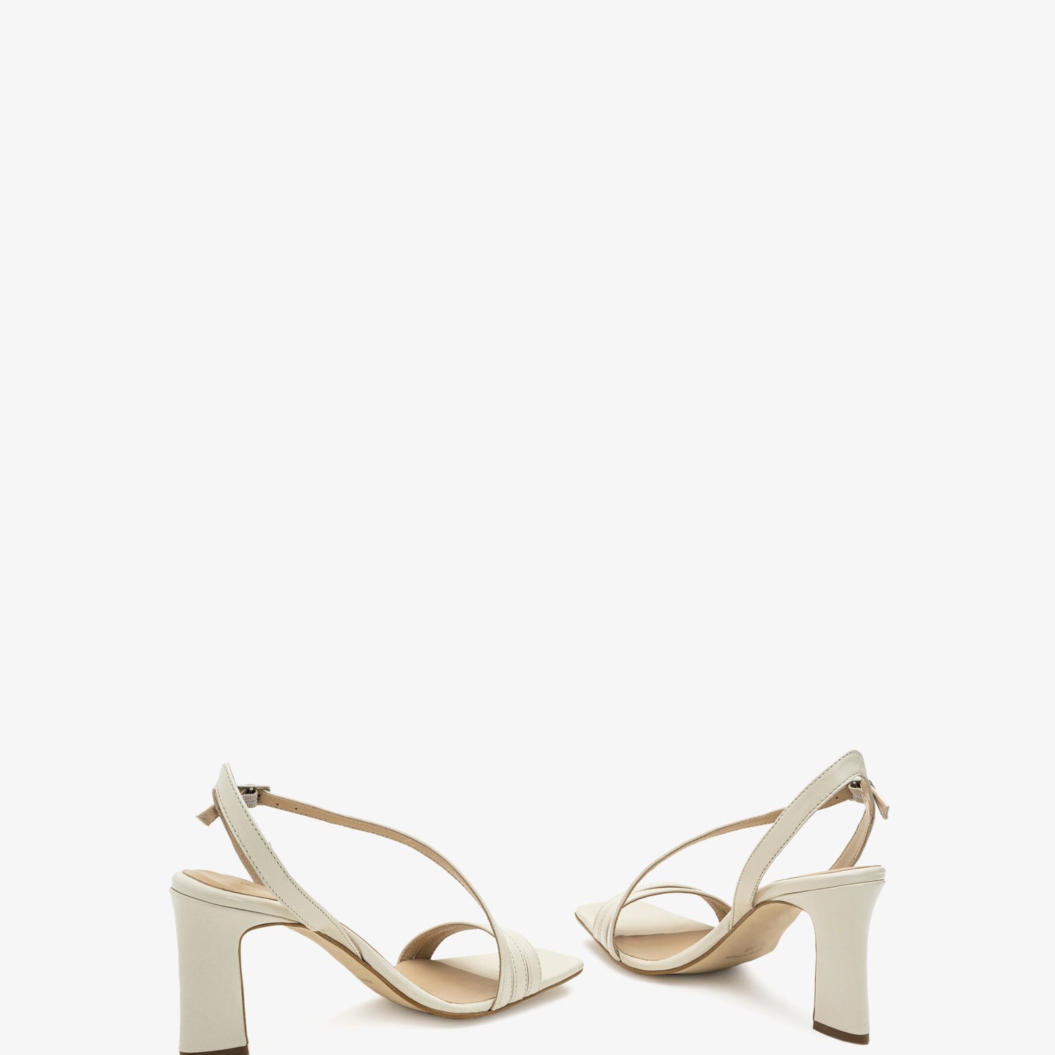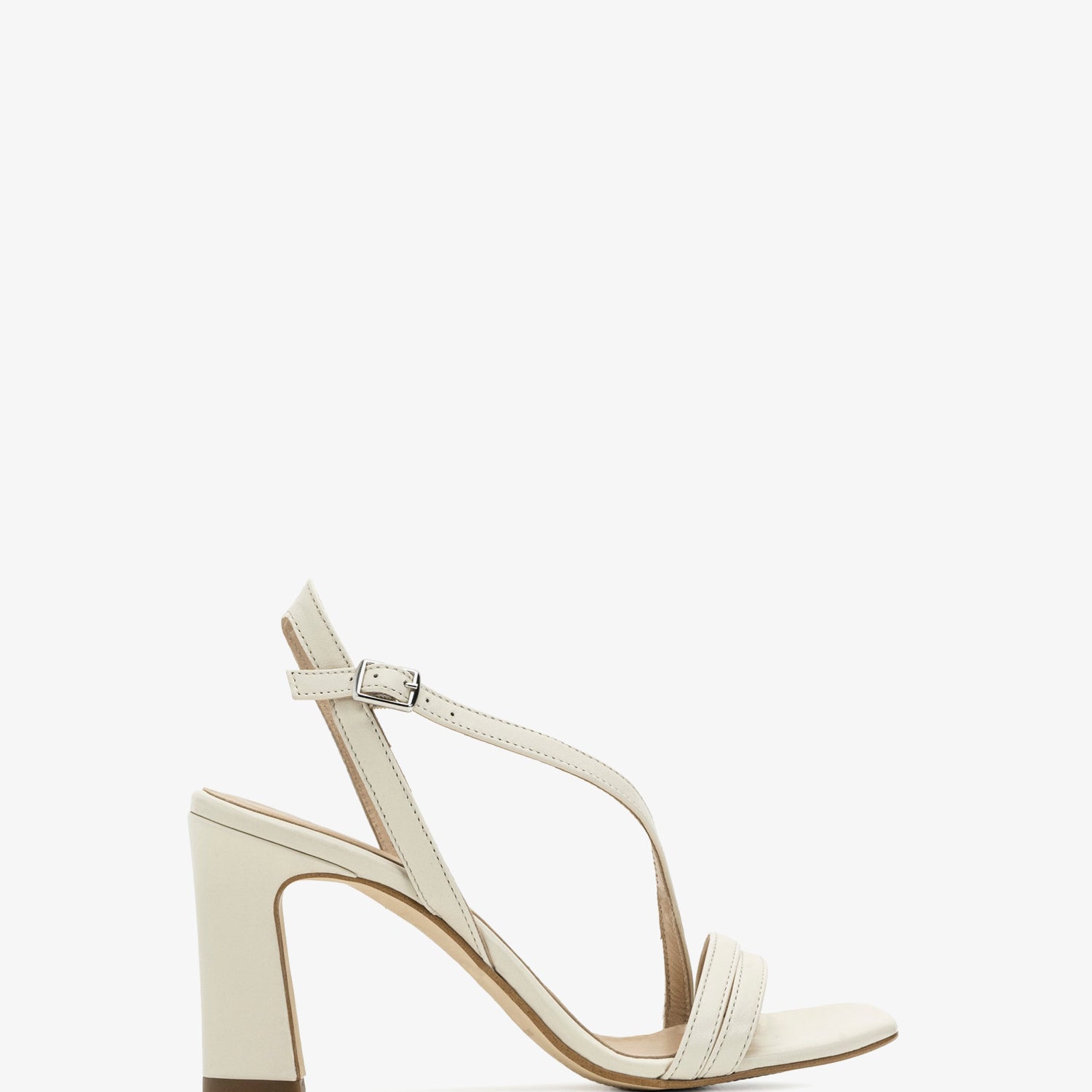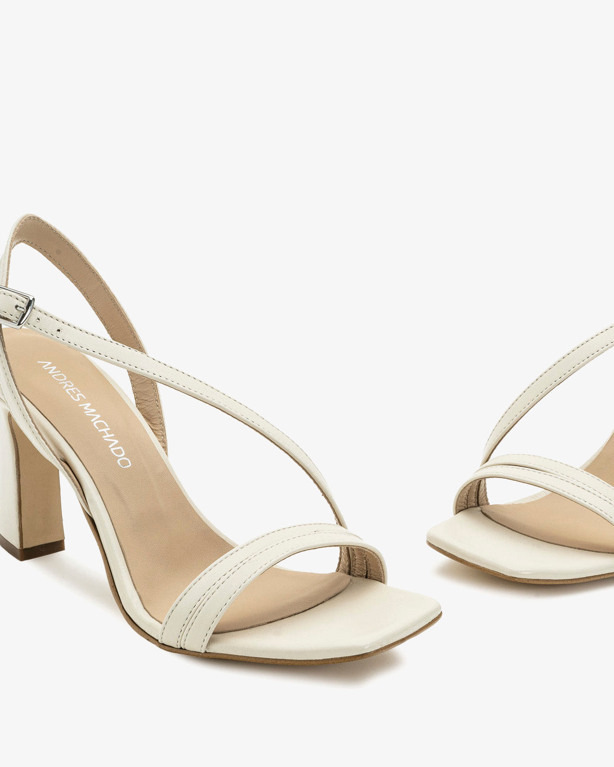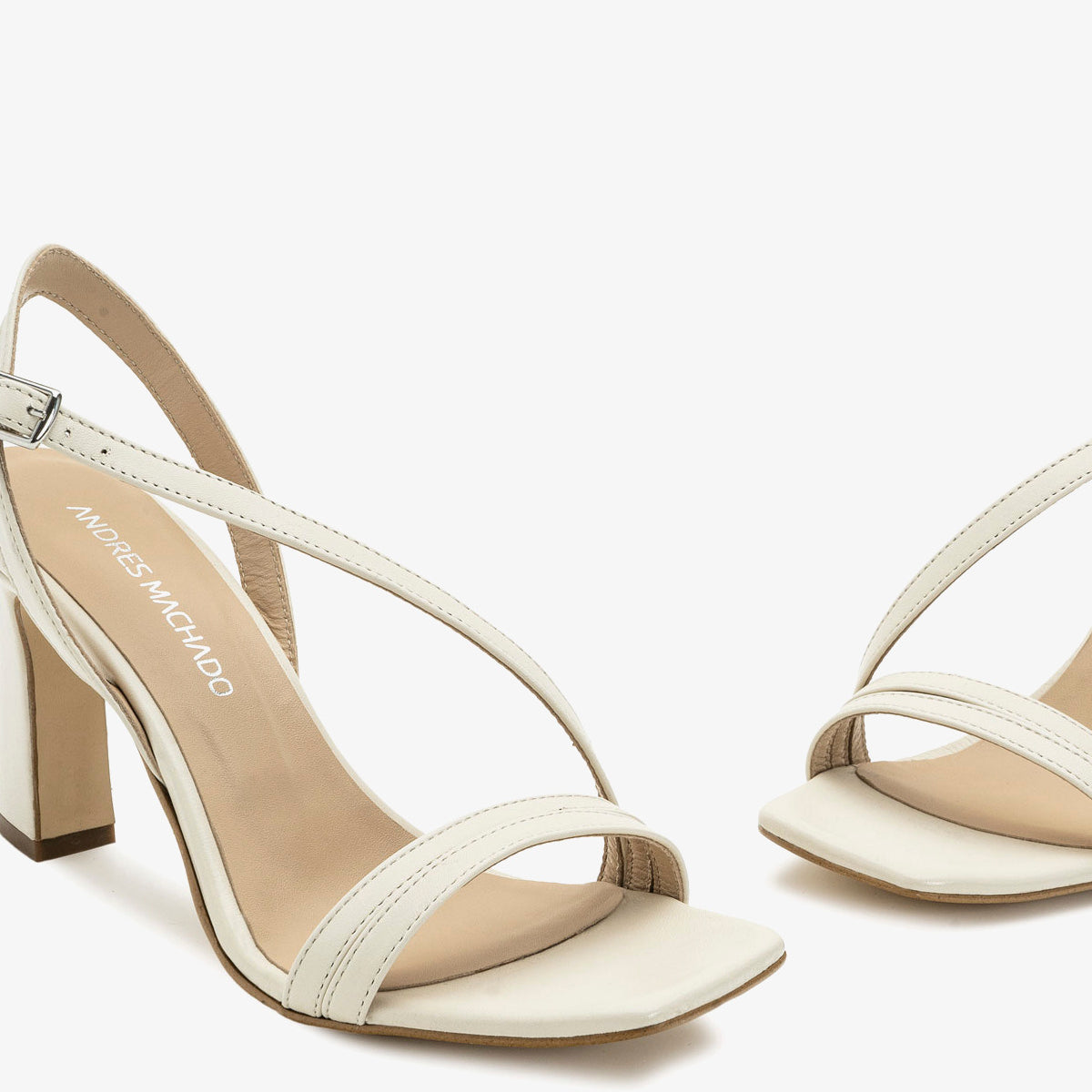 Sandales en cuir de couleur crème. Détail de deux brides fines sur le devant et bride diagonale au même ton. Fermeture para boucle avec élastique unie à la bride de la partie de derrière. Bout ouvert et carré. Semelle intérieure en cuir. Talons larges revêtus au même ton de 9 cm de haut pour les petites pointures du 32 au 35. Talons larges revêtus au même ton de 10 cm de haut pour les grandes pointures du 42 au 45. Fabrications espagnole.