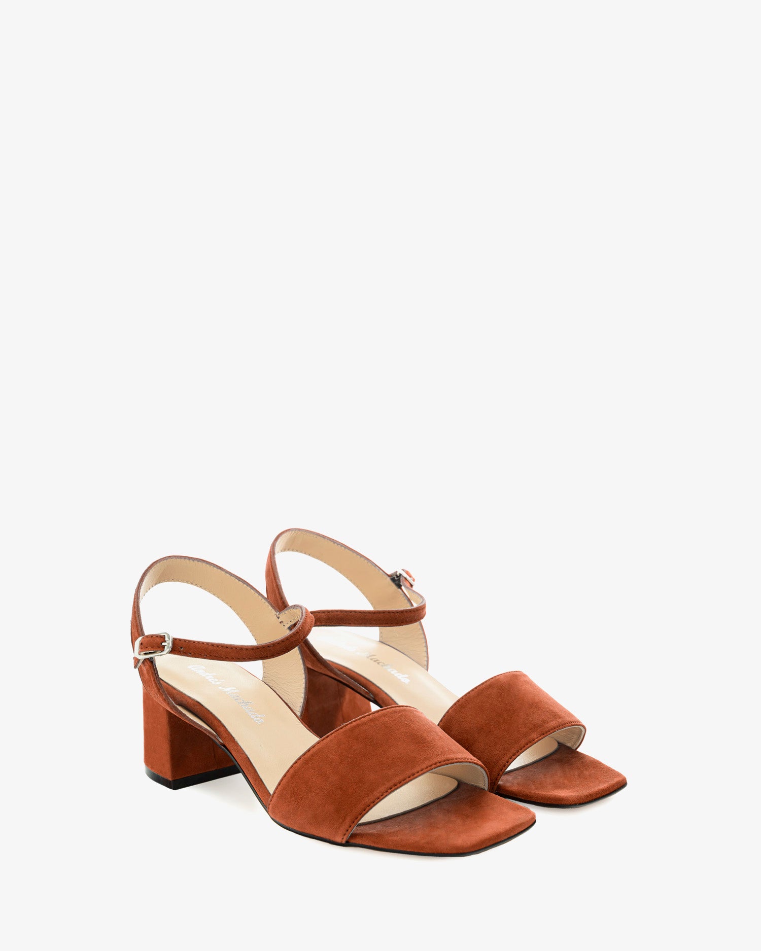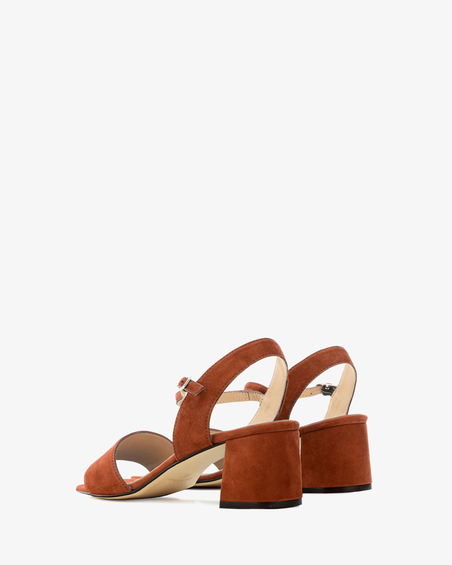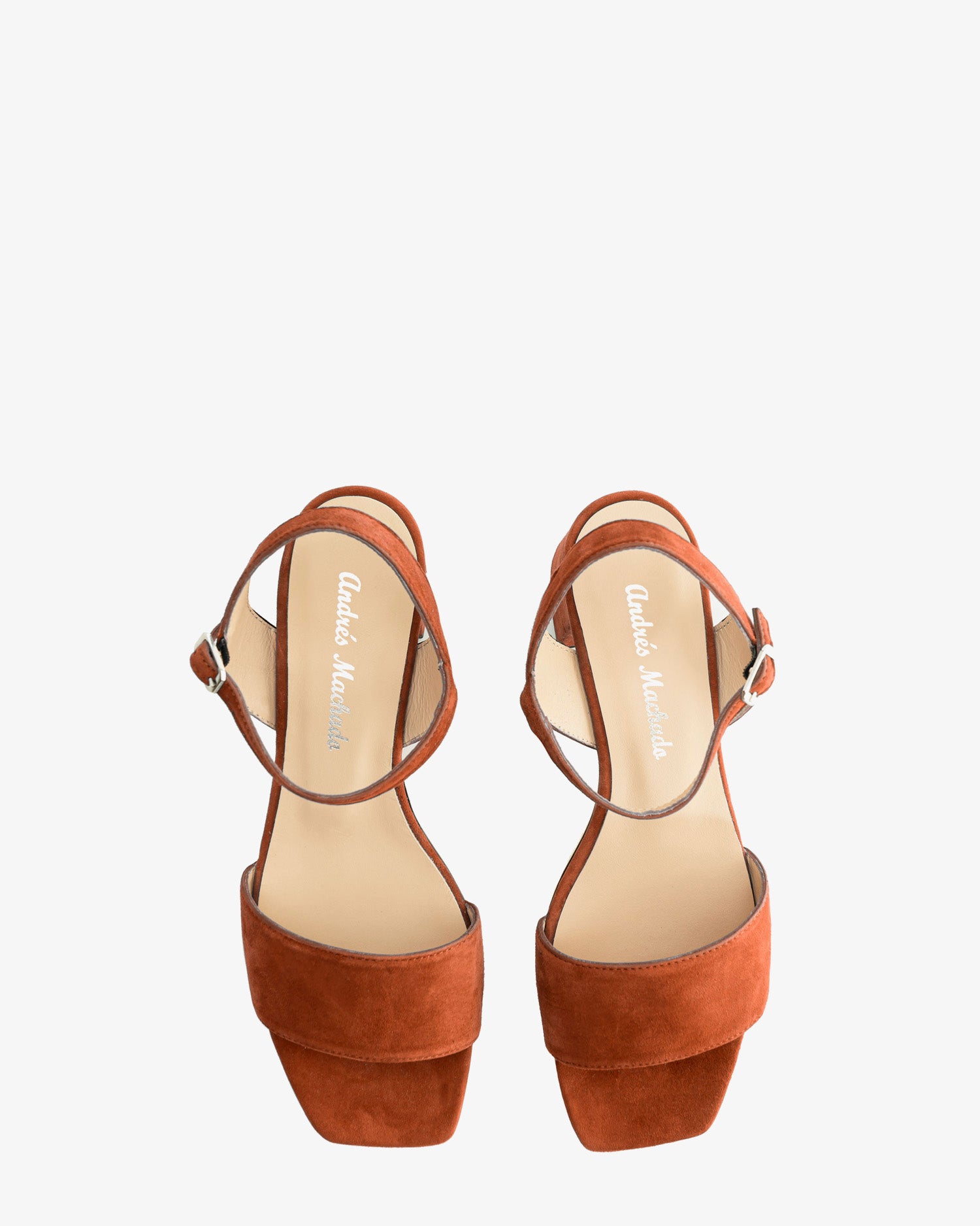 Sandales en Daim de couleur Brique. Lanière large au même ton sur le bout. Fermeture en boucle à bracelet à la cheville. Doublure en cuir et bout carré. Talons larges revêtus au même ton de 5 cm pour les petites pointures du 32 au 35. Talons revêtus au même ton de 5,5 cm pour les grandes pointures du 42 au 45. Fabriquées en Espagne.