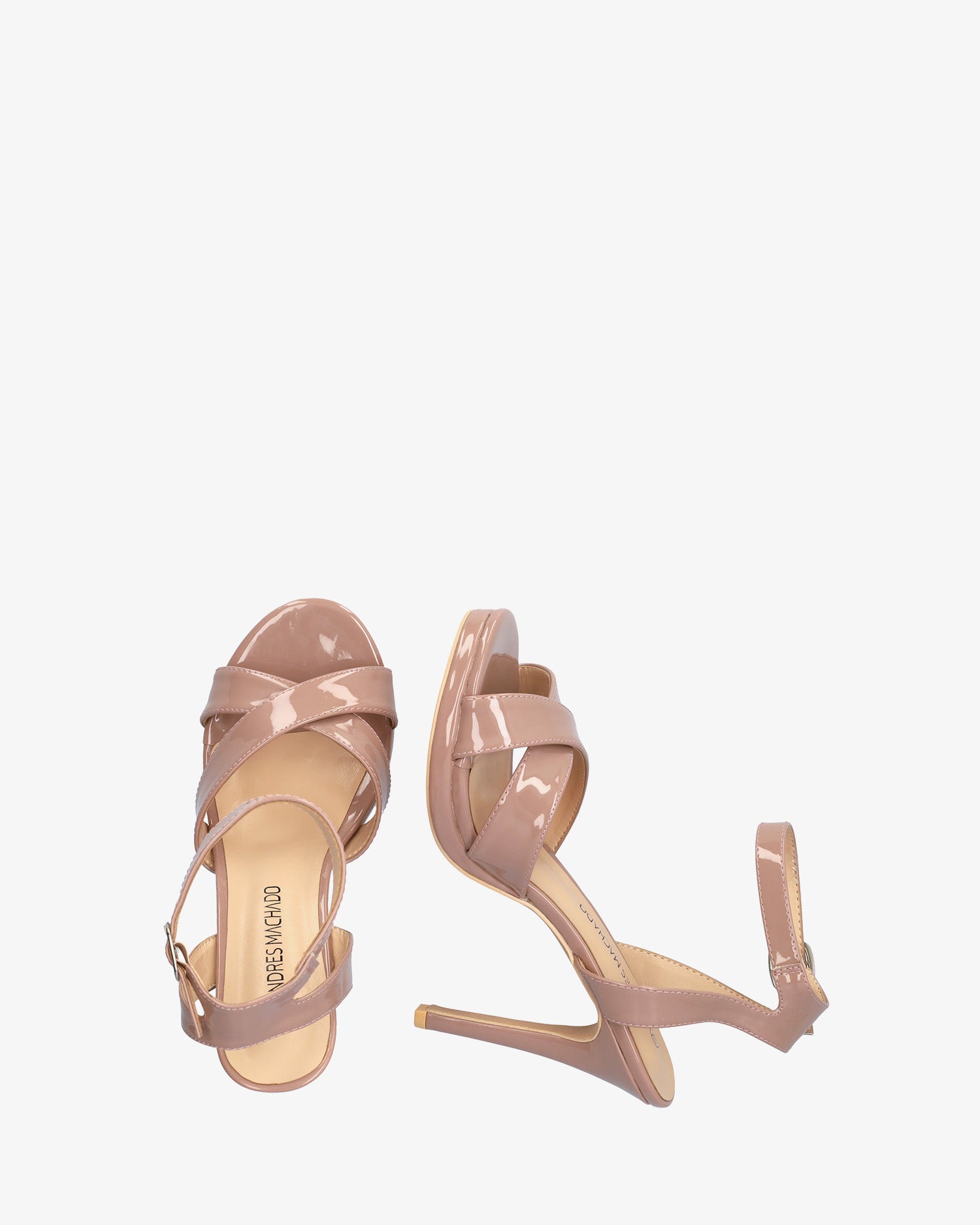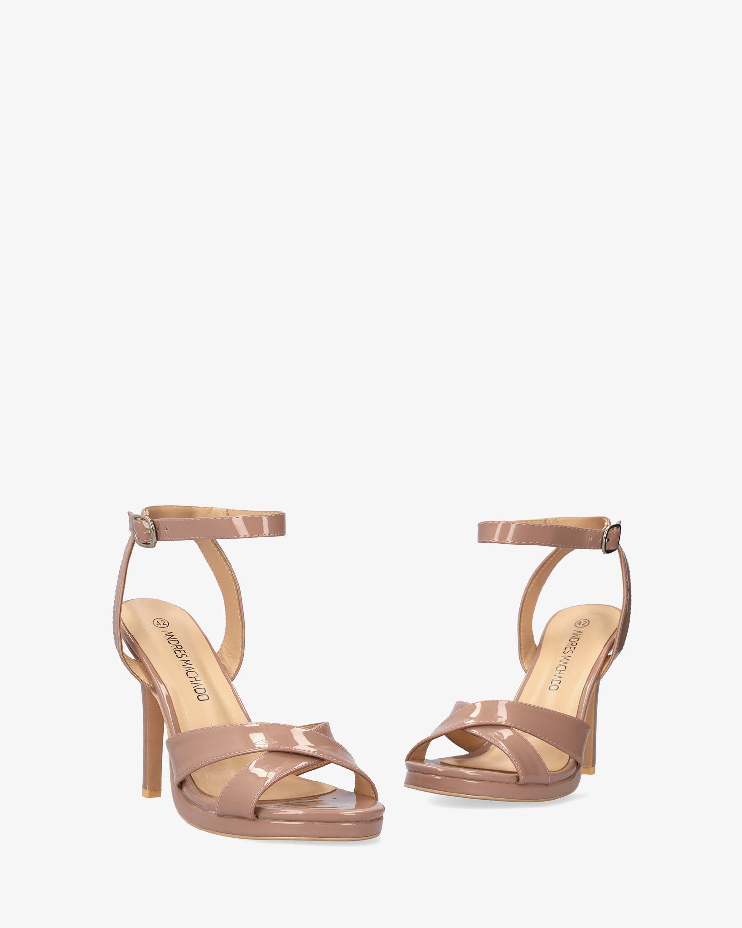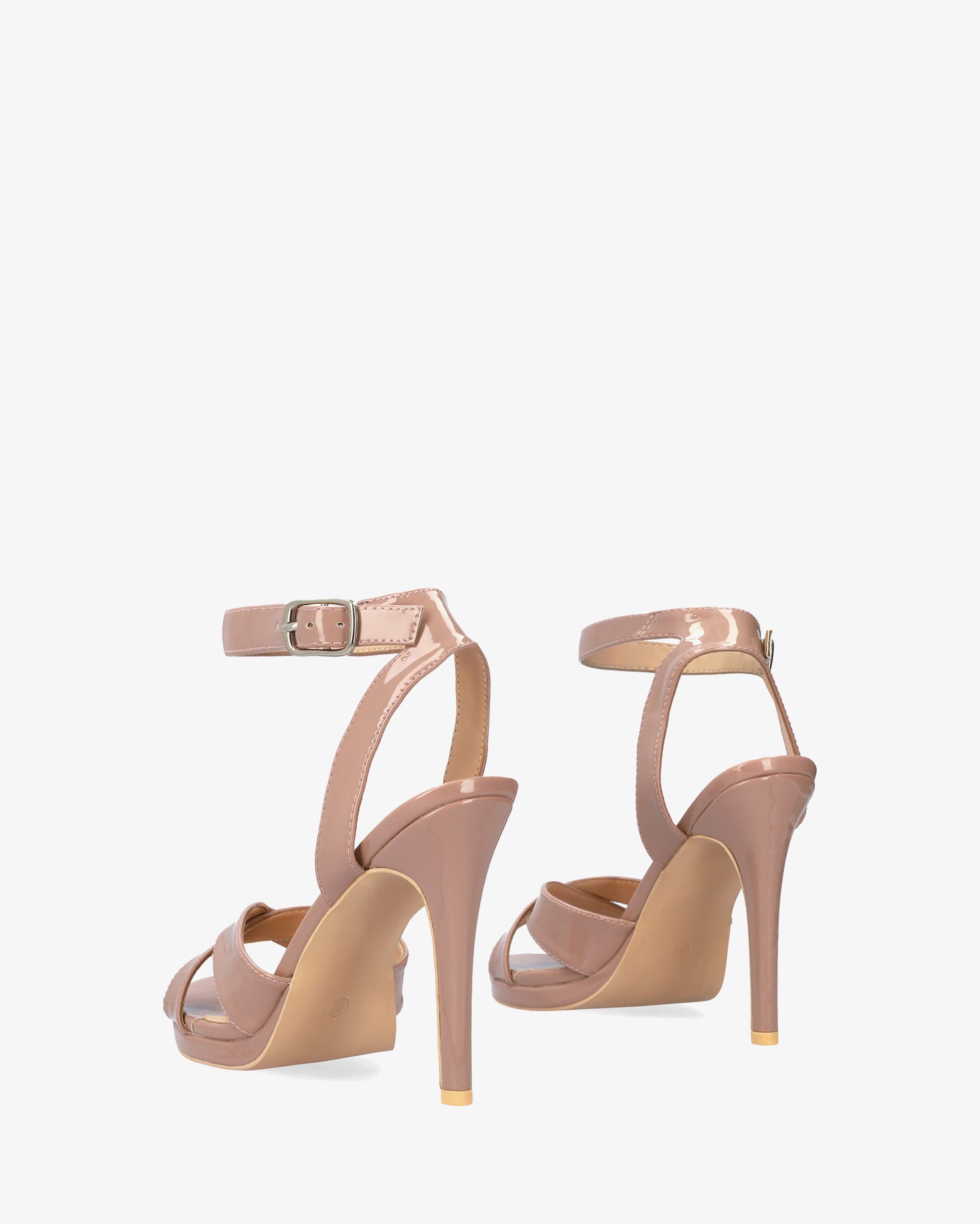 Sandales en vernis de couleur maquillage . Détail de lanières larges croisées sur la partie de devant. Femeture par boucle avec bracelet autour de la cheville du même ton. Bout arrondi ouvert. Talon et plateforme doublés au même ton. Talon de 10,5 cm et plateforme de 1 cm pour les petites pointures du 32 au 35. Talon de 13 cm et plateforme de 1,5 cm pour les grandes pointures du 42 au 45.