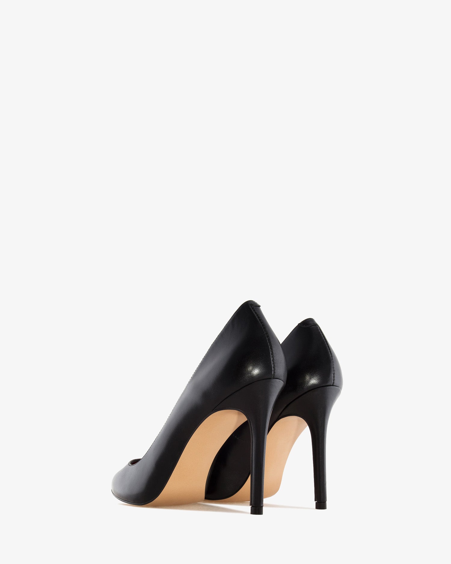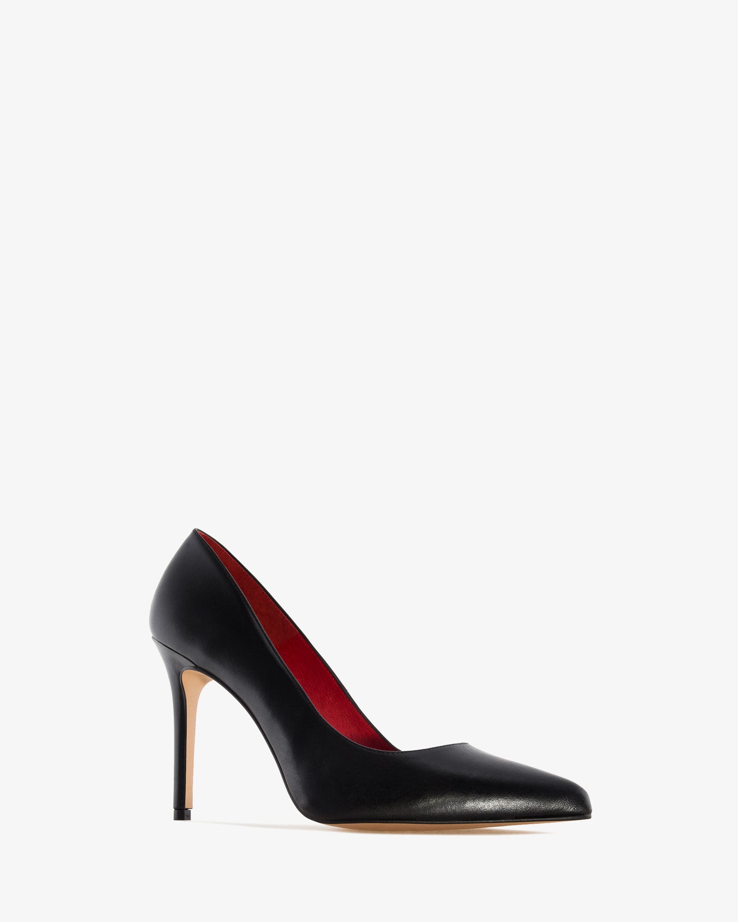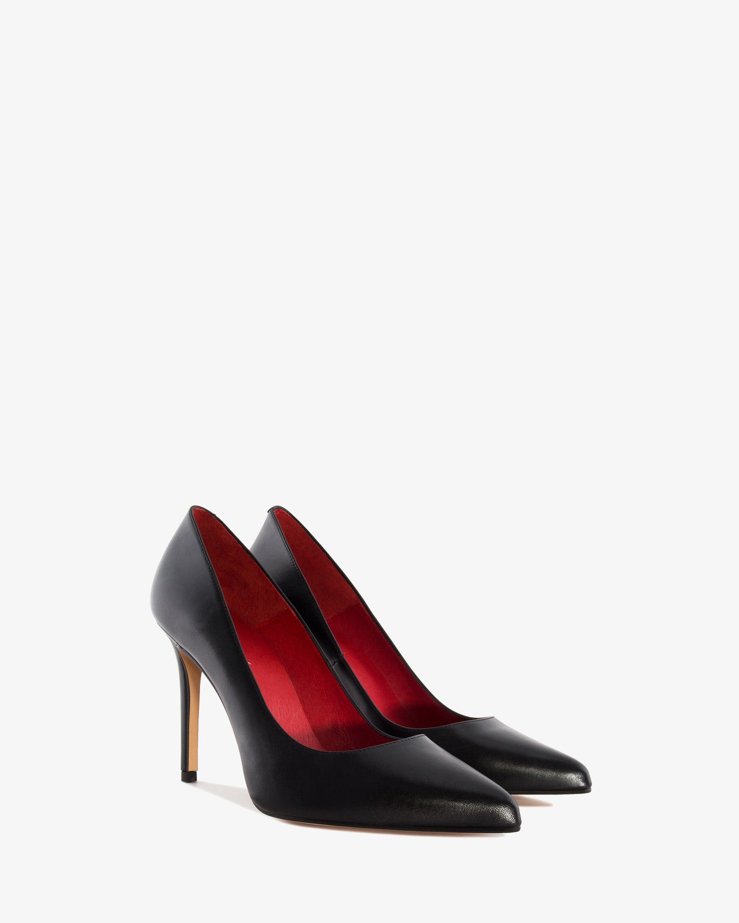 Talons aiguille en pointe en cuir de couleur Noir. Doublure et semelle confectionnés en cuir Rouge. Talons de 9,5 cm pour les petites pointures de la 32 à la 35. Talons de 10 cm pour les moyennes pointures du 36 au 41. Talons de 11,5 cm pour les grandes pointures du 42 au 45. Fabriquées en Espagne.