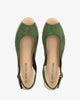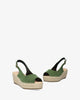 Alpargata de cuña con tira ancha en la puntera y dos tiras unidas con cierre de hebilla metálica al tono. Talonera abierta. Punta abierta y redondeada.
