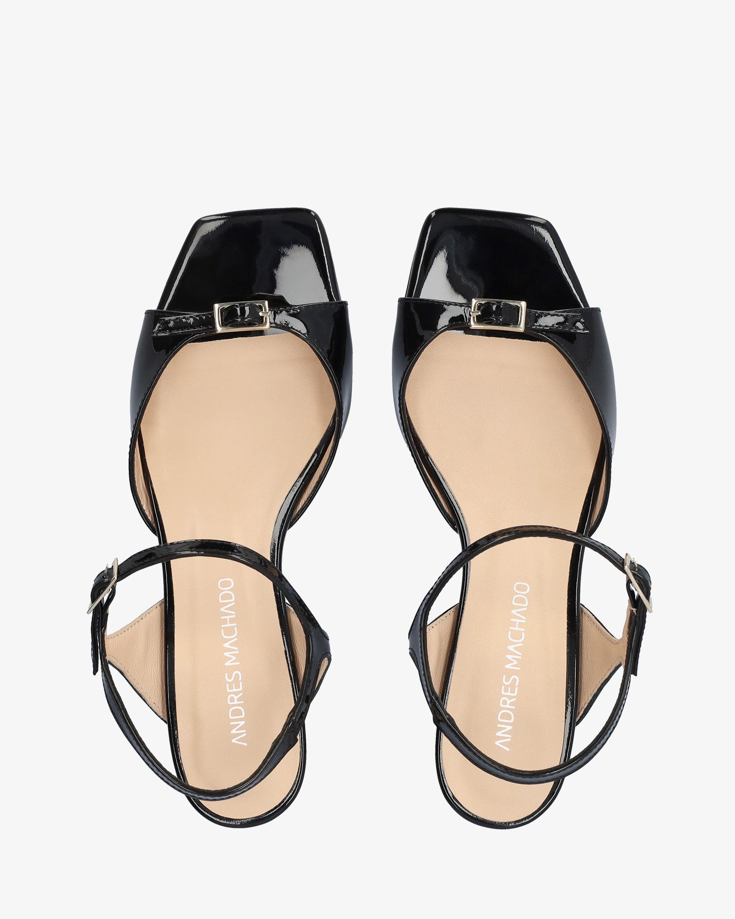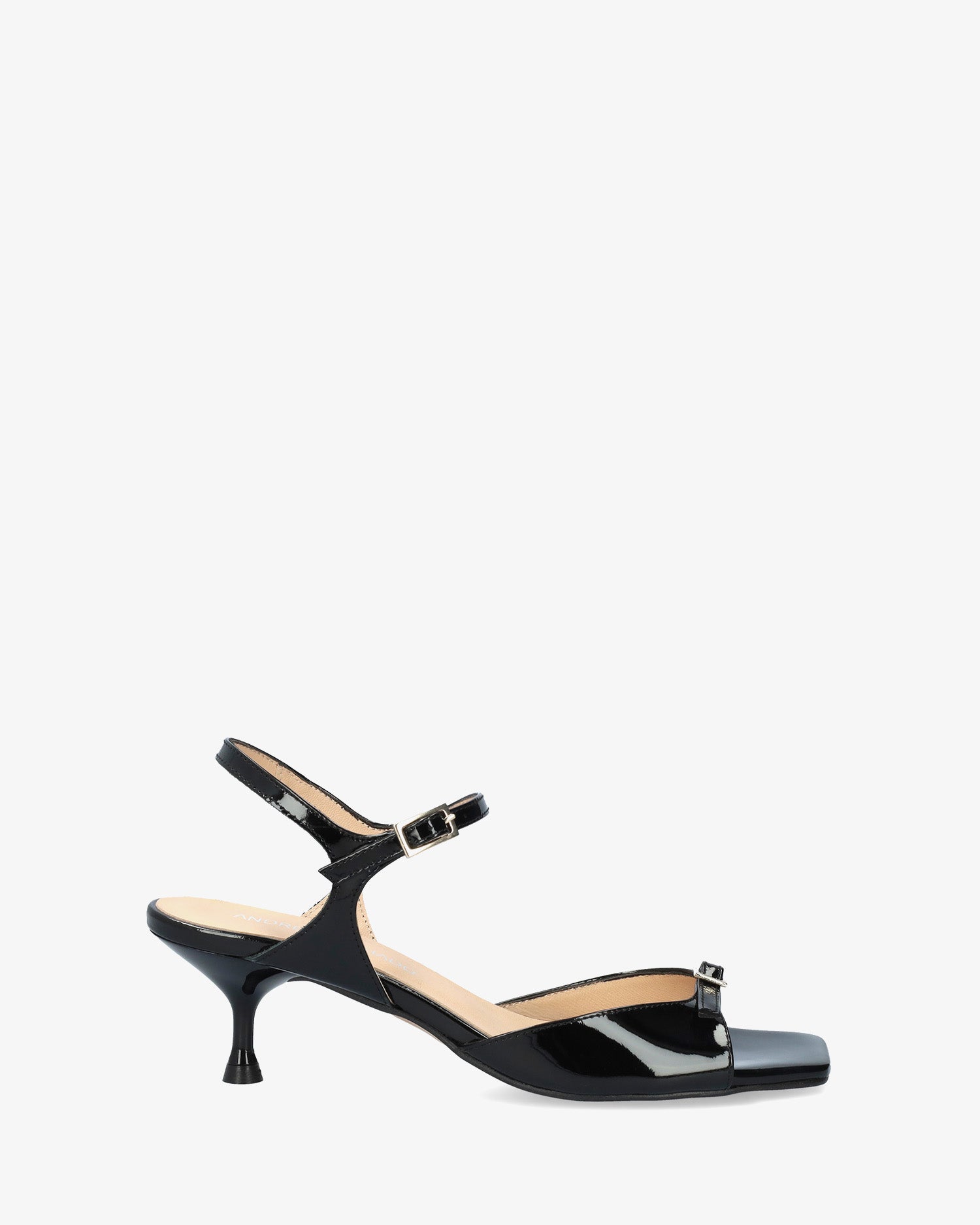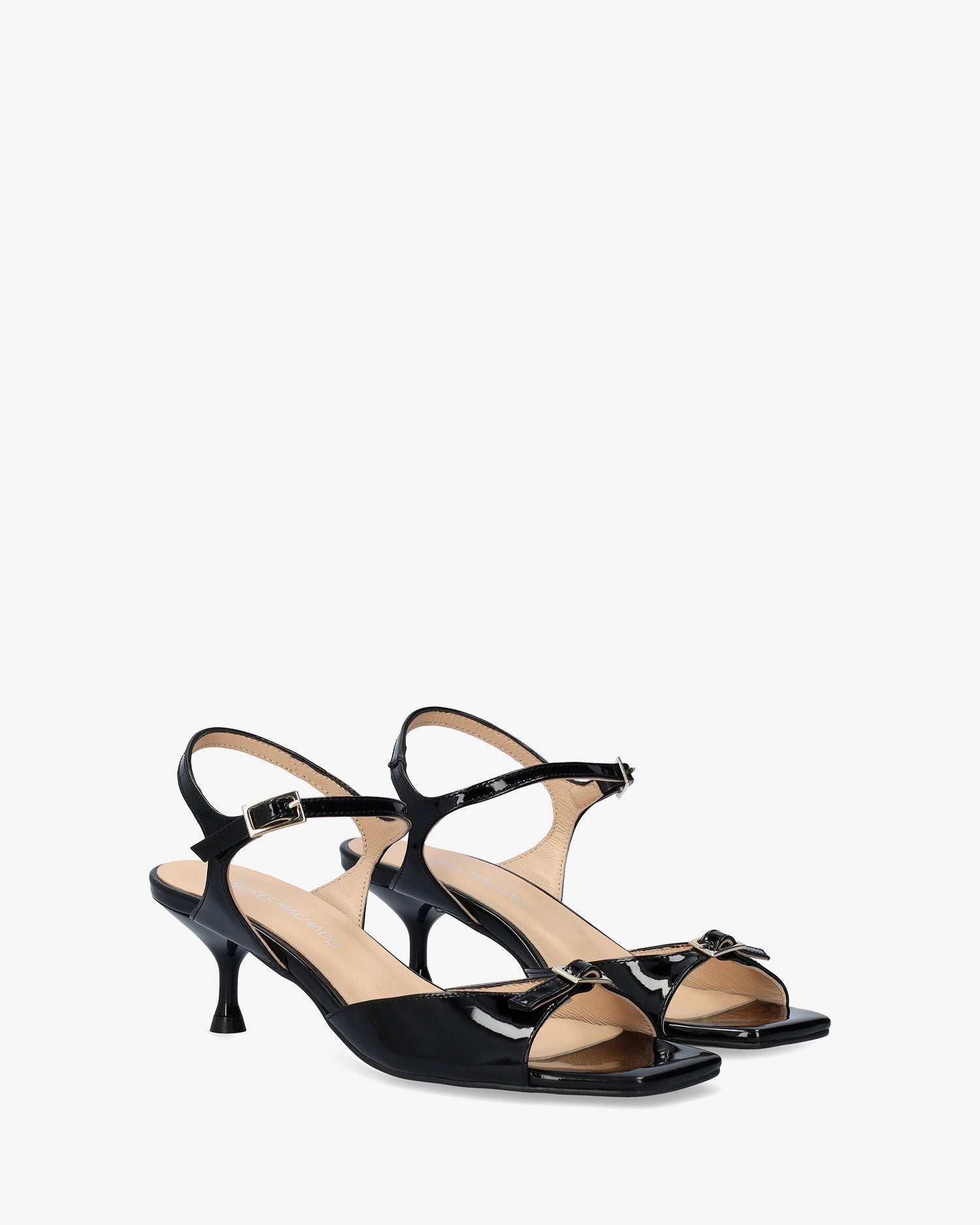 Sandalo con tacco Kitten Heel in pelle verniciata di colore nero. Fodera in pelle. Design slingback con punta aperta quadrata e cinturino con fibbia nella parte anteriore. Cinturino alla caviglia con chiusura tramite fibbia per una maggiore tenuta. Tacco tono su tono di 5 cm per le taglie piccole dal 32 al 35 e tacco tono su tono di 6 cm per le taglie grandi dal 42 al 45. Produzione in Spagna.