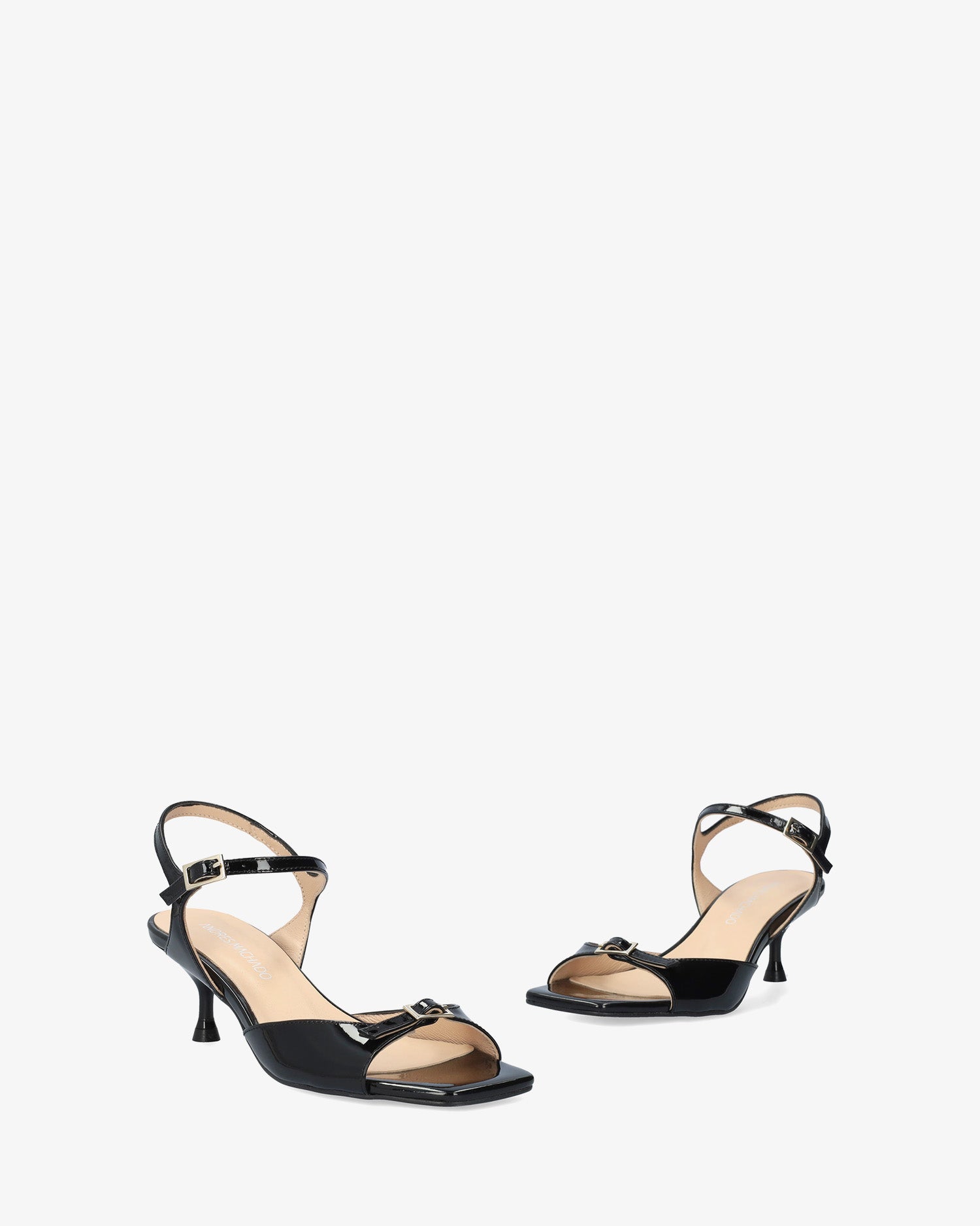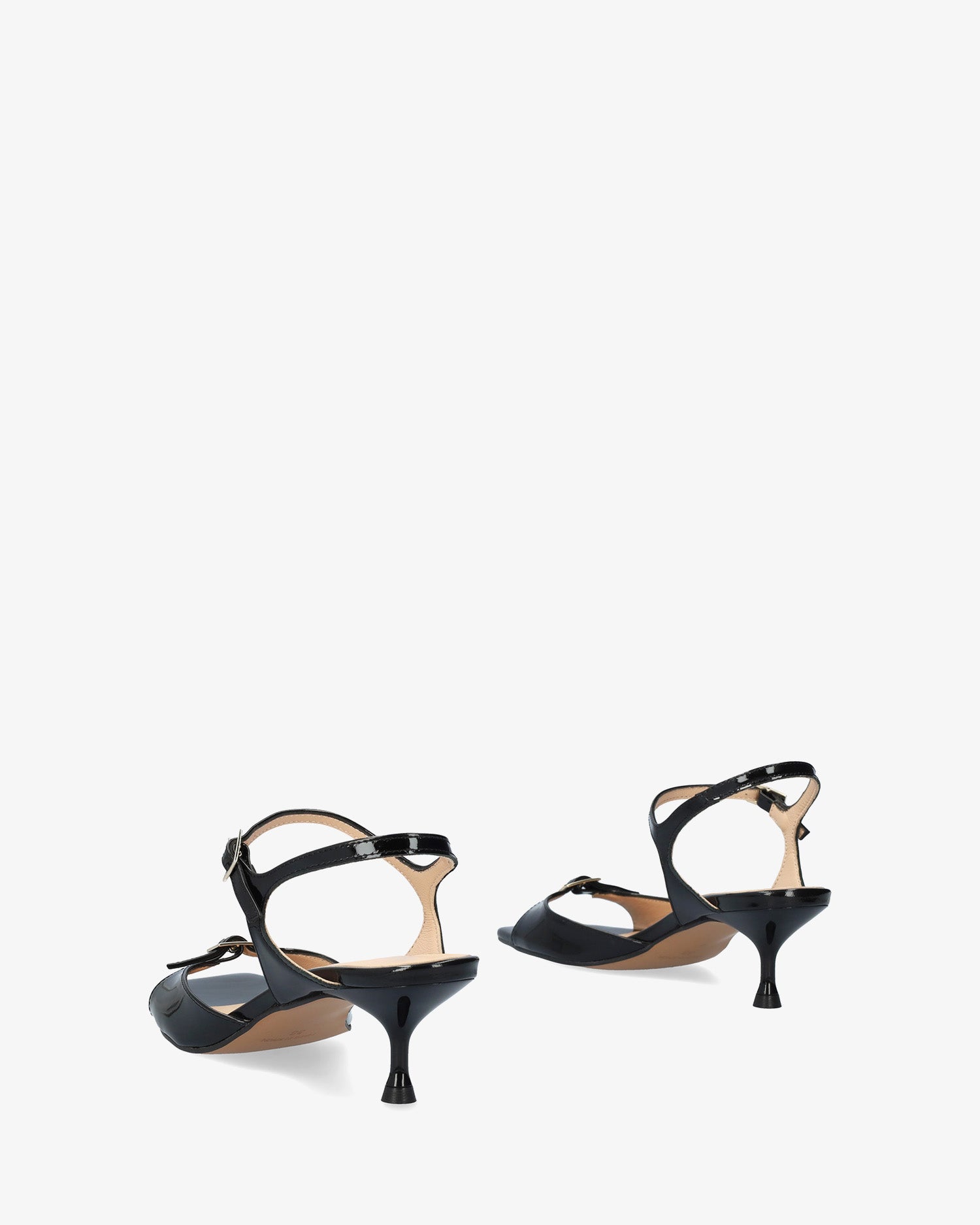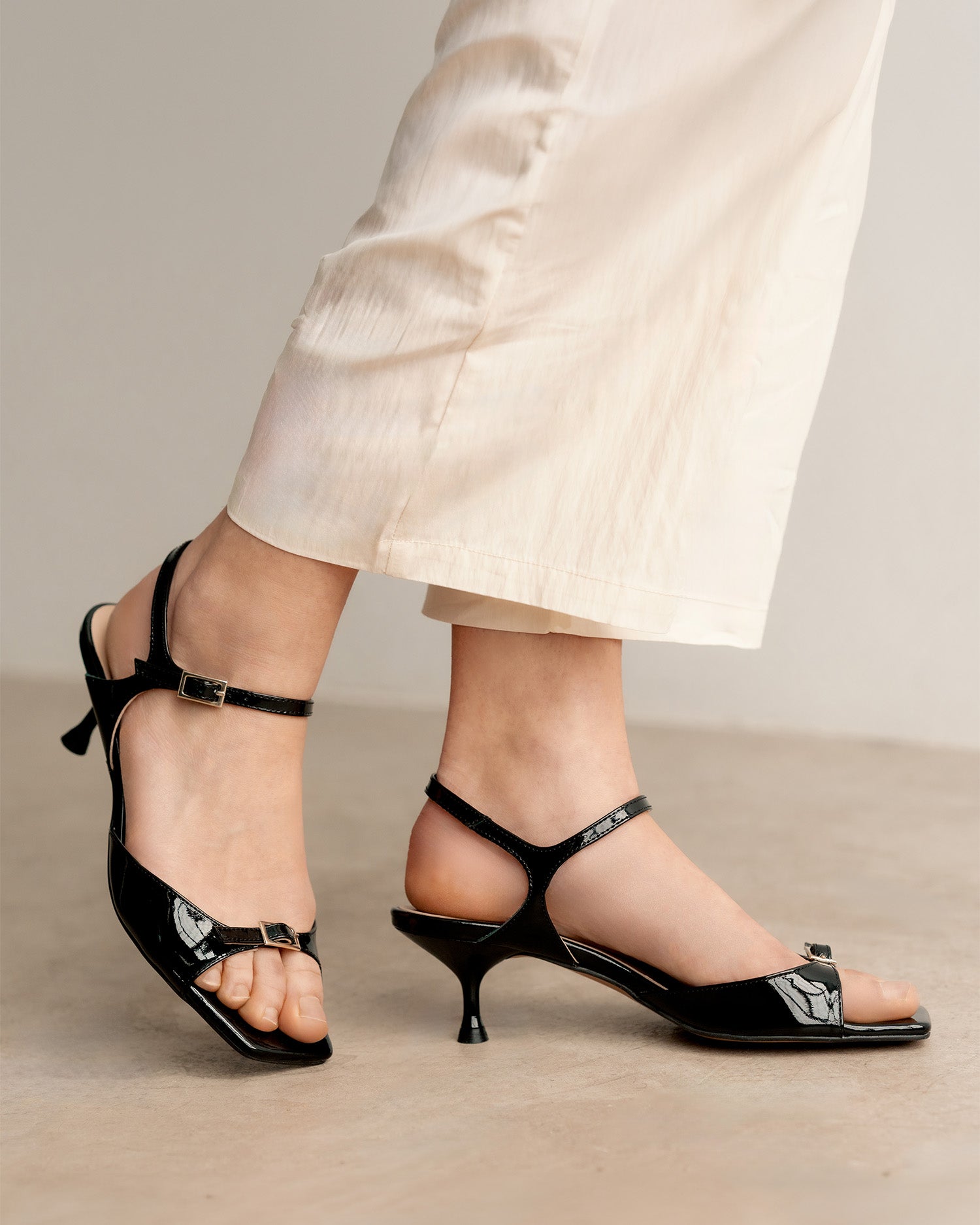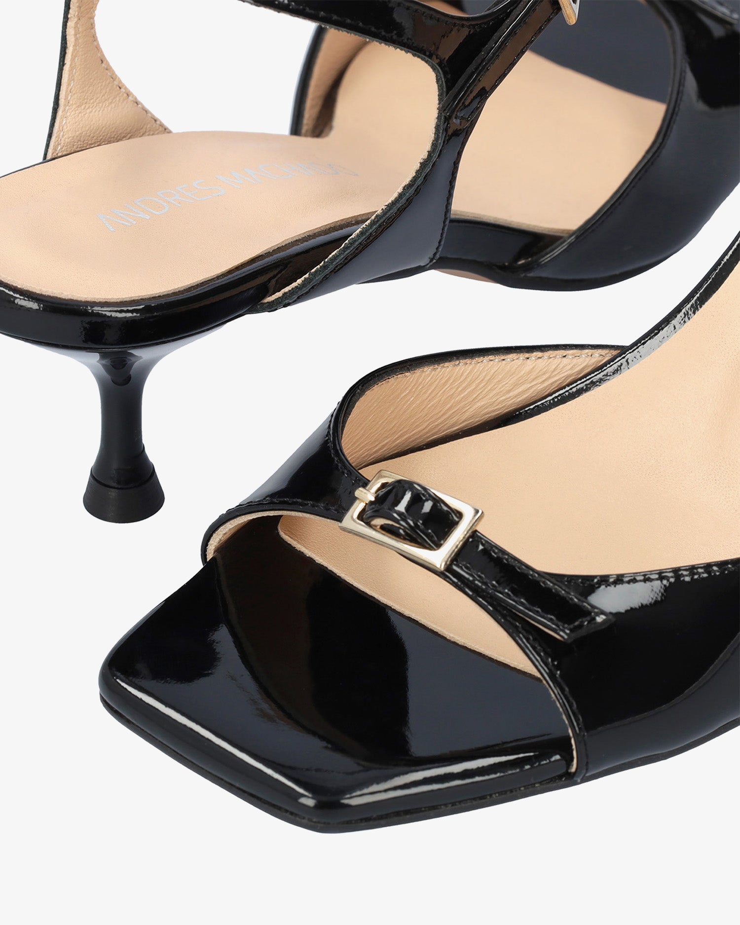 Sandalo con tacco Kitten Heel in pelle verniciata di colore nero. Fodera in pelle. Design slingback con punta aperta quadrata e cinturino con fibbia nella parte anteriore. Cinturino alla caviglia con chiusura tramite fibbia per una maggiore tenuta. Tacco tono su tono di 5 cm per le taglie piccole dal 32 al 35 e tacco tono su tono di 6 cm per le taglie grandi dal 42 al 45. Produzione in Spagna.