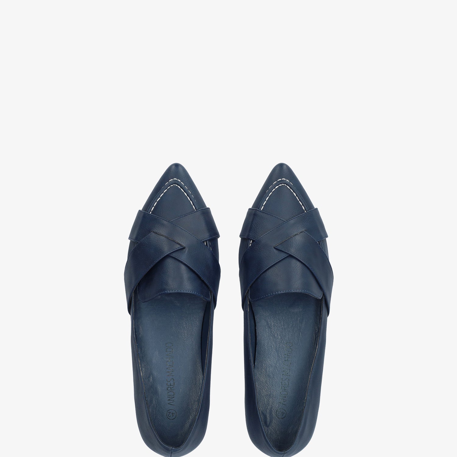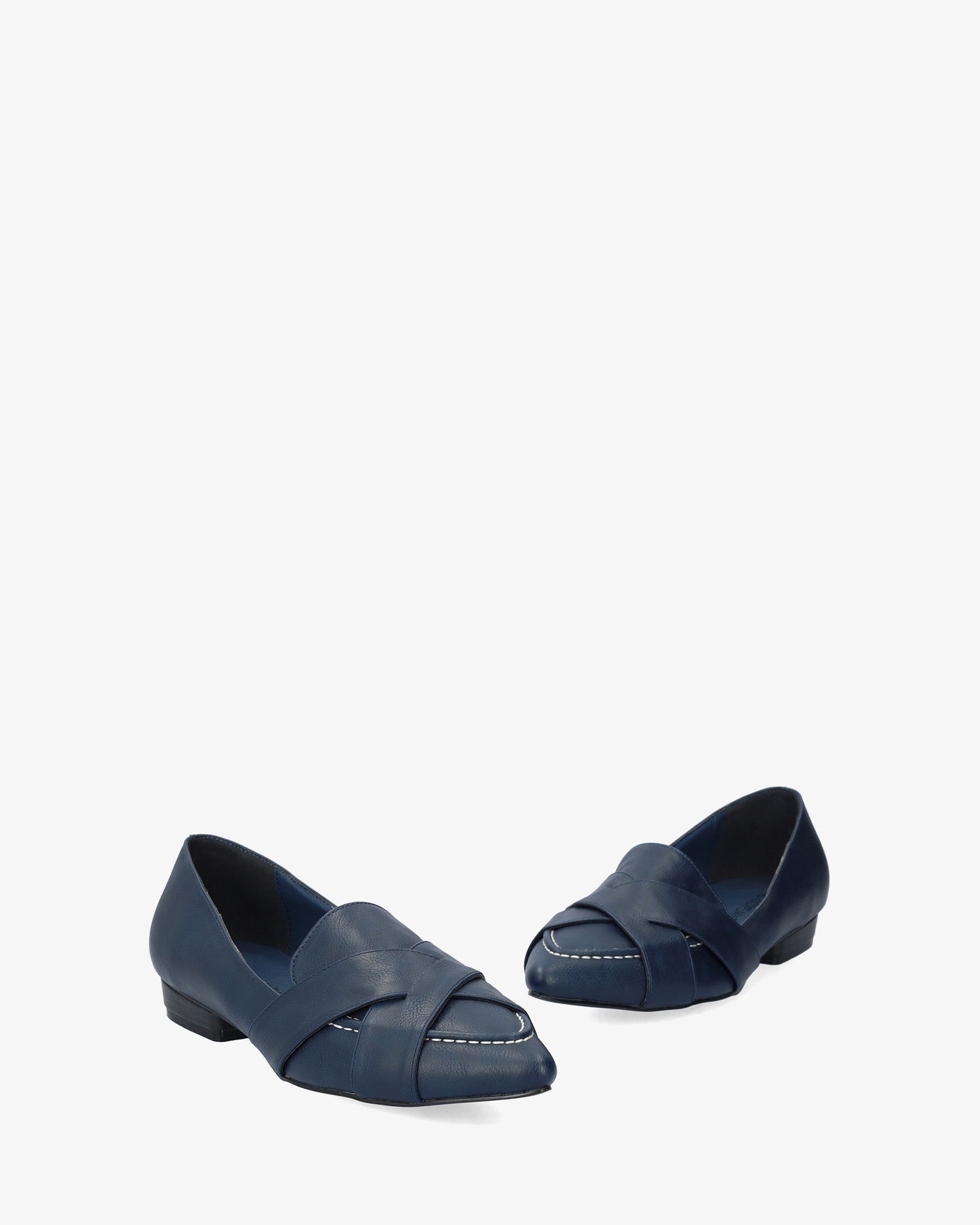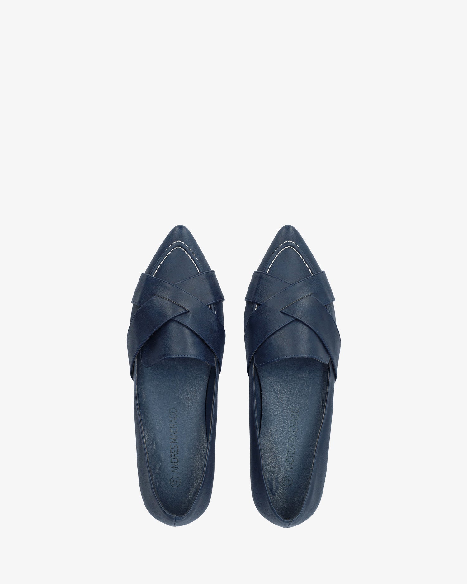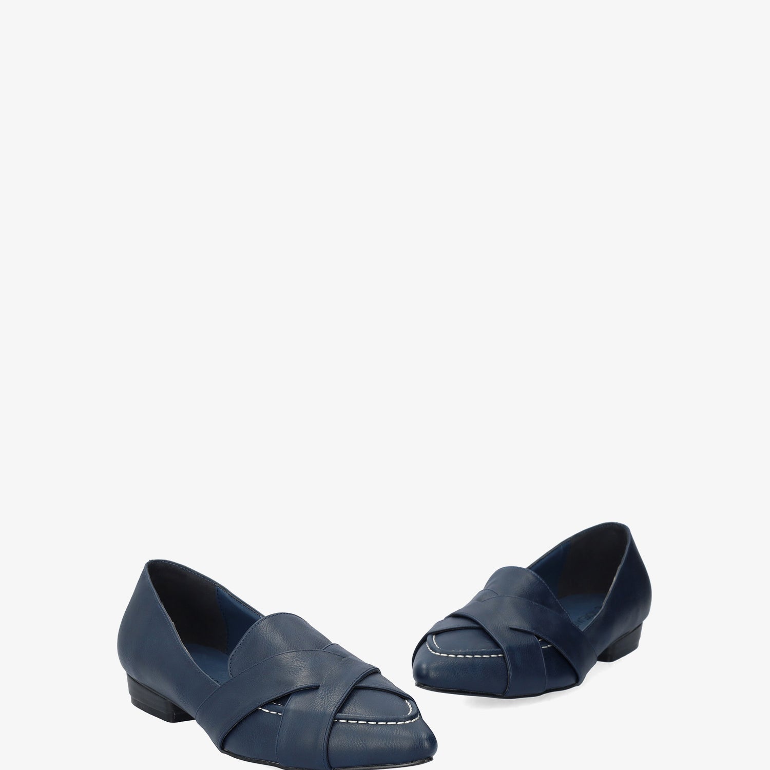 Miękkie balerinki w kolorze granatowym. Szczegół szerokich skrzyżowanych pasków na podbiciu. Ozdobne przeszycia z użyciem dopasowanej nici na palcach. Wykończenie w najlepszym stylu. Obcas z imitacji laminowanego drewna o szerokości 3 cm, odpowiedni do dużych rozmiarów od 42 do 45.