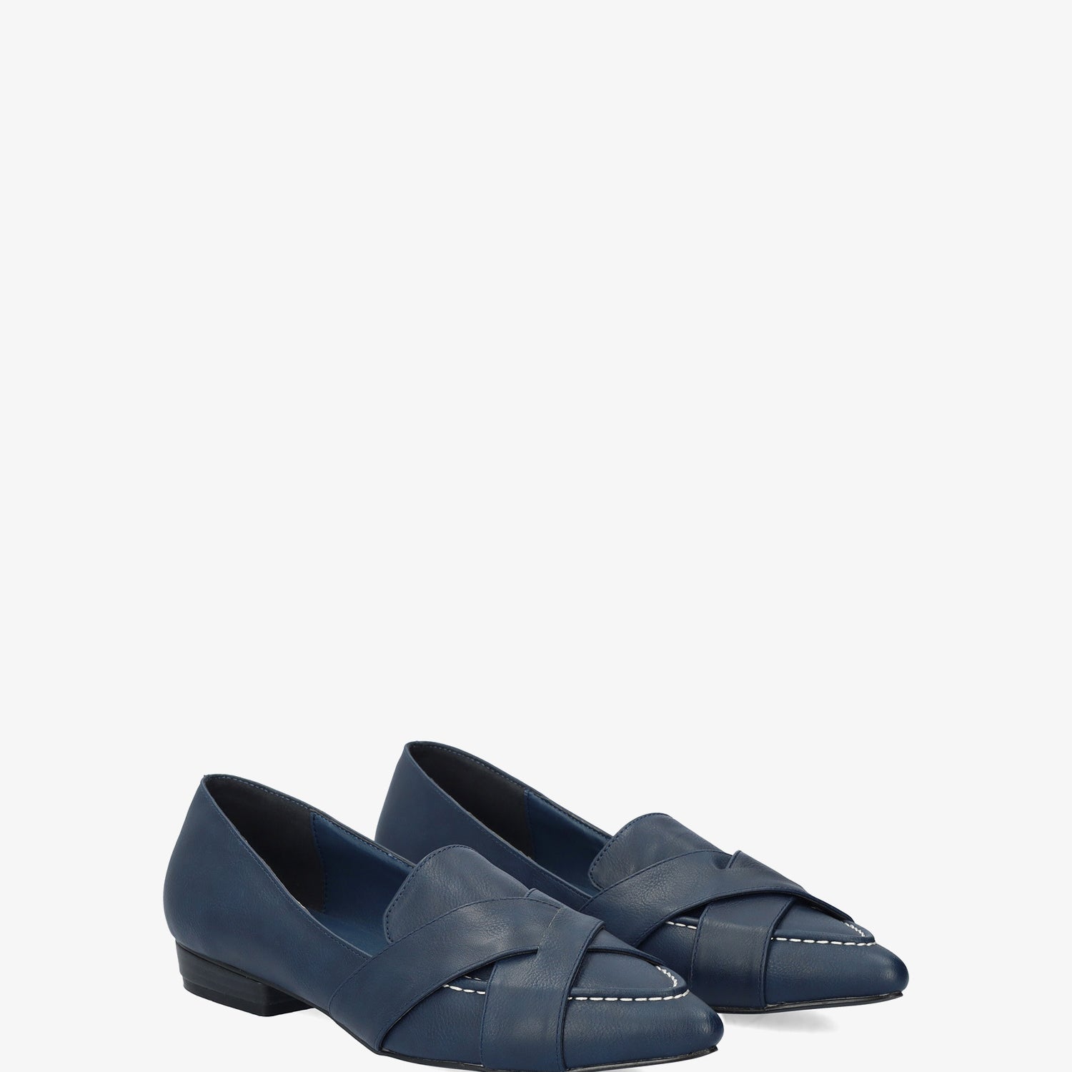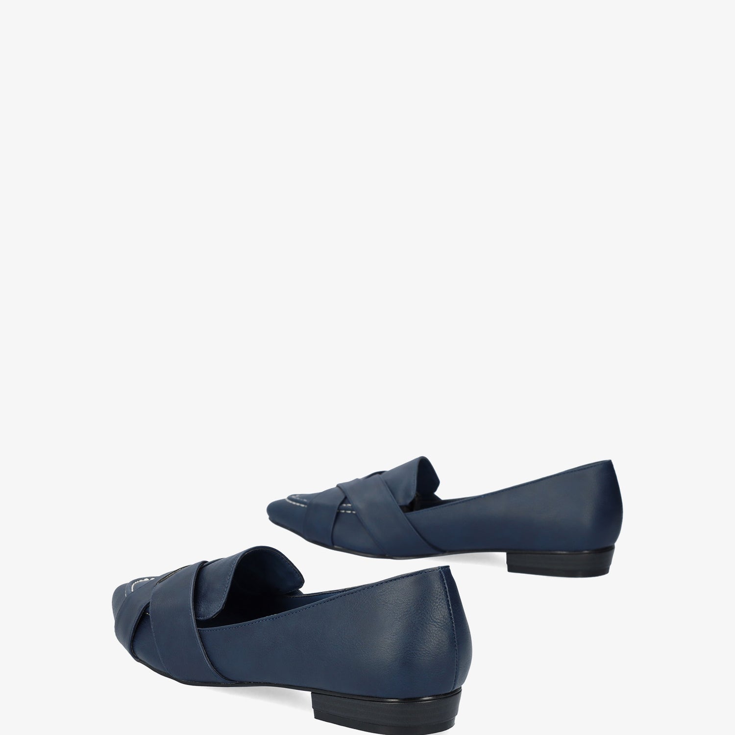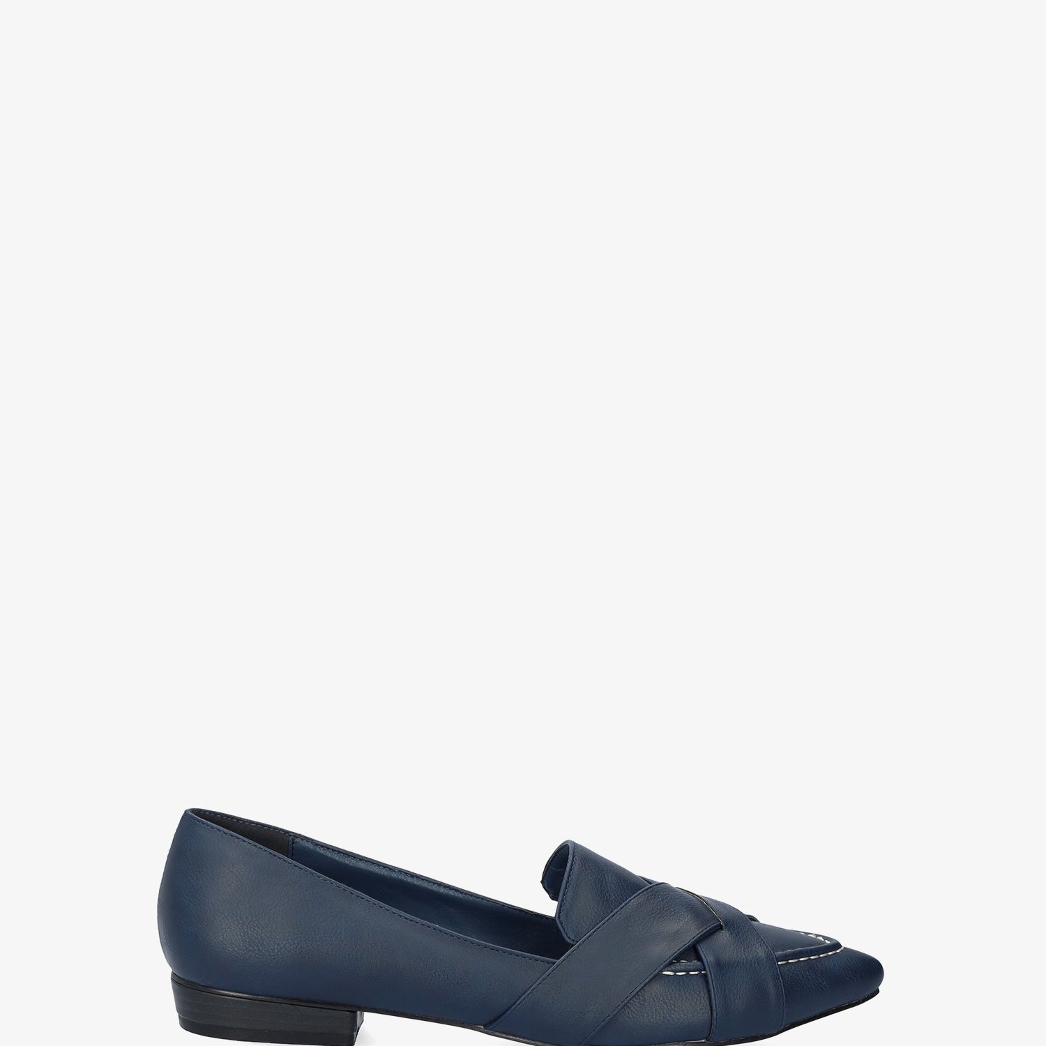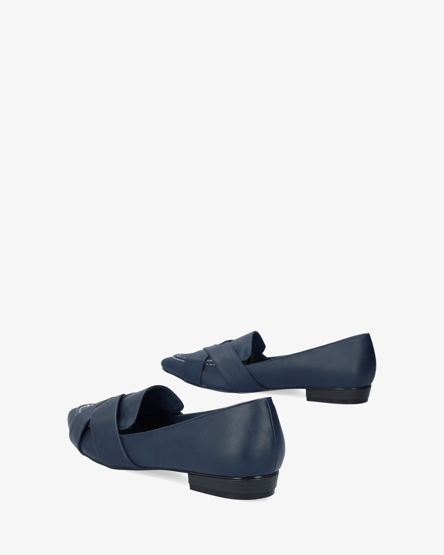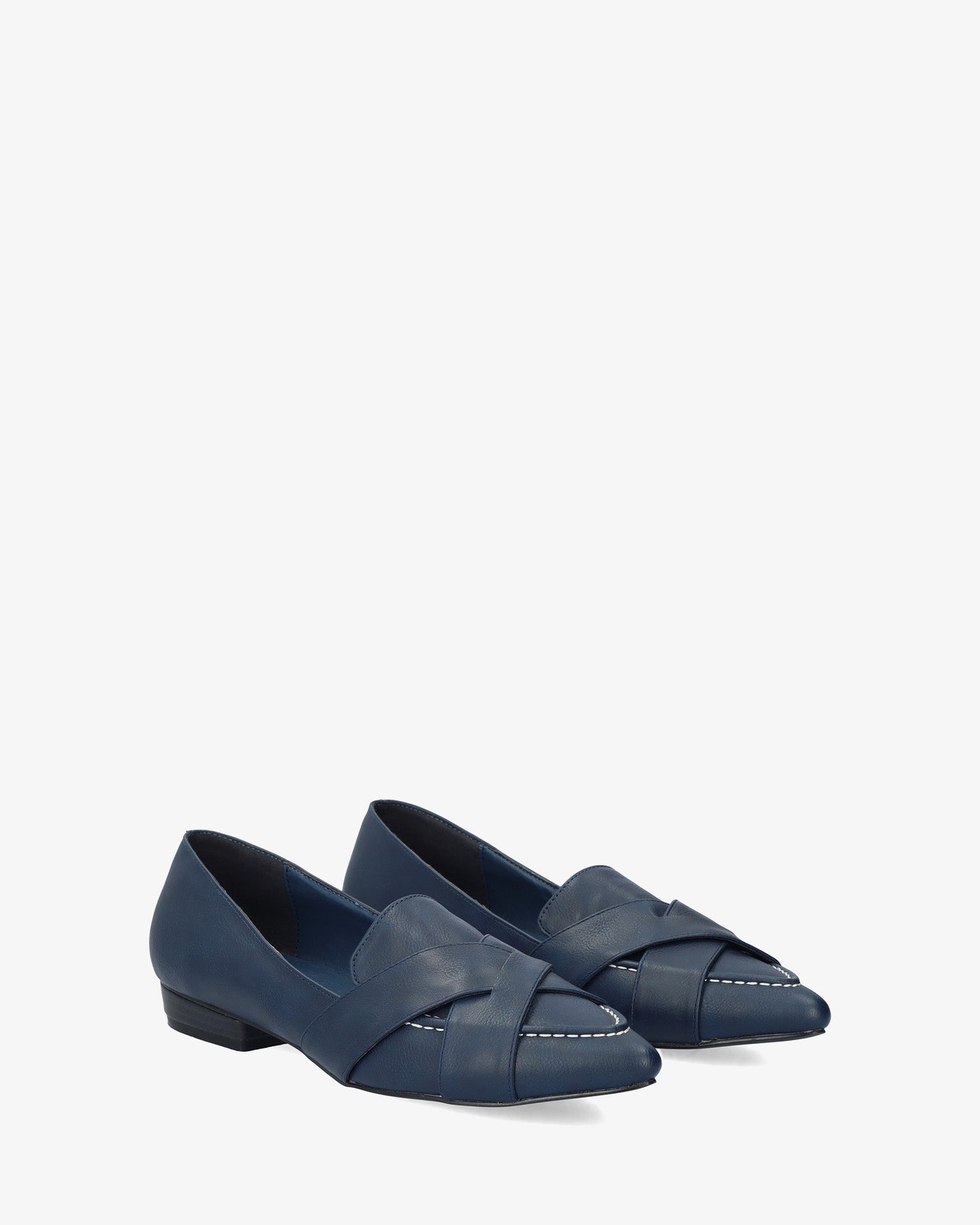 Miękkie balerinki w kolorze granatowym. Szczegół szerokich skrzyżowanych pasków na podbiciu. Ozdobne przeszycia z użyciem dopasowanej nici na palcach. Wykończenie w najlepszym stylu. Obcas z imitacji laminowanego drewna o szerokości 3 cm, odpowiedni do dużych rozmiarów od 42 do 45.