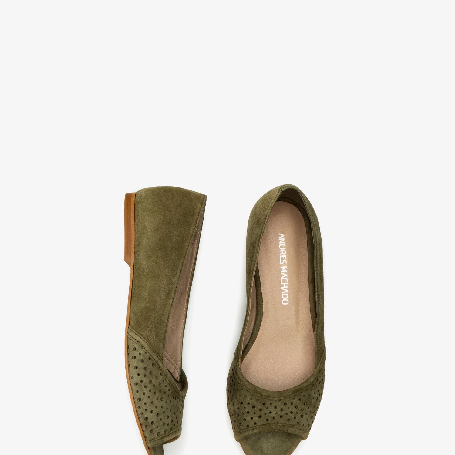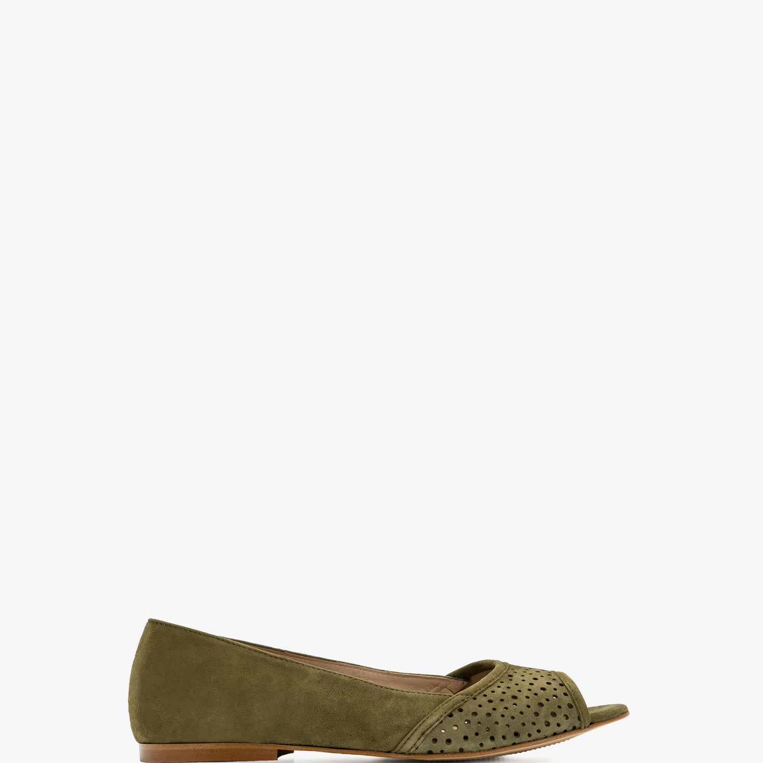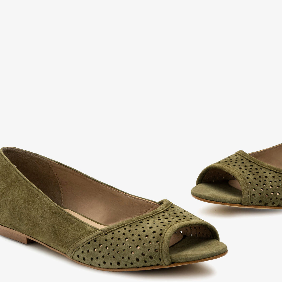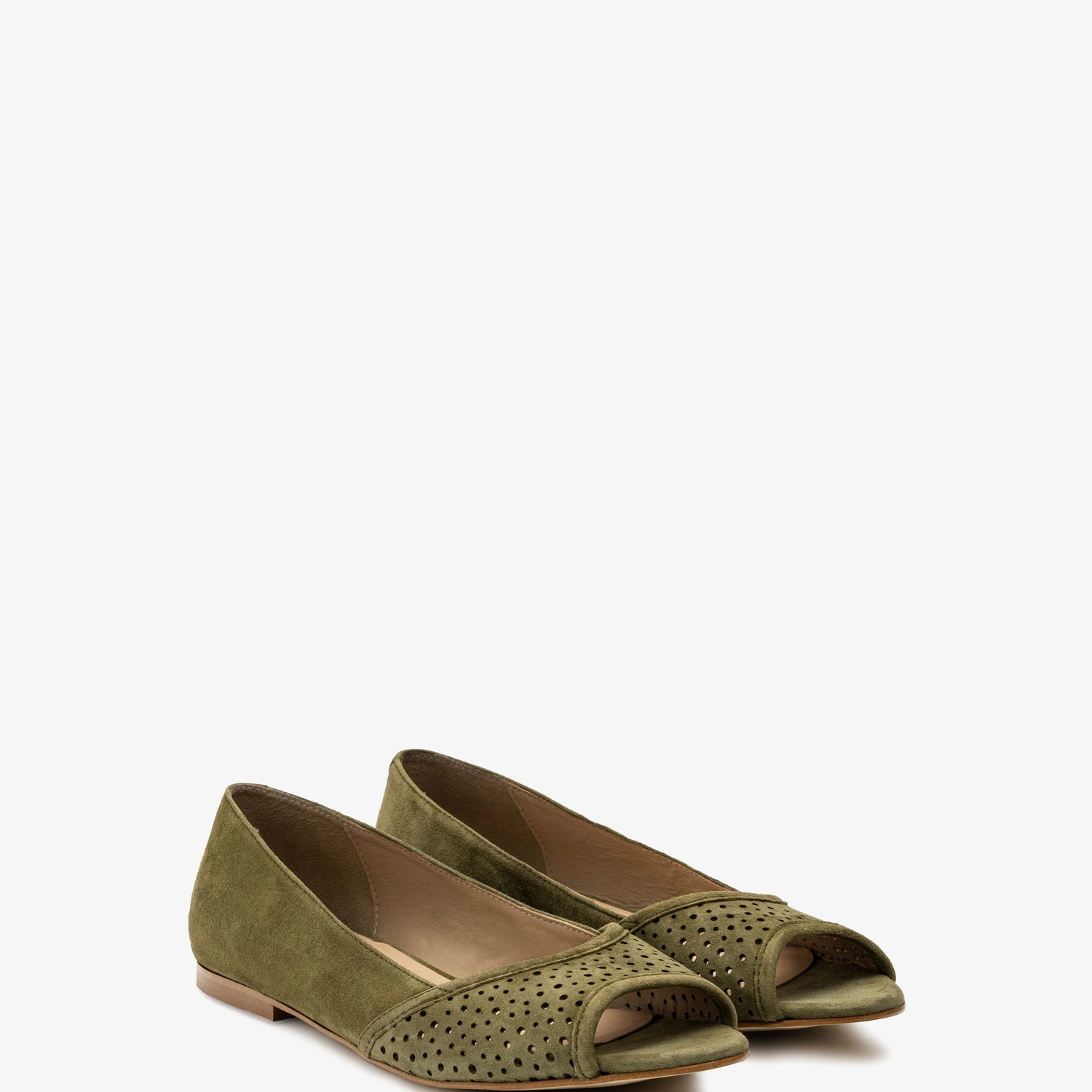 Baleriny z odkrytymi palcami, wykonane ze zamszu w kolorze zielonym. Ażurowe wykończenie z przodu. Wykonane z dopasowanego zamszu. Skórzana podszewka. Małe rozmiary od 32 do 35. Duże rozmiary od 42 do 45. Wyprodukowano w Hiszpanii