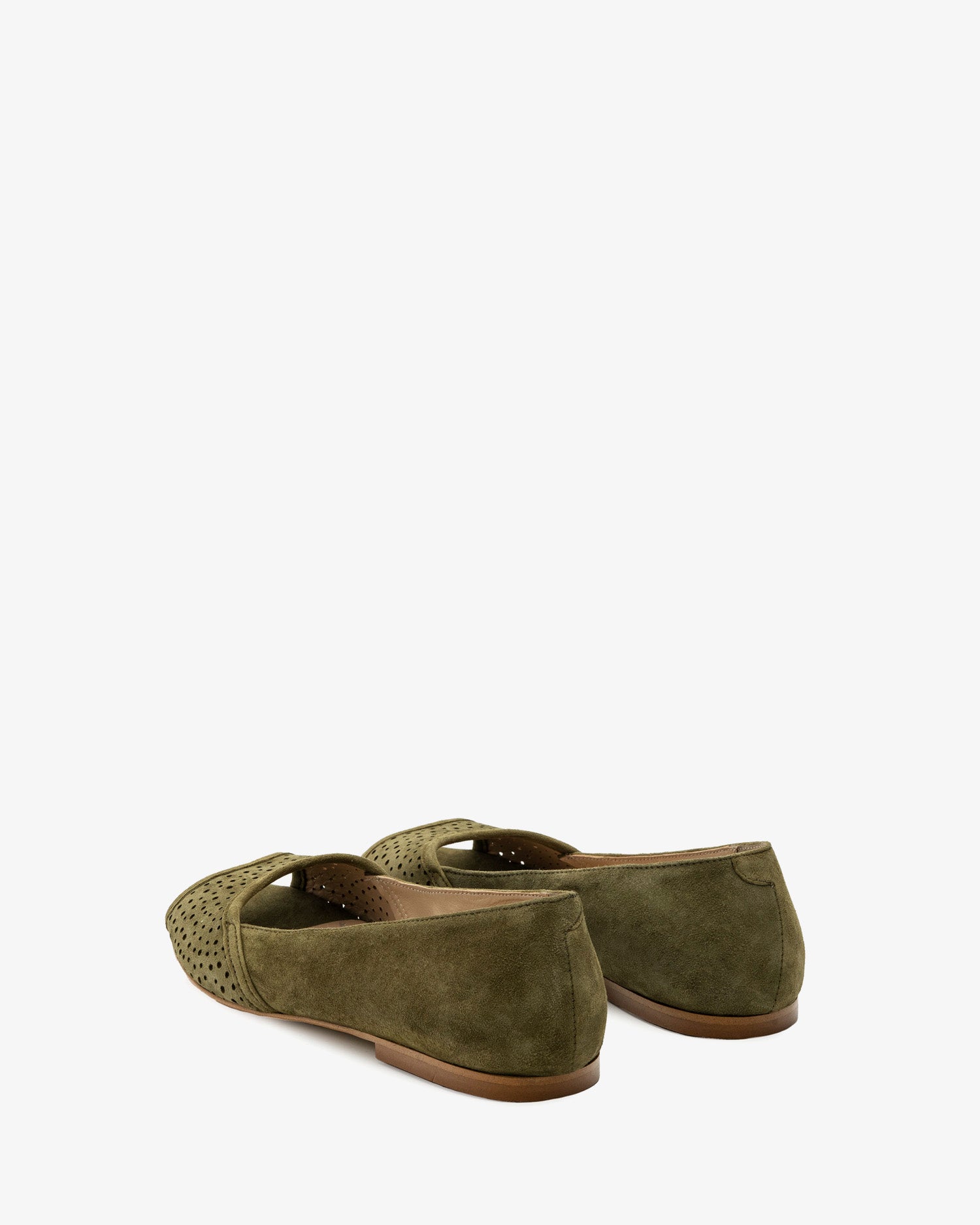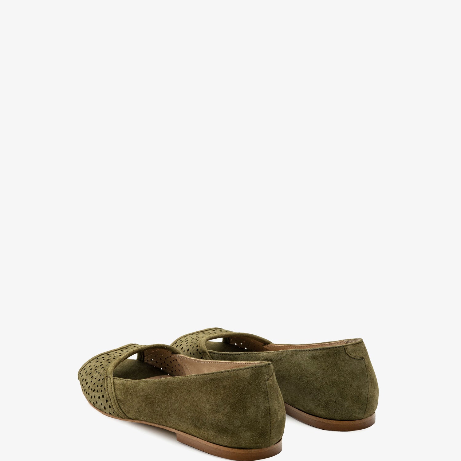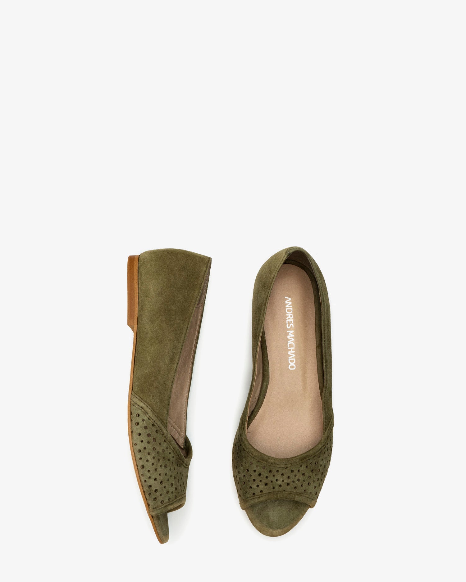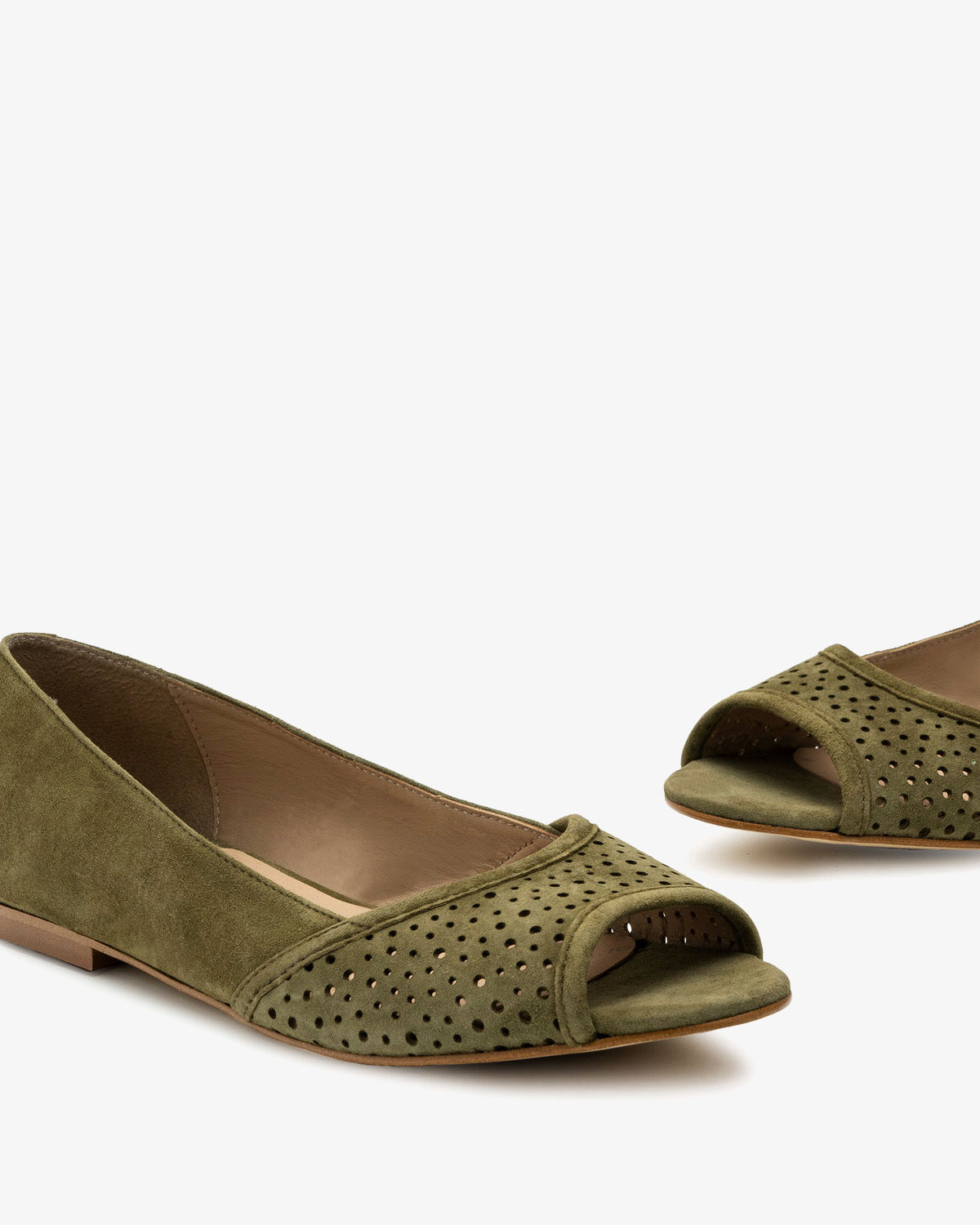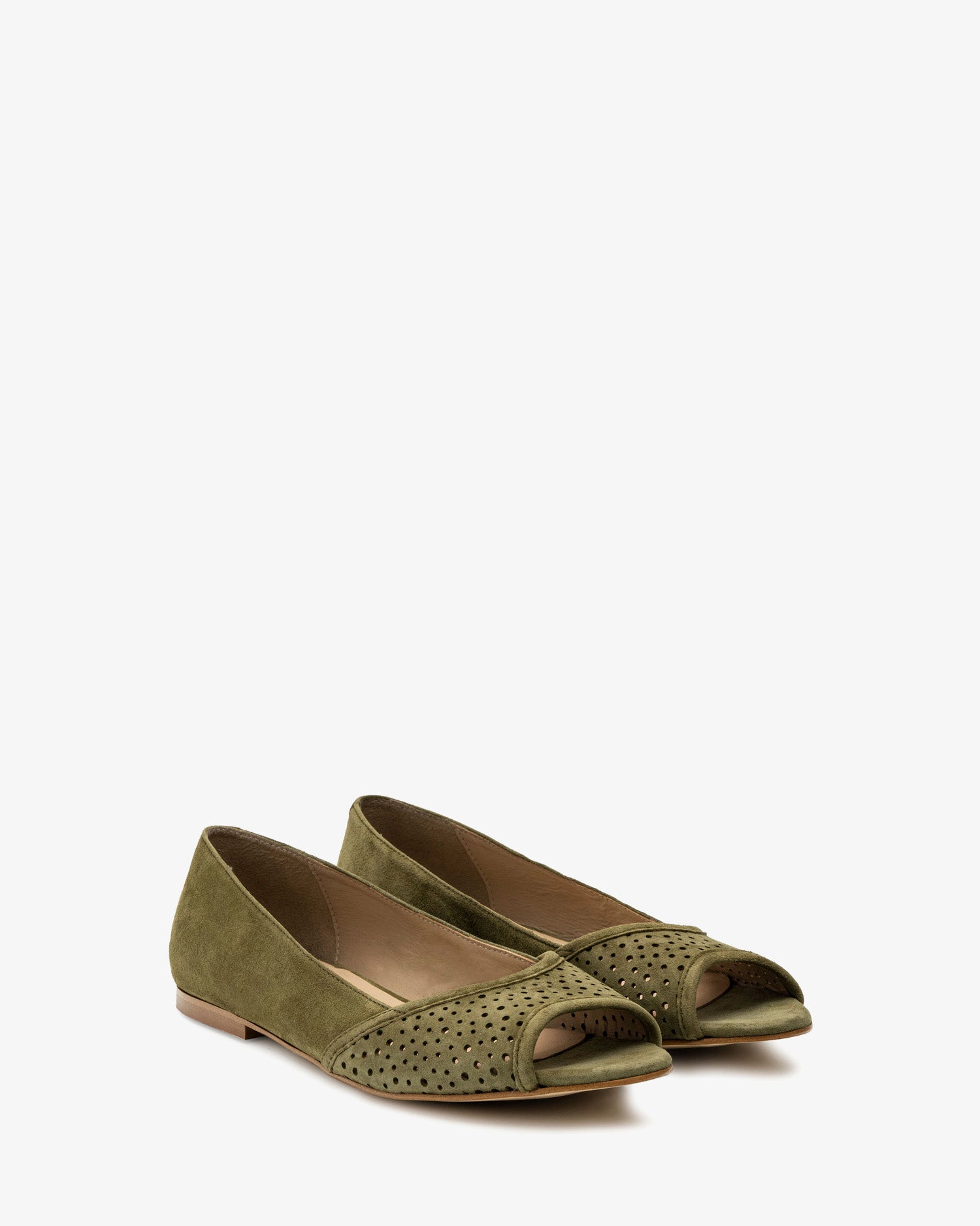 Baleriny z odkrytymi palcami, wykonane ze zamszu w kolorze zielonym. Ażurowe wykończenie z przodu. Wykonane z dopasowanego zamszu. Skórzana podszewka. Małe rozmiary od 32 do 35. Duże rozmiary od 42 do 45. Wyprodukowano w Hiszpanii