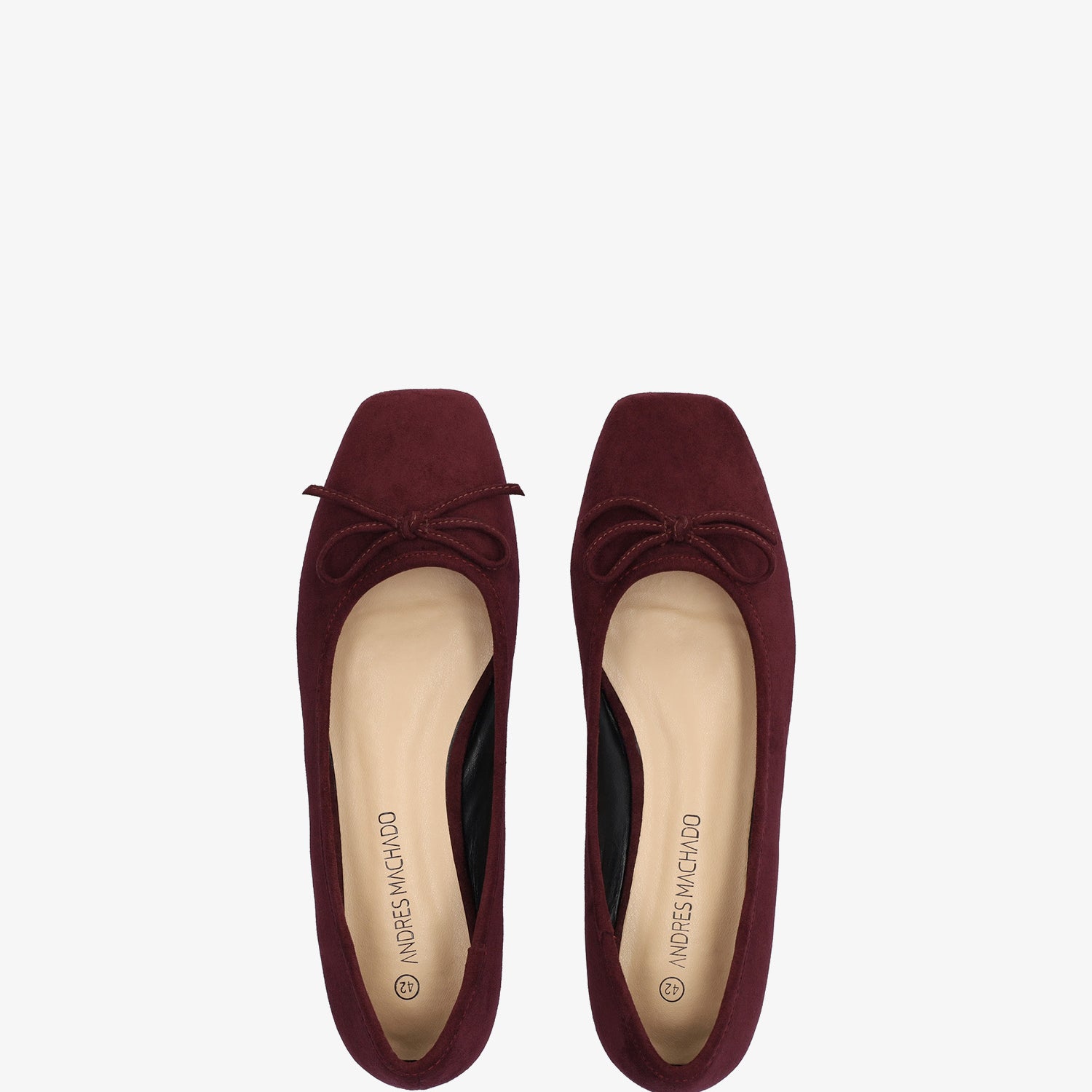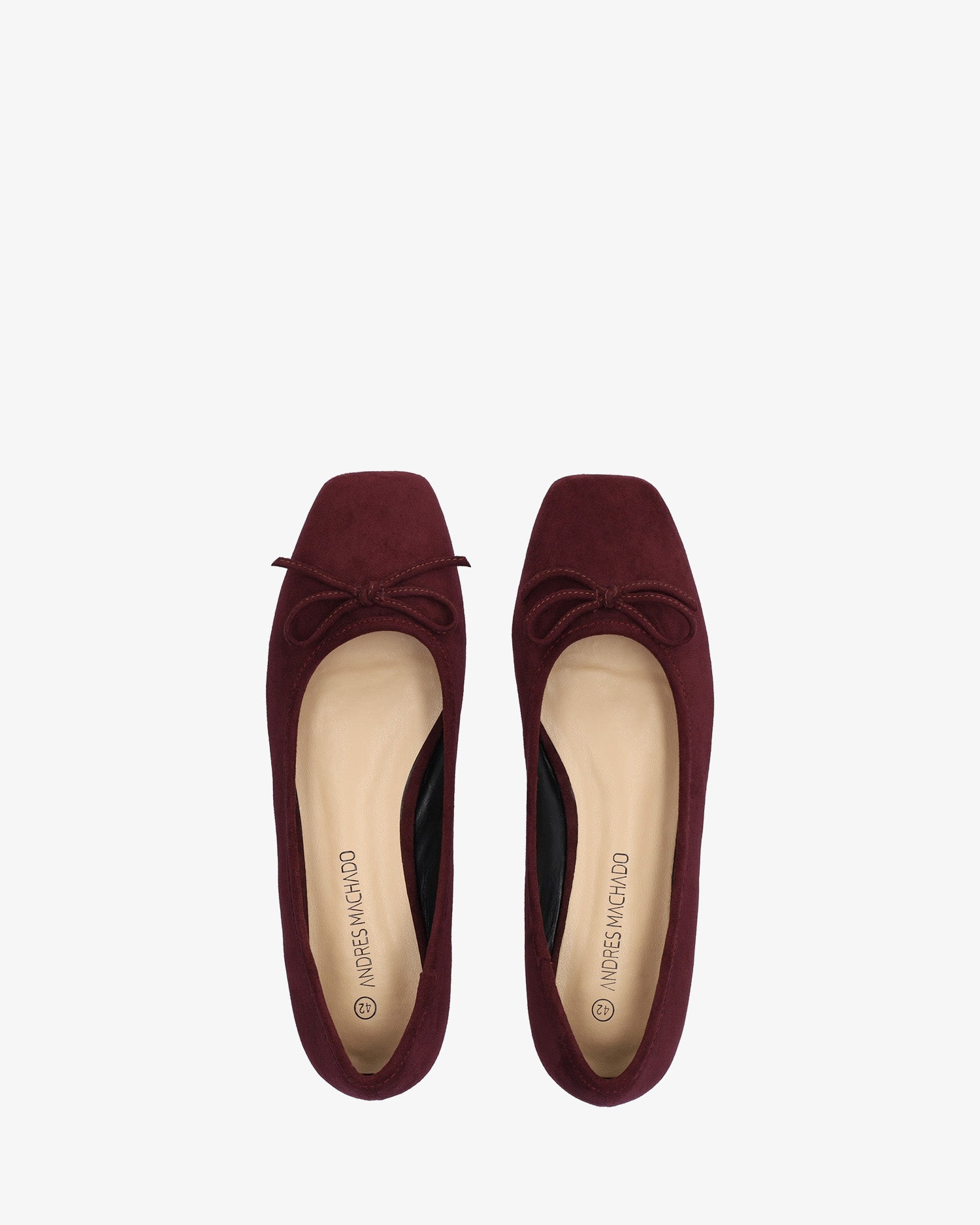Baleriny na płaskim obcasie ze skóry zamszowej w kolorze bordowym. Fason z kwadratowym noskiem i pasującą kokardką na palcach. Ozdobne przeszycia z dopasowaną nicią na górnej krawędzi buta. Szeroki obcas dla dużych rozmiarów od 42 do 45.