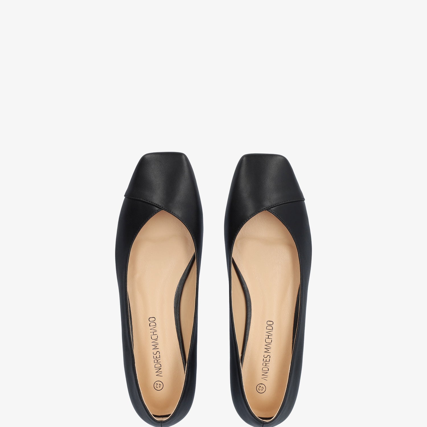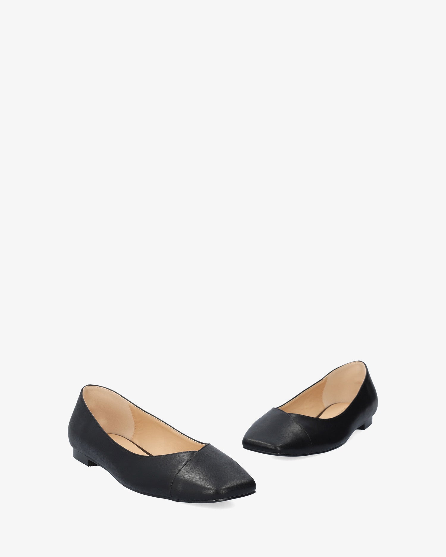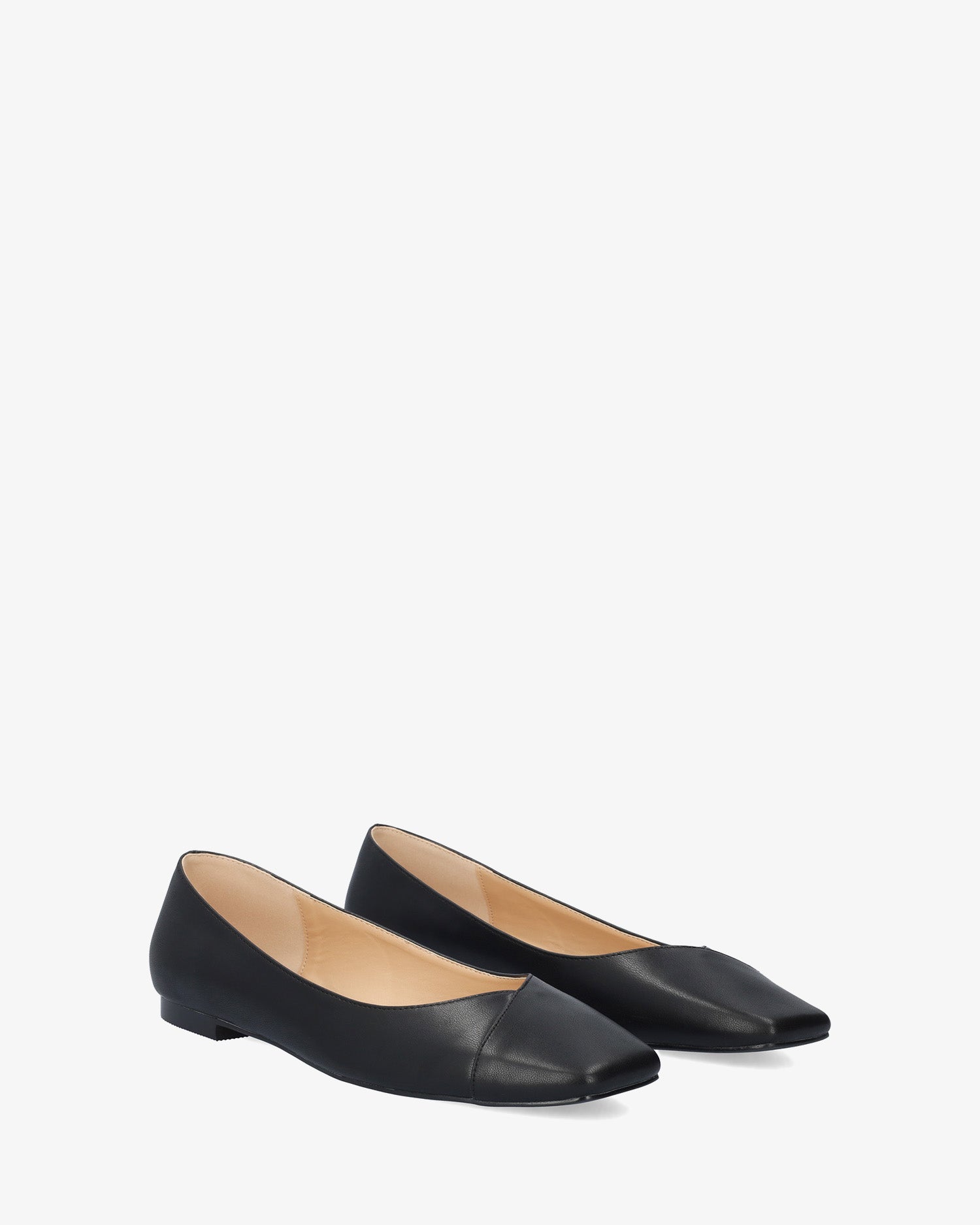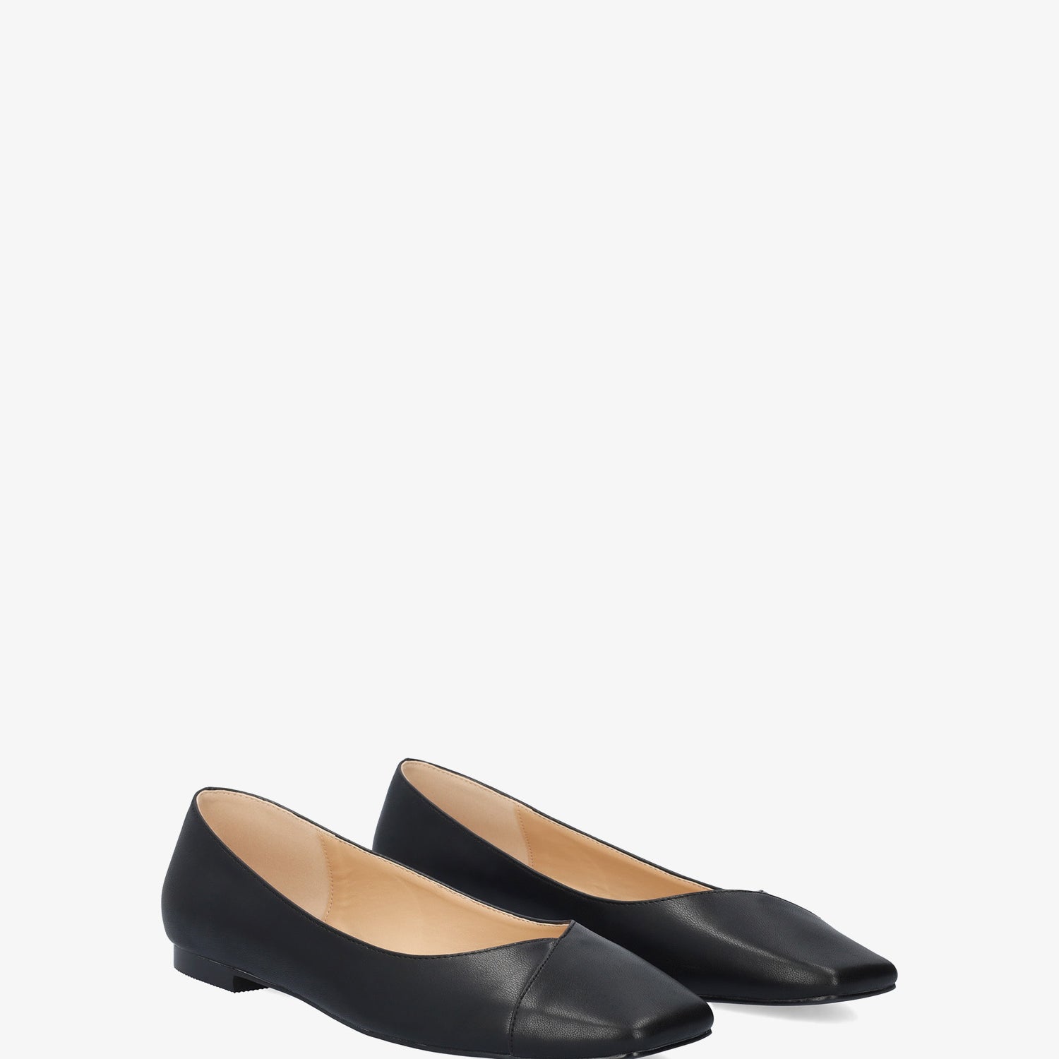Płaskie baleriny w miękkim czarnym kolorze. Projekt z kwadratowym noskiem i ozdobnym przeszyciem krzyżykowym z pasującą nicią na palcach. Szeroki obcas odpowiedni dla większych rozmiarów od 42 do 45. Ten model jest zaniżony, dlatego zaleca się zamówienie rozmiaru o jeden większego niż zwykle.