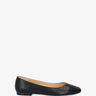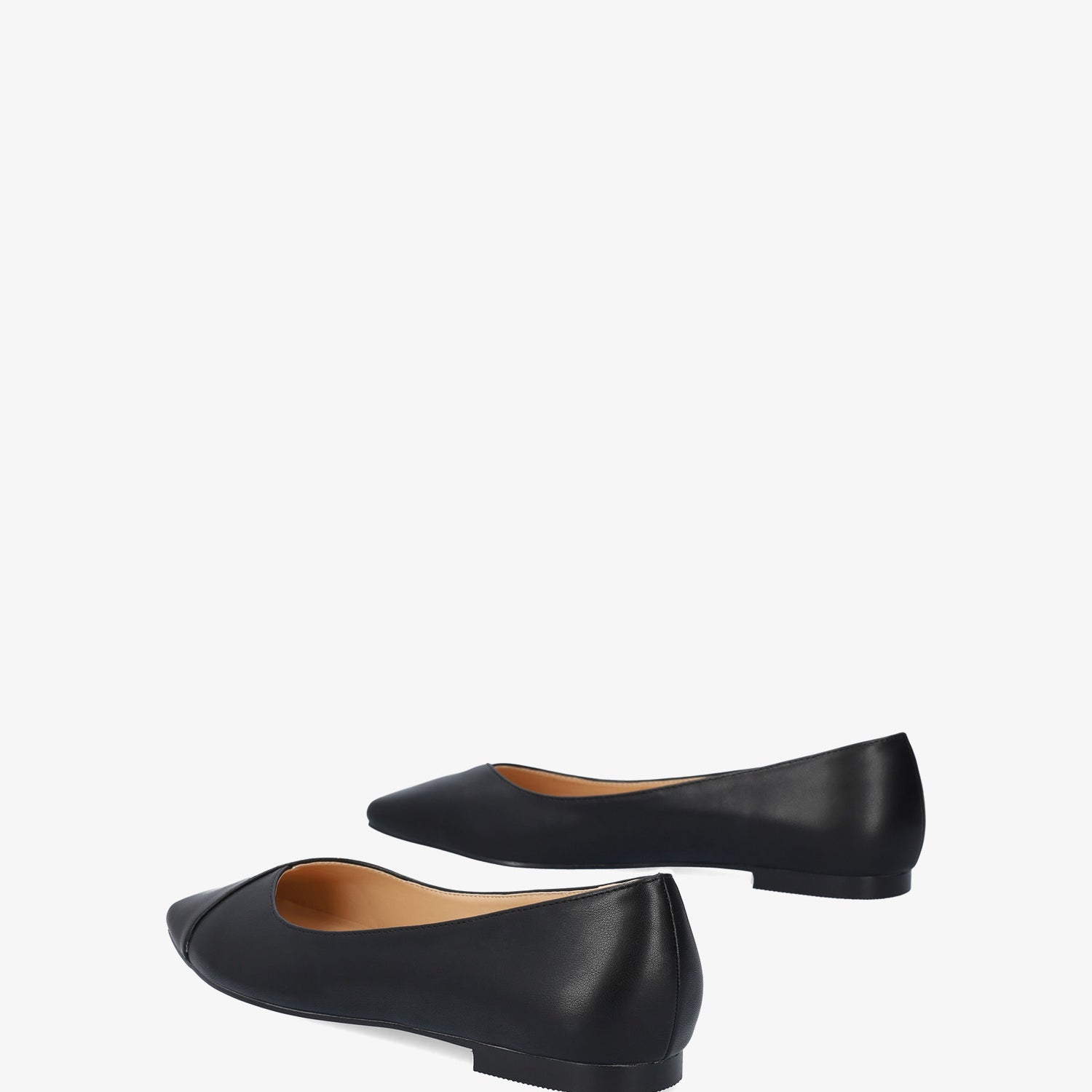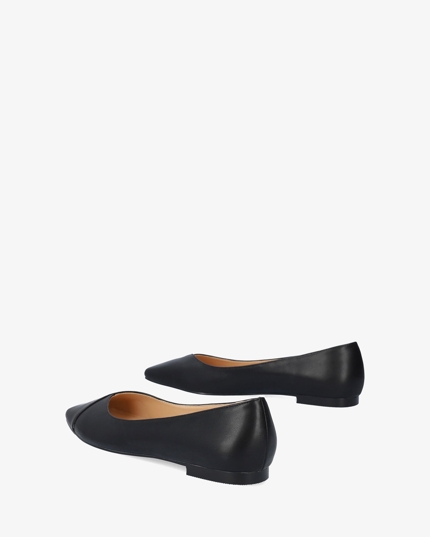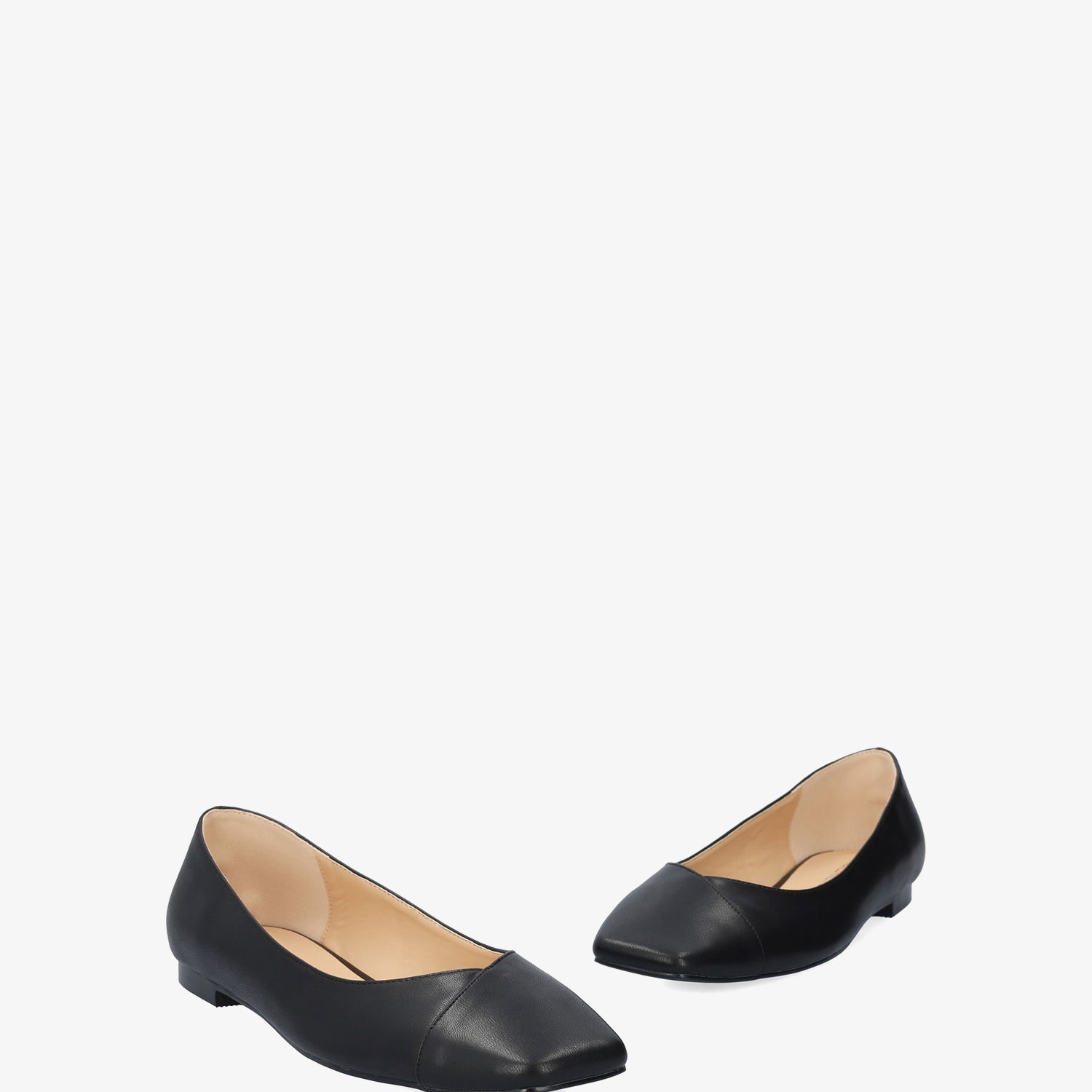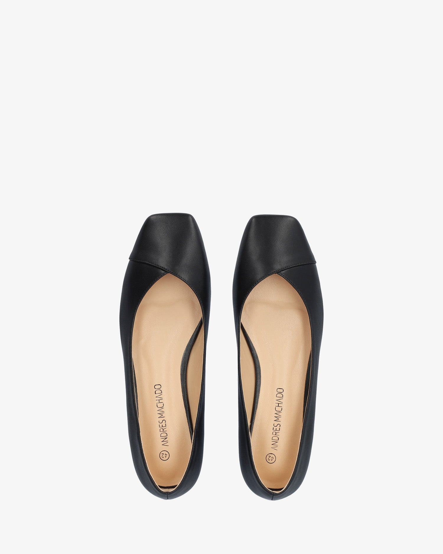 Płaskie baleriny w miękkim czarnym kolorze. Projekt z kwadratowym noskiem i ozdobnym przeszyciem krzyżykowym z pasującą nicią na palcach. Szeroki obcas odpowiedni dla większych rozmiarów od 42 do 45. Ten model jest zaniżony, dlatego zaleca się zamówienie rozmiaru o jeden większego niż zwykle.