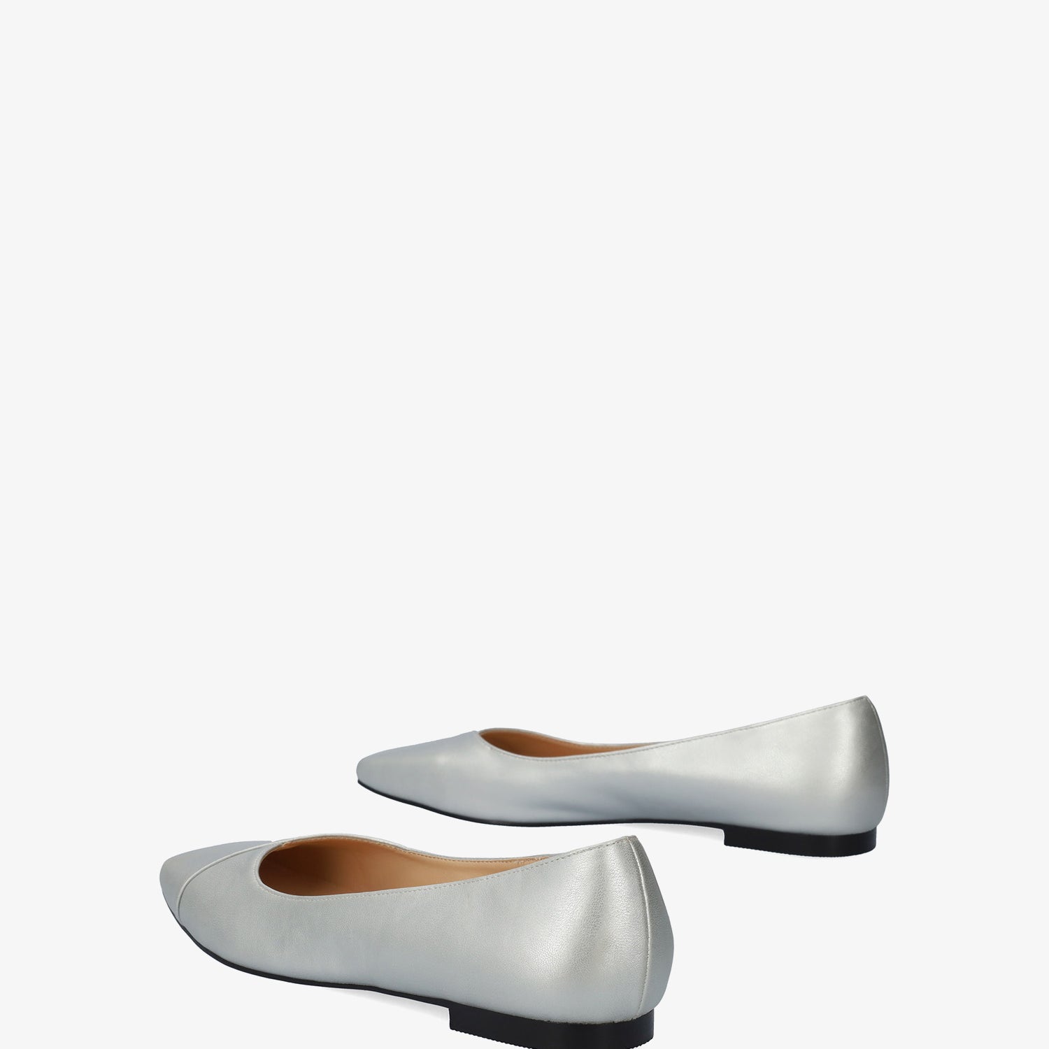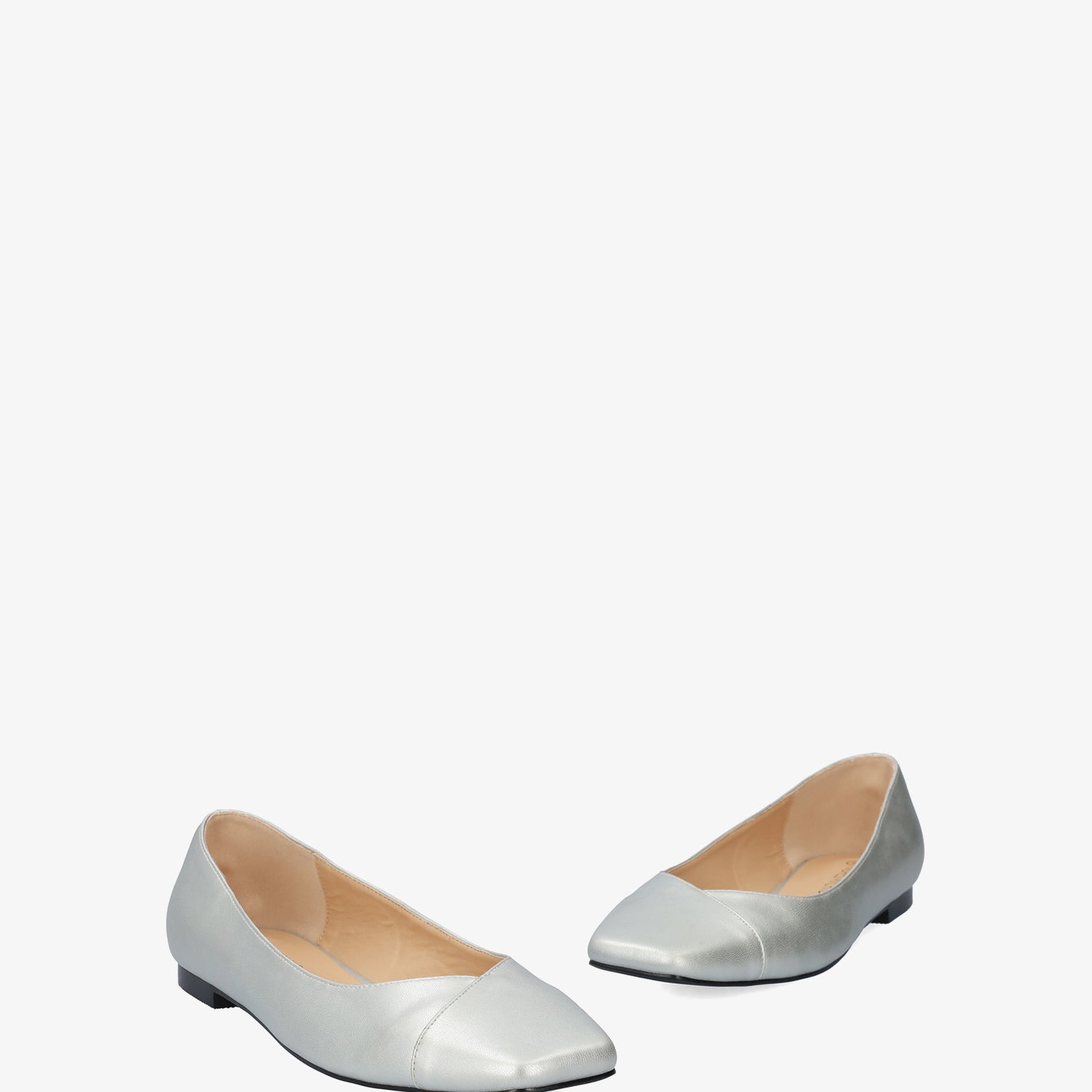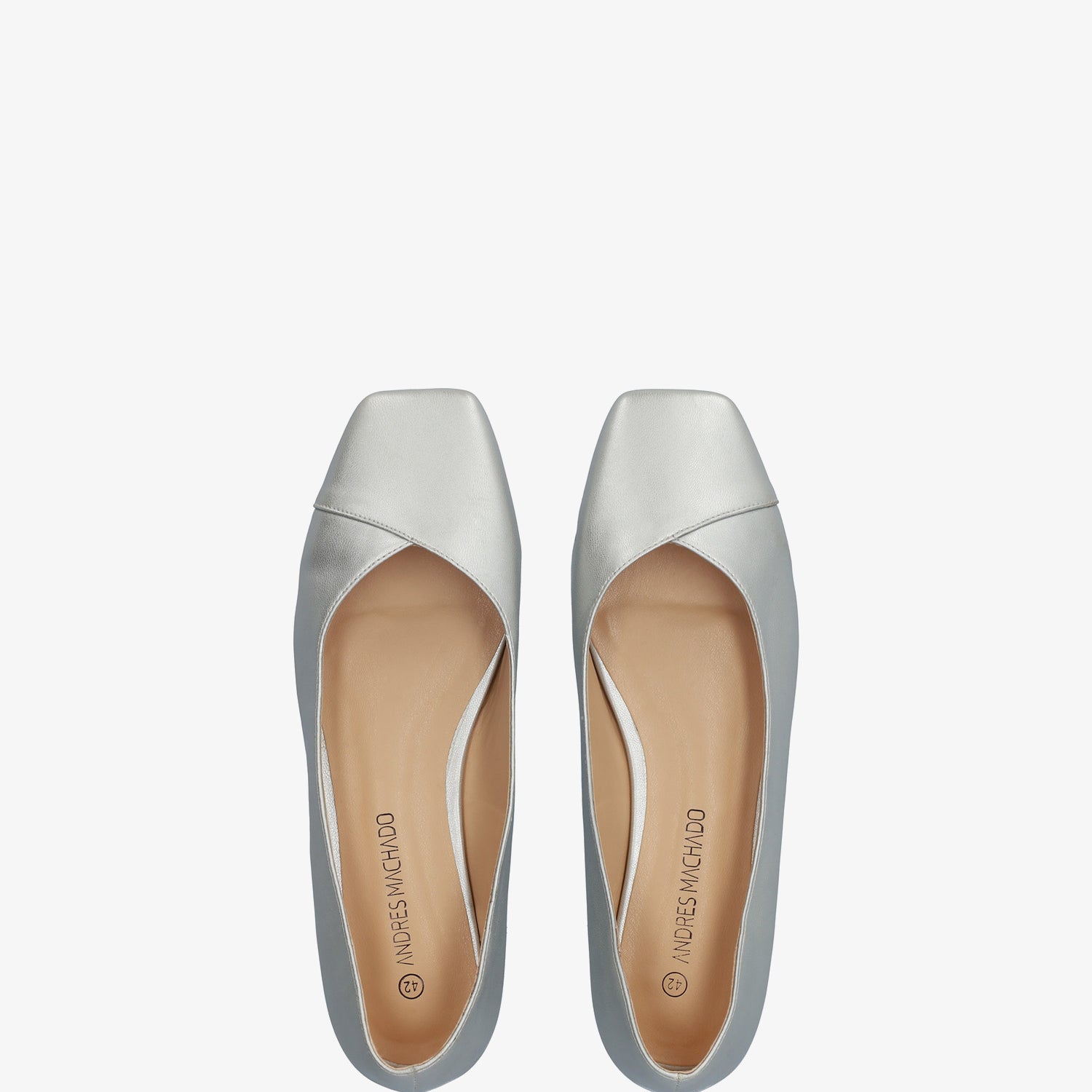 Płaskie baleriny w delikatnym srebrnym kolorze. Projekt z kwadratowym noskiem i ozdobnym przeszyciem krzyżykowym z pasującą nicią na palcach. Szeroki obcas odpowiedni dla większych rozmiarów od 42 do 45. Ten model jest zaniżony, dlatego zaleca się zamówienie rozmiaru o jeden większego niż zwykle.