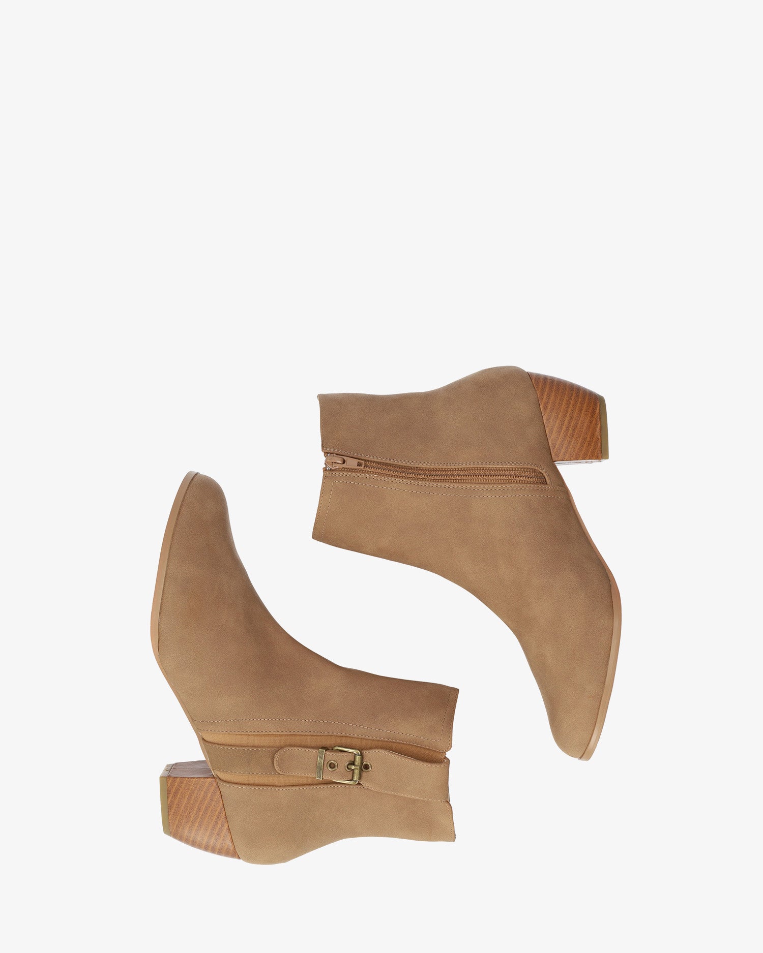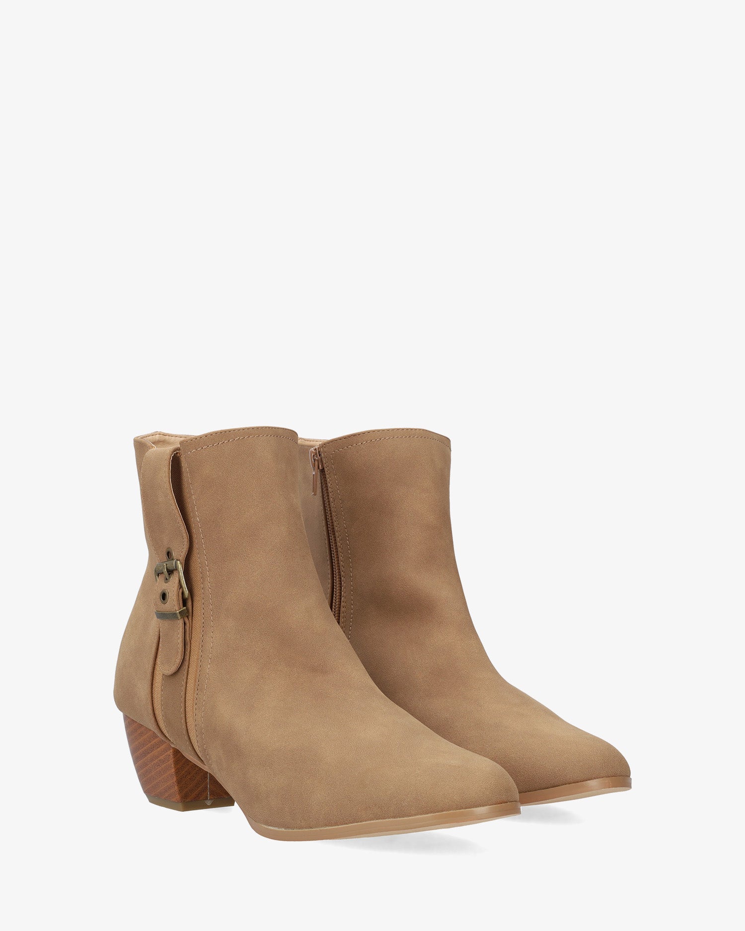 Brązowe buty ze skóry nubukowej. Szczegóły dopasowanego elastycznego paska po zewnętrznej stronie z ozdobną klamrą. Zapięcie na suwak po wewnętrznej stronie. Zaokrąglona końcówka. Obcas o szerokości 5 cm, imitujący laminowane drewno, odpowiedni dla małych rozmiarów od 32 do 35. Obcas o szerokości 5,5 cm odpowiedni dla dużych rozmiarów od 42 do 45.