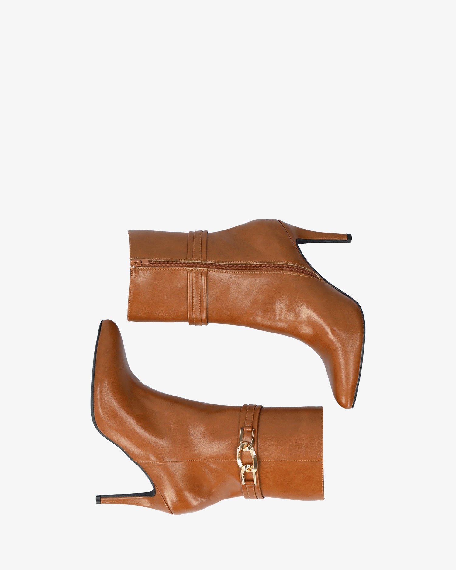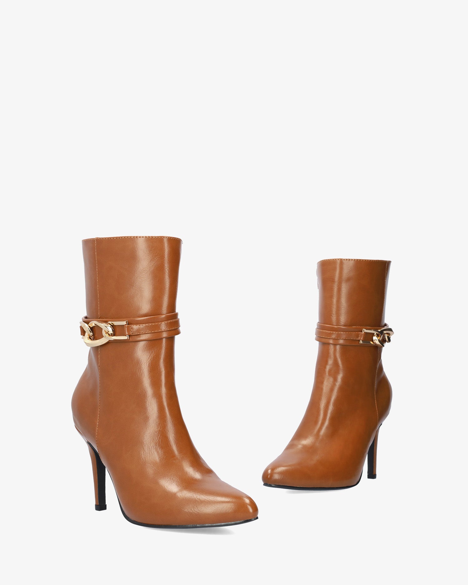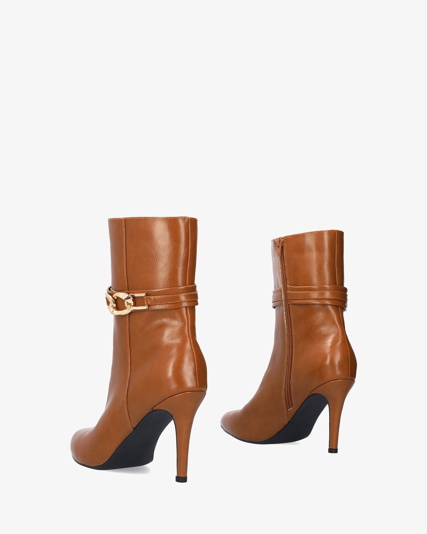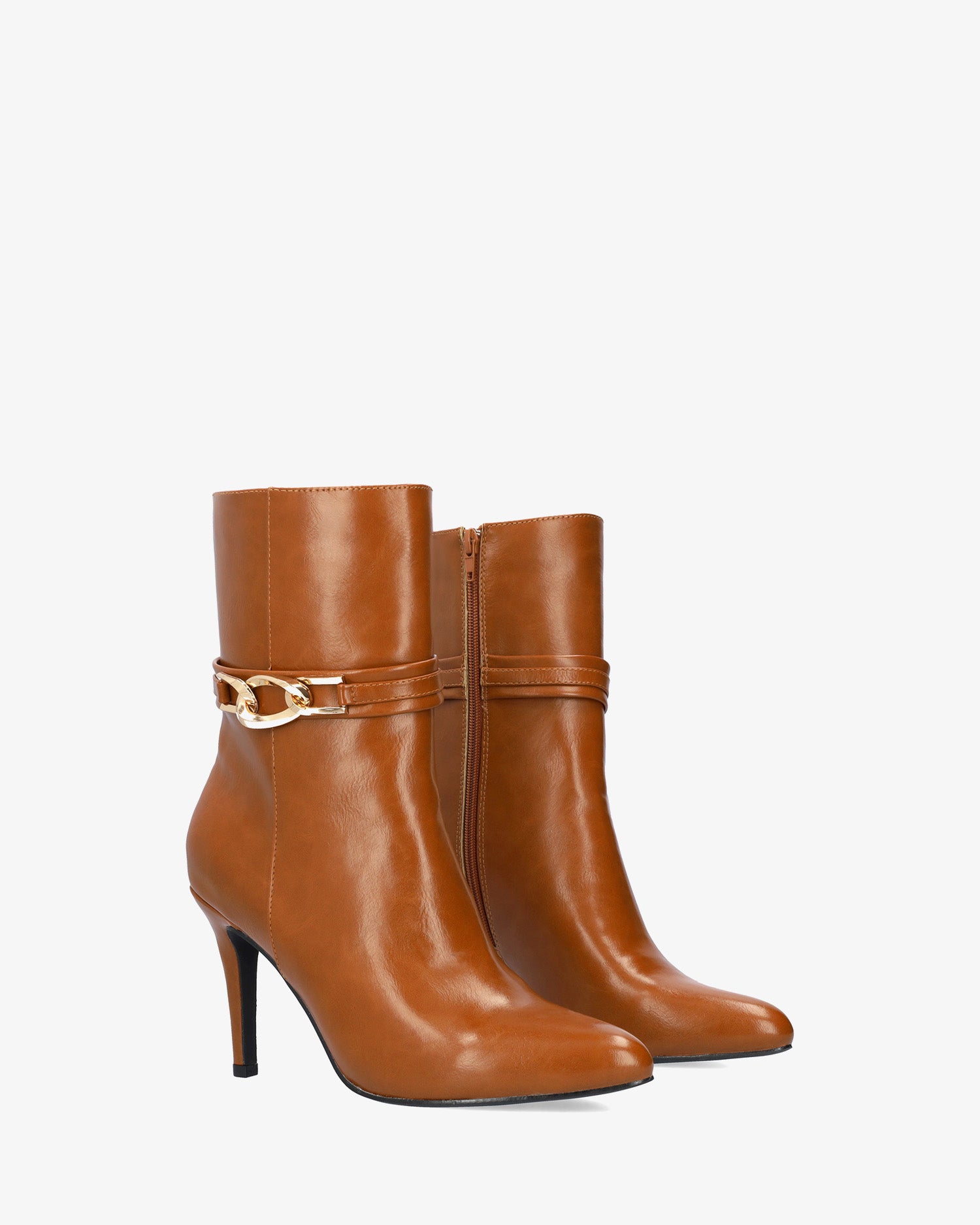 Wysokie botki w miękkim kolorze camelowym z zamkiem błyskawicznym po wewnętrznej stronie. Szeroki pasek wokół kostki ze złotą klamrą po zewnętrznej stronie. Wykończenie w najlepszym stylu. Obcas o wysokości 8,5 cm, cienki, wyściełany, odpowiedni dla małych rozmiarów od 32 do 35. Obcas o wysokości 9,5 cm odpowiedni dla dużych rozmiarów od 42 do 45.