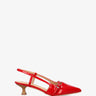 Czerwone, lakierowane buty na obcasie typu kaczuszka. Elegancki fason z odkrytym tyłem, spiczastym noskiem i metalową klamrą na pasku ze wstążką z przodu. Elastyczny pasek na kostkę w pasującym kolorze zapewnia dodatkowe wsparcie. Obcas imitujący drewno o wysokości 5 cm dla małych rozmiarów od 32 do 35 i obcas o wysokości 6 cm dla dużych rozmiarów od 42 do 45.