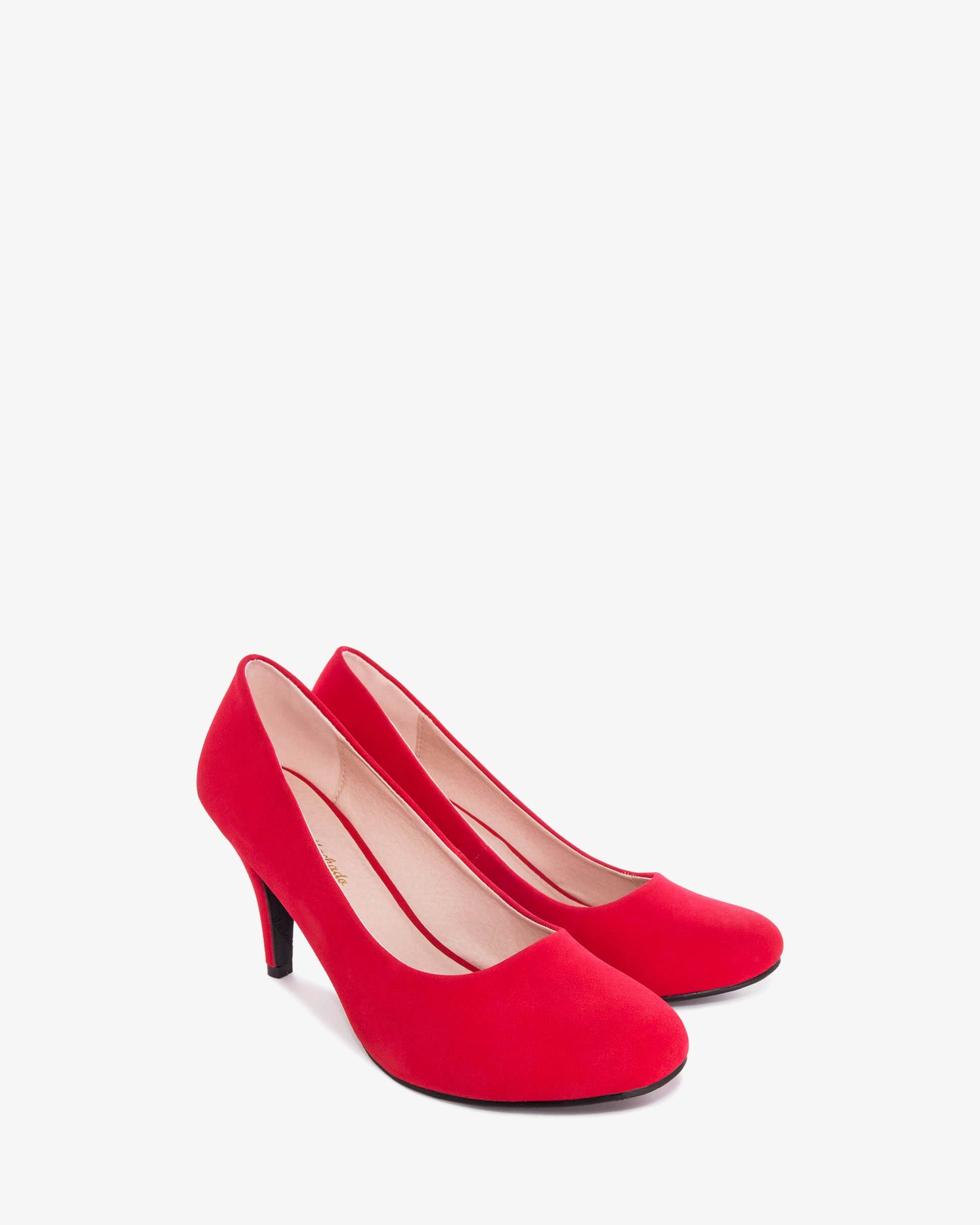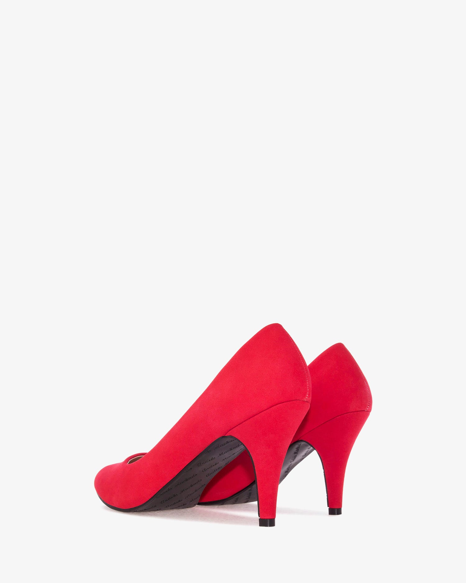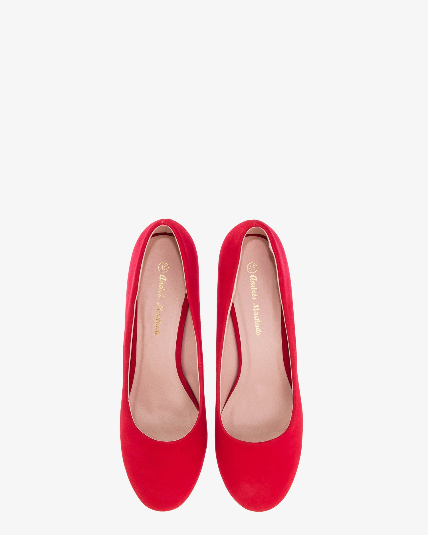 Oryginalne buty retro typu court z imitacji czerwonego nubuku. Bardzo wygodne kopyto z zaokrąglonym noskiem. Małe rozmiary od 32 do 35 z obcasem 9 cm. Rozmiary średnie od 36 do 41, obcas 9,5 cm. Rozmiary od 42 do 46, obcas 10 cm. Ten model jest zaniżony, zaleca się wybór rozmiaru o jeden większego niż zwykle.