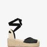 Sandały na koturnie, wykonane z czarnej tkaniny przypominającej rafię. Fason z częściowo odkrytym tyłem i paskiem nici przyszytym do pięty. Okrągły, zamknięty nosek, wzmocniony przeszyciami z przodu. Zapięcie na szerokie, czarne sznurowadła przy kostce. Koturny i platforma z przodu wykonane z juty. Koturn o wysokości 7 cm i platforma o wysokości 3 cm dla małych rozmiarów od 32 do 35. Koturn o wysokości 7 cm i platforma o wysokości 3 cm dla dużych rozmiarów od 42 do 45.