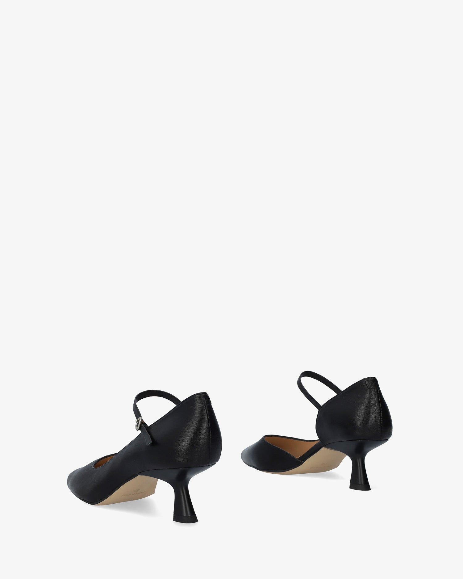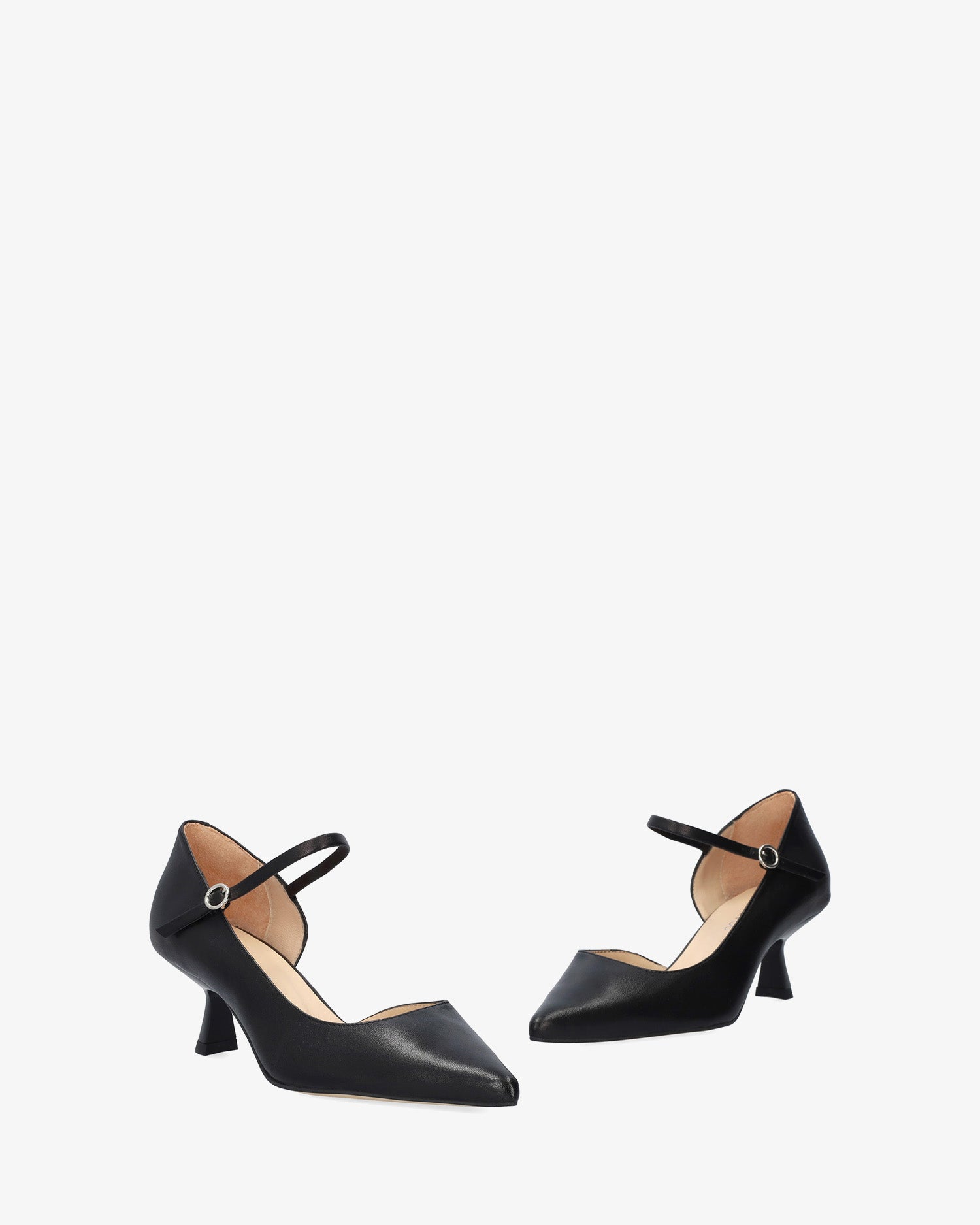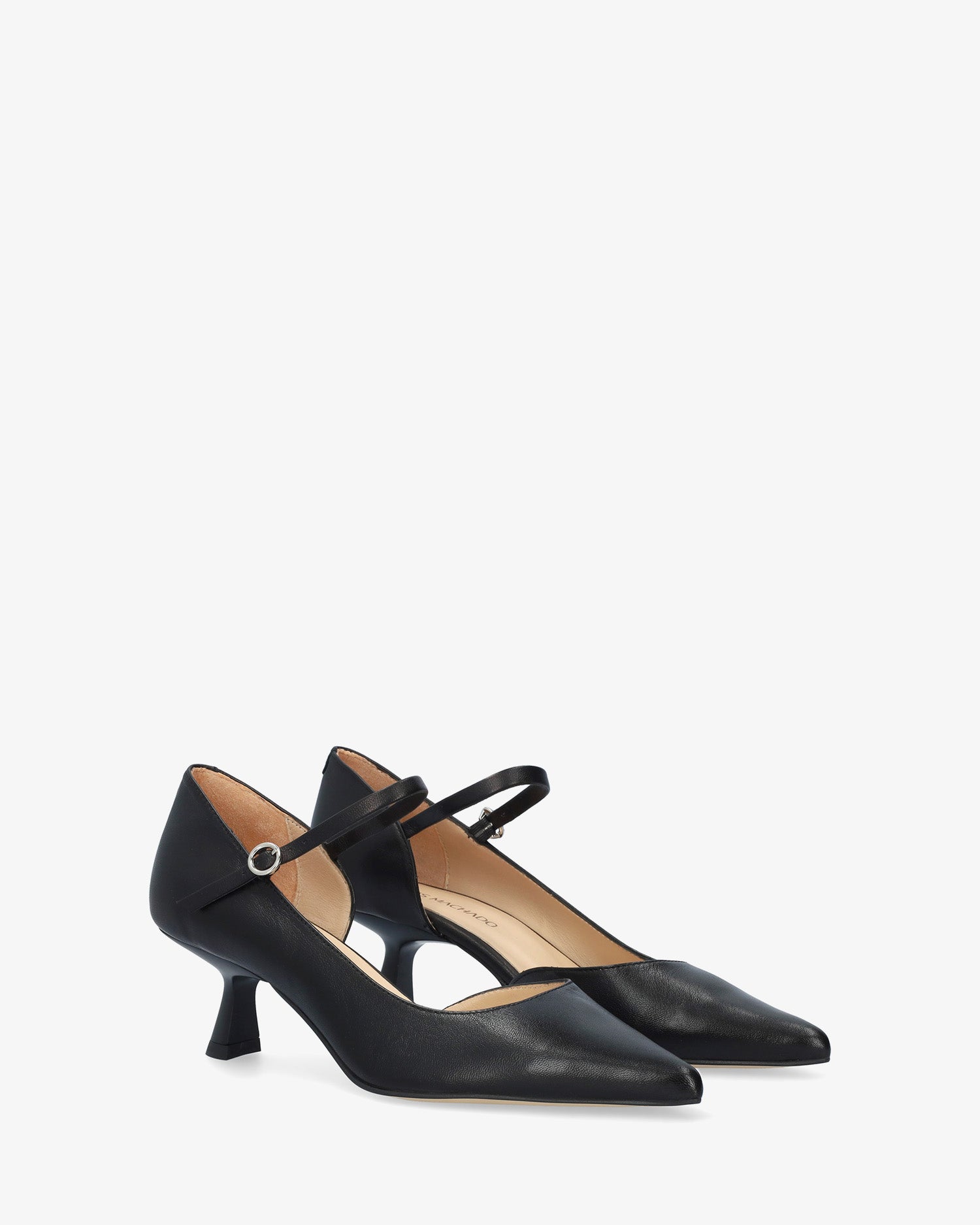 Skórzane czółenka na obcasie z noskiem w szpic i pasującą klamrą z boku. Obcas typu „kaczuszek” o wysokości 5,5 cm dla małych rozmiarów, od 32 do 35, oraz obcas o wysokości 6 cm dla dużych rozmiarów, od 42 do 45. Wyprodukowano w Hiszpanii.