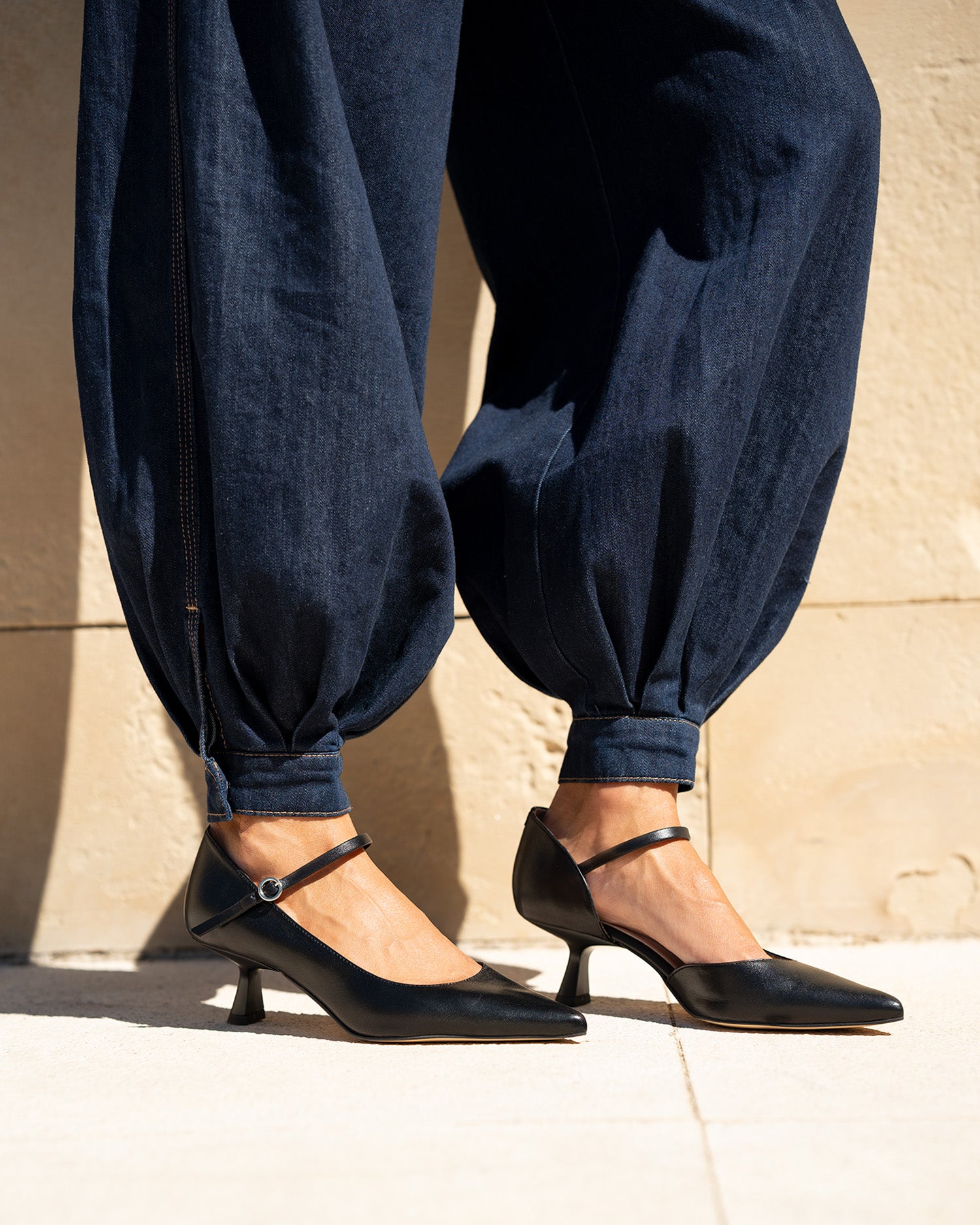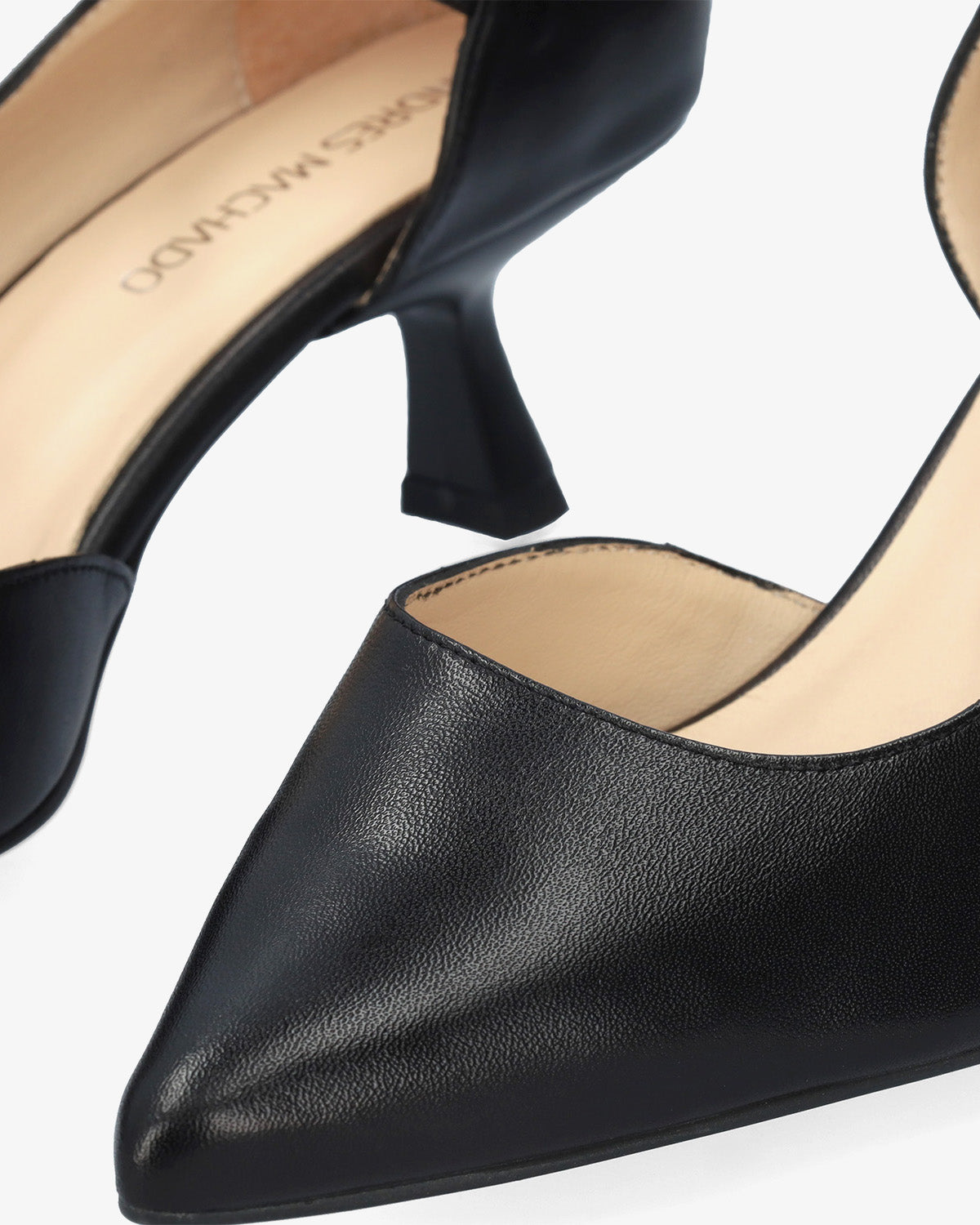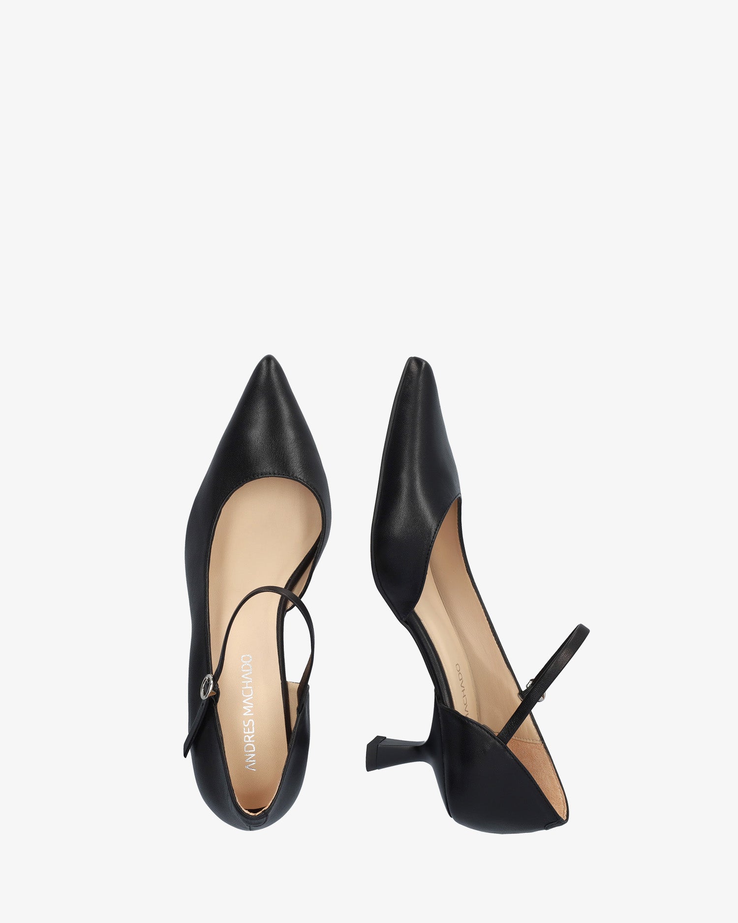 Skórzane czółenka na obcasie z noskiem w szpic i pasującą klamrą z boku. Obcas typu „kaczuszek” o wysokości 5,5 cm dla małych rozmiarów, od 32 do 35, oraz obcas o wysokości 6 cm dla dużych rozmiarów, od 42 do 45. Wyprodukowano w Hiszpanii.